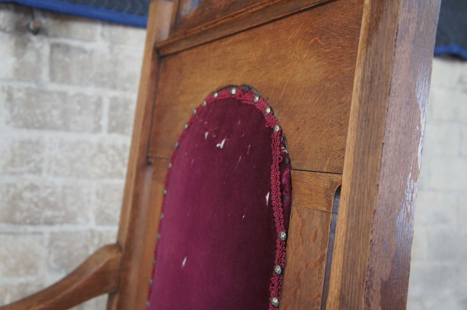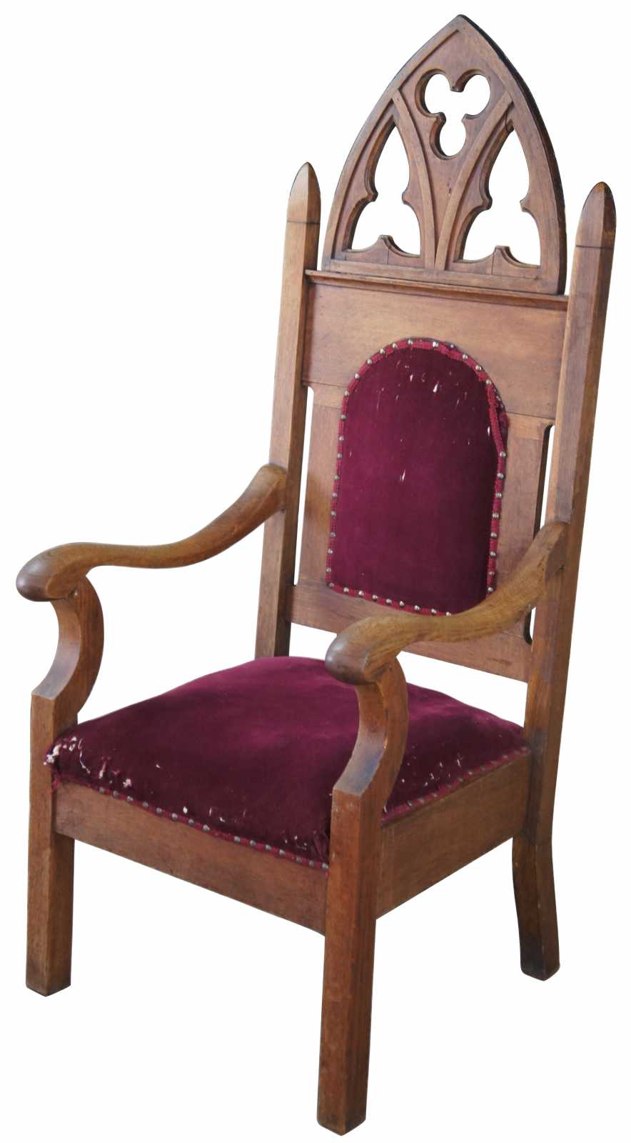 Antique Victorian Gothic Revival Bishops throne chair. Made of oak, featuring serpentine arms and arched back with carved details. Marked Three Pillars, No. 170