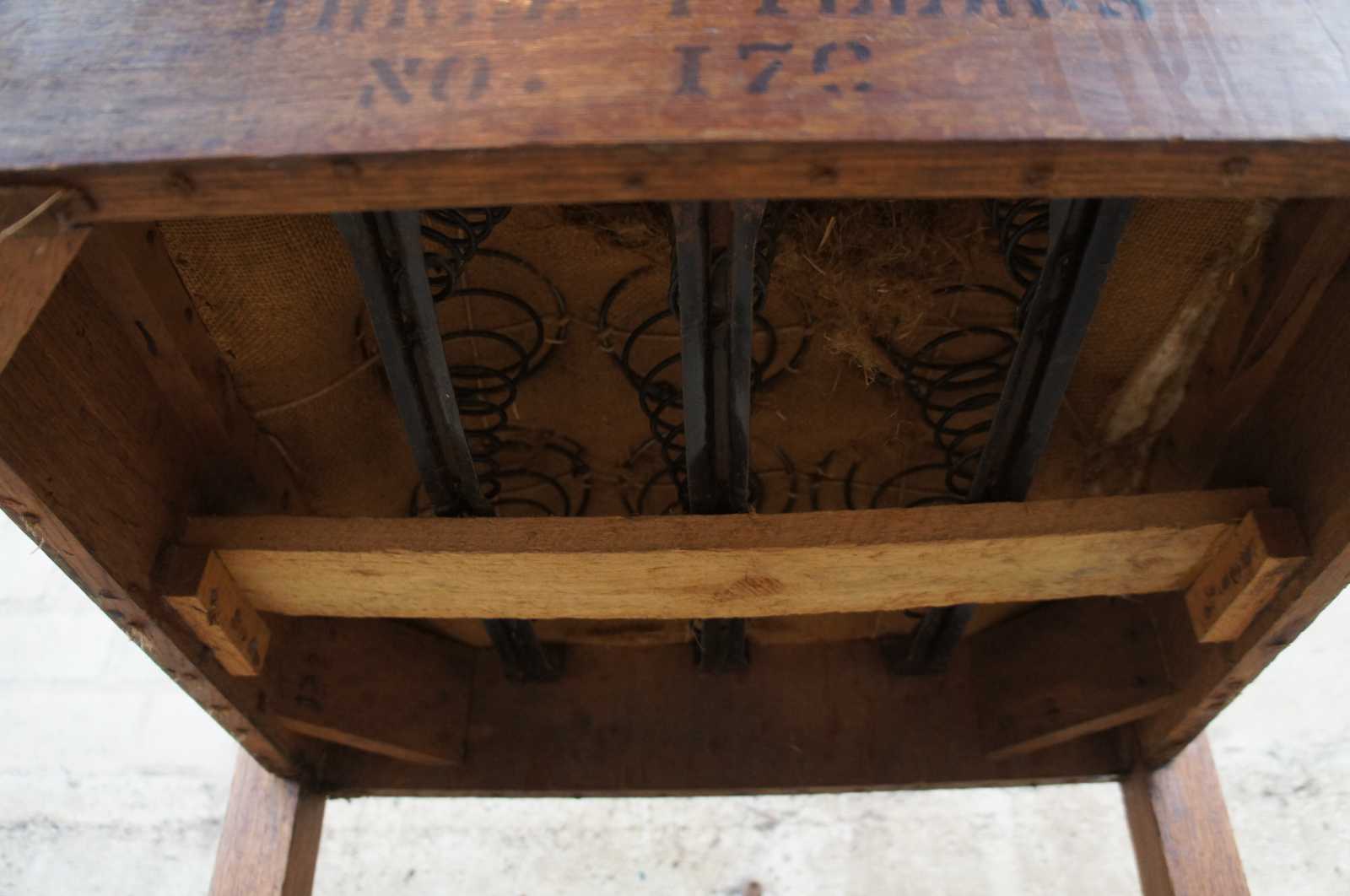 Fair condition, wear and distressing commensurate with age and use, some finish loss, could use reupholstered, smells of being stored in barn.