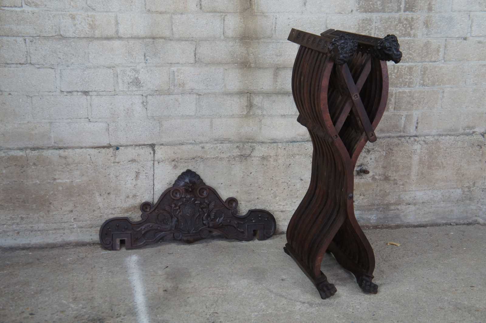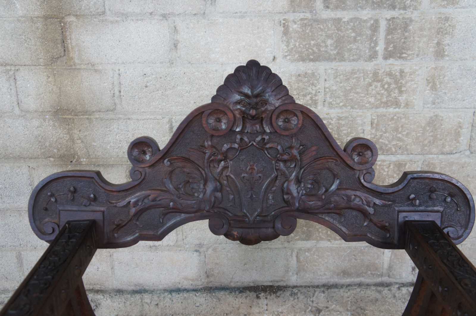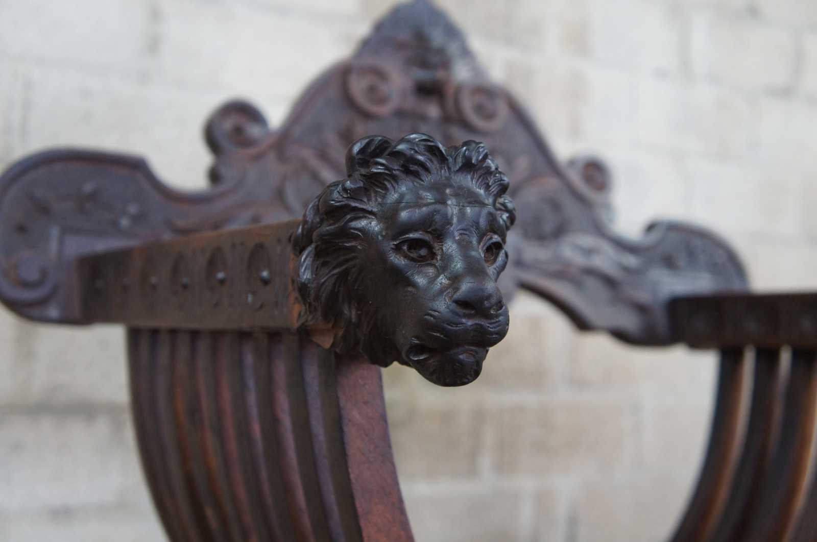 Antique Italian Renaissance Revival Savonarola Walnut Campaign arm chair. Features an X frame with lion head arms between an arched back with a crest flanked by griffons / serpents / dragons and a Northwind face. Includes caved floral detail, medallions and paw feet.
