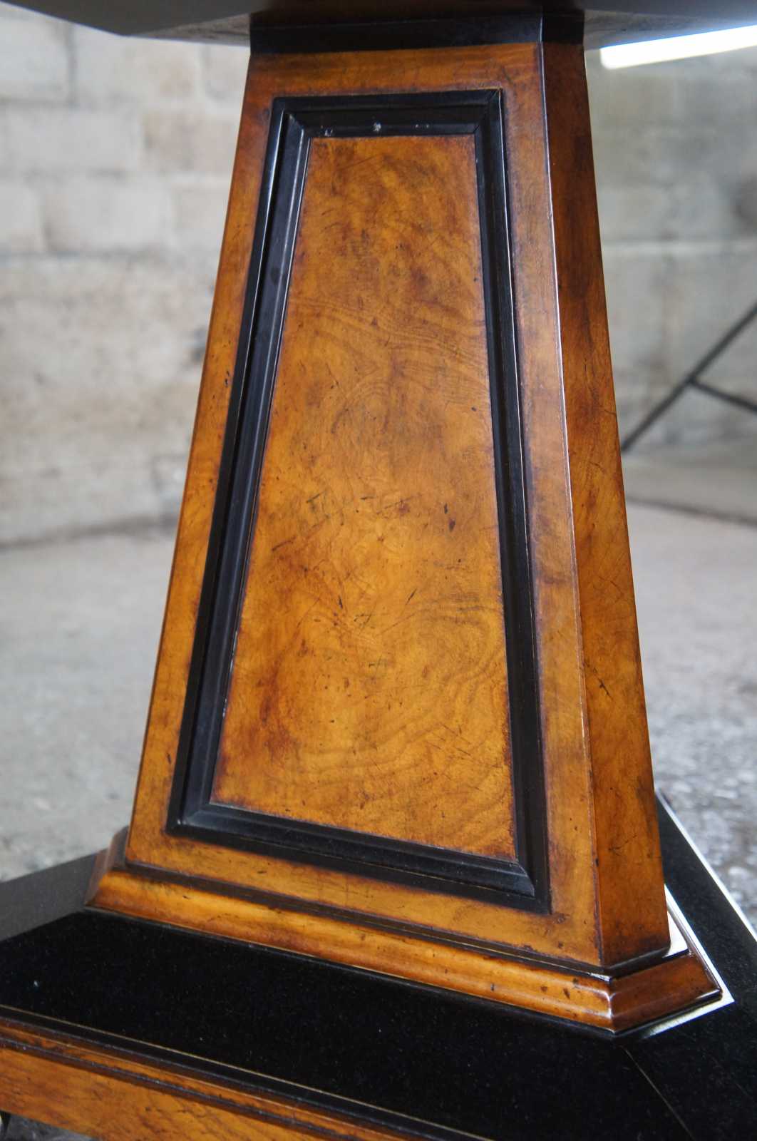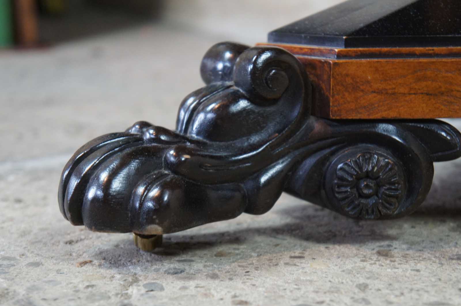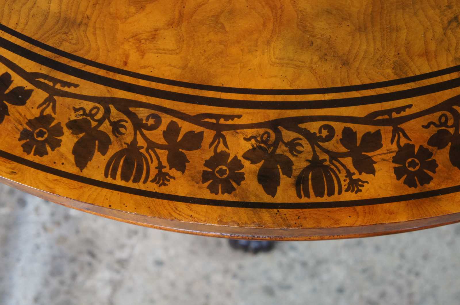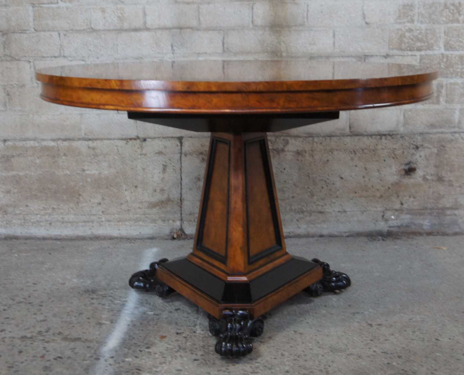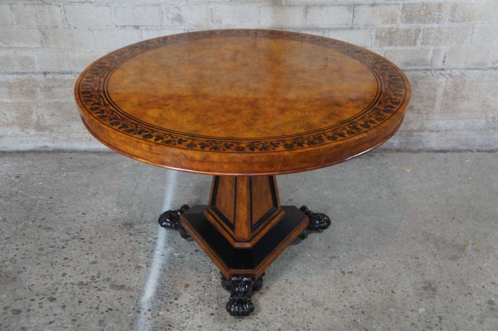 The Regency centre table, a rare piece, was designed in circular or round burr ash by George Bullock. Adorning the inlaid top is a broad border of ebonized floral vines within ebonized bands. The frieze follows suit with ebonized mouldings above a tapering, triangular support with raised ebonized mouldings. A moulded plinth with dark ebonized lion's paw feet is carved with floral scrolls and inset with brass casters.