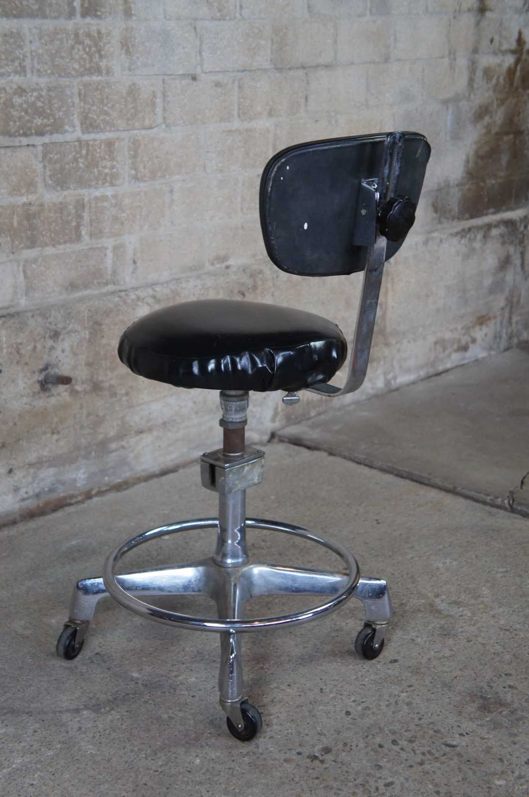 Mid century industrial office, shop or drafting chair. Made of steel featuring black leather upholstery and rolling swivel feet.