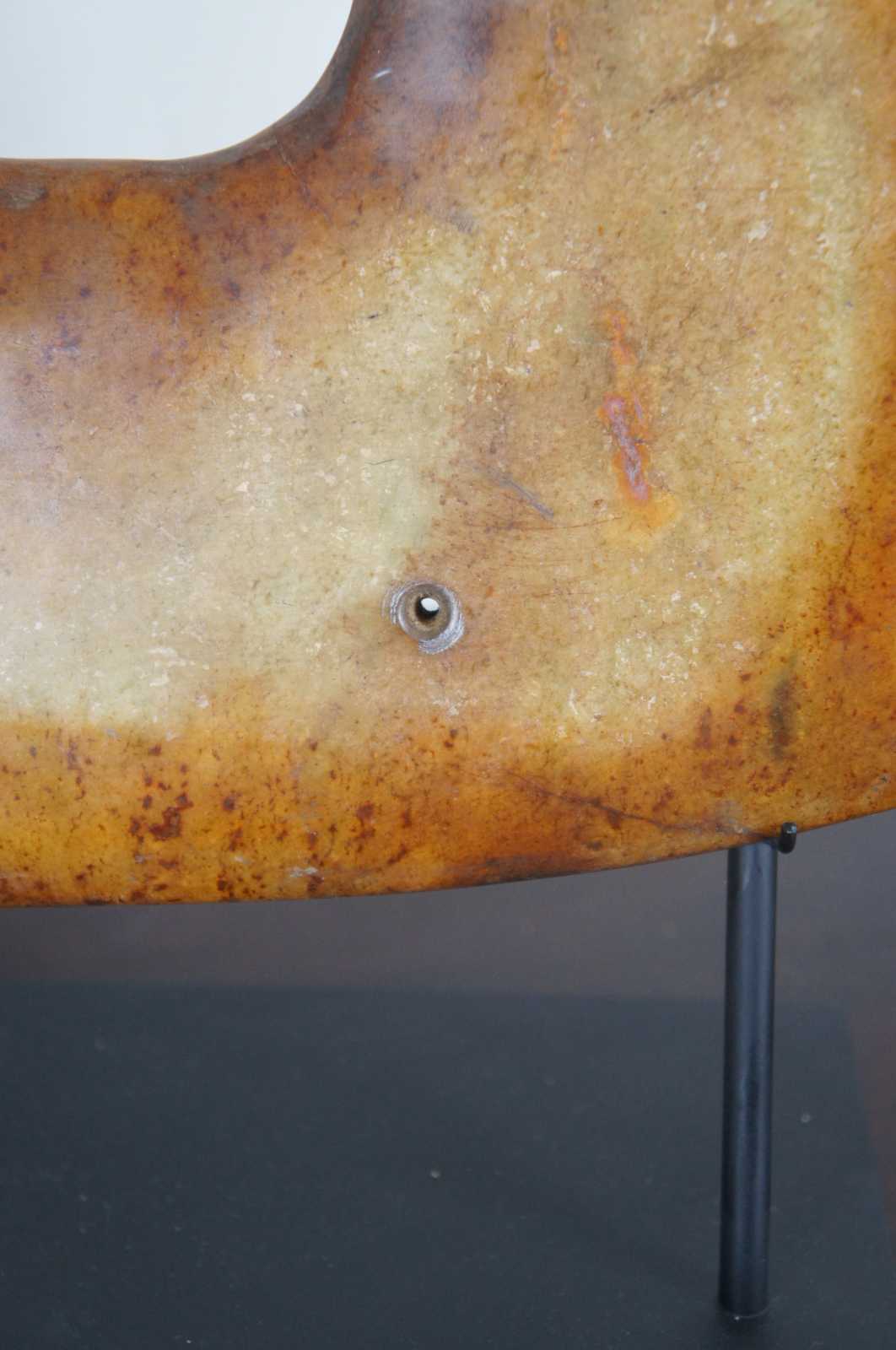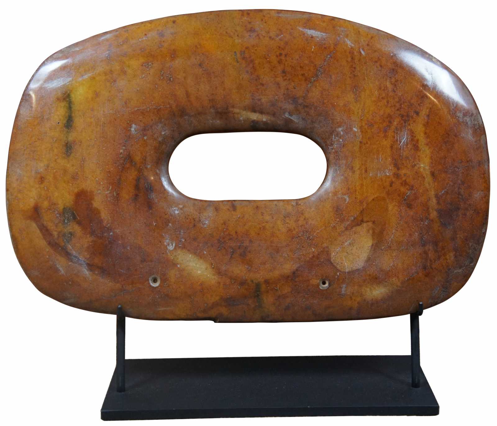 Pair of orange/brown stone carved bi-discs. The bi or pi disc is a flat disc with a circular hole in the center. The discs date back to Neolithic times (5,000-2,000 bc). Archeologists speculate that the round shape of the disc might symbolise the power of the sun, the heavens or the afterlife. It was used in daily life as a symbol of rank and status. This unique pair is oblong shaped and rest upon 2 iron stands.