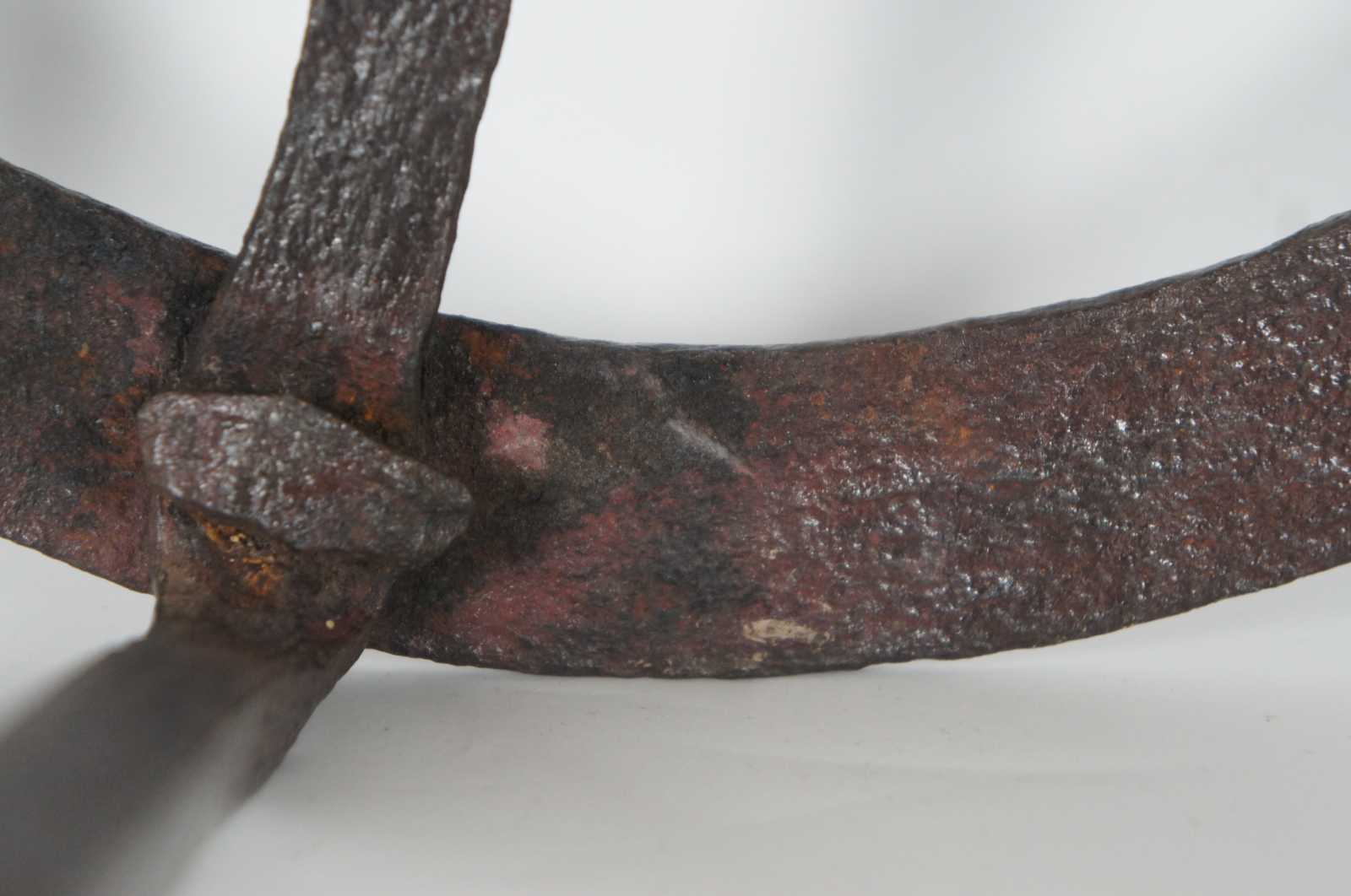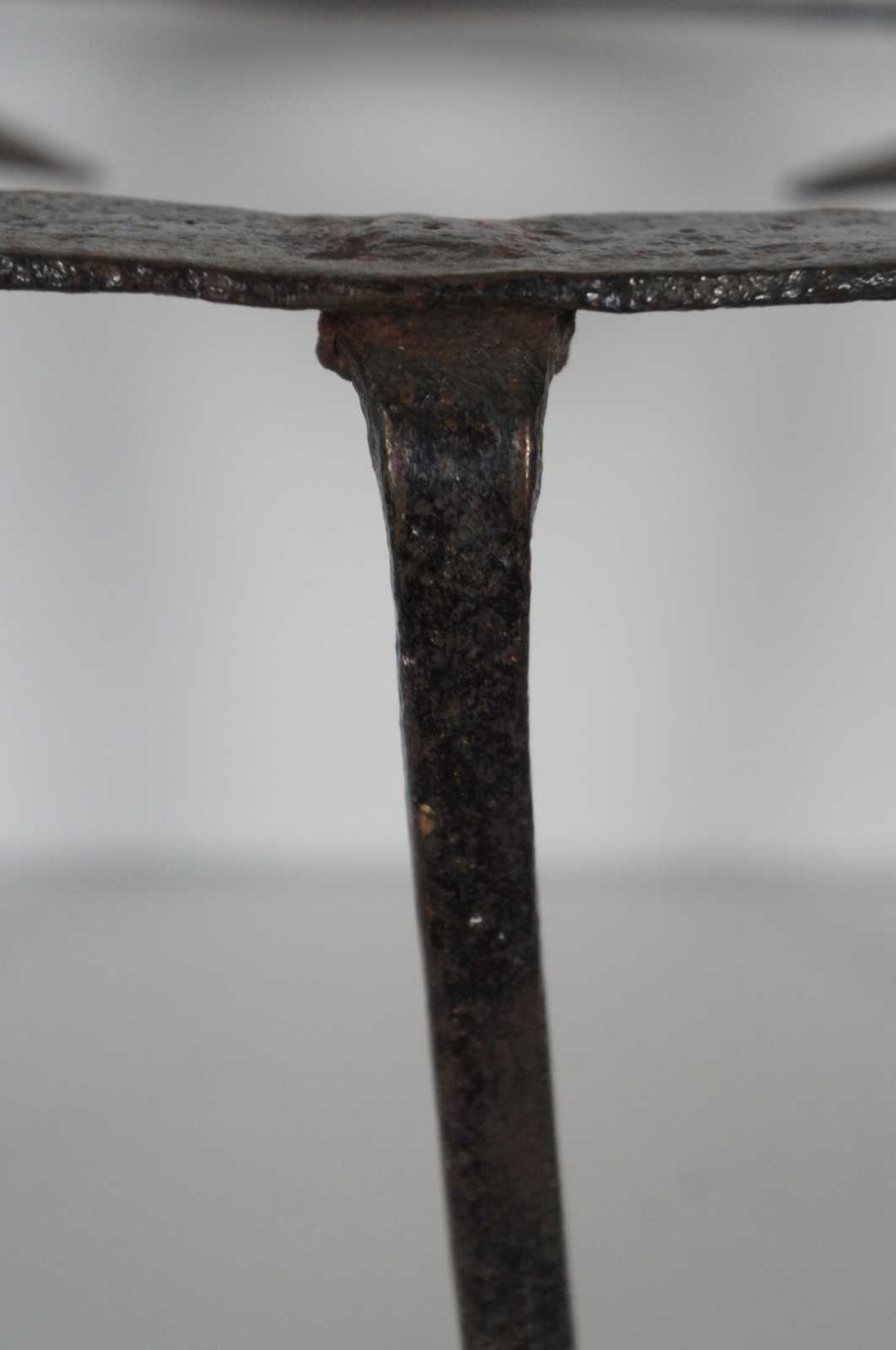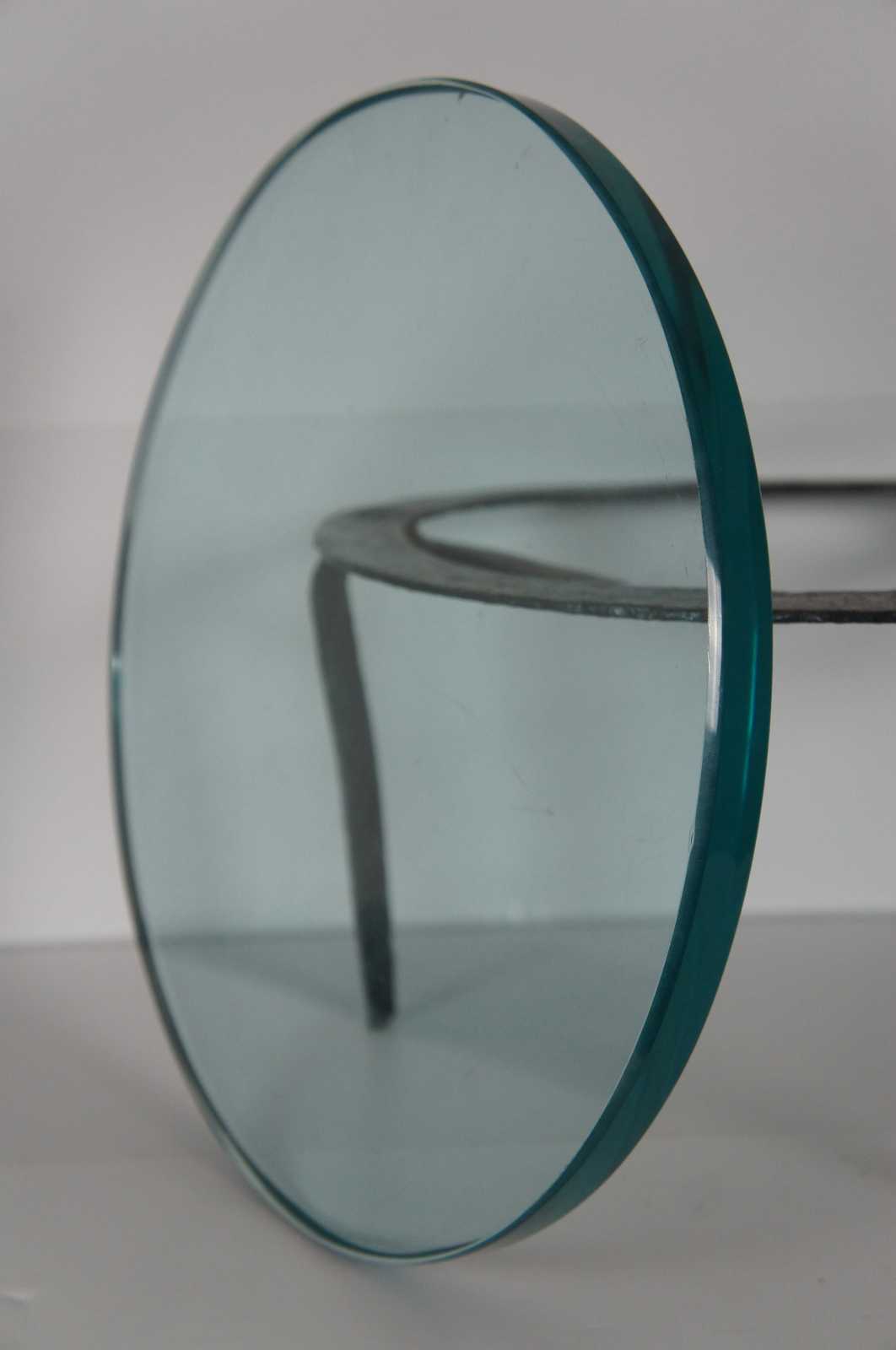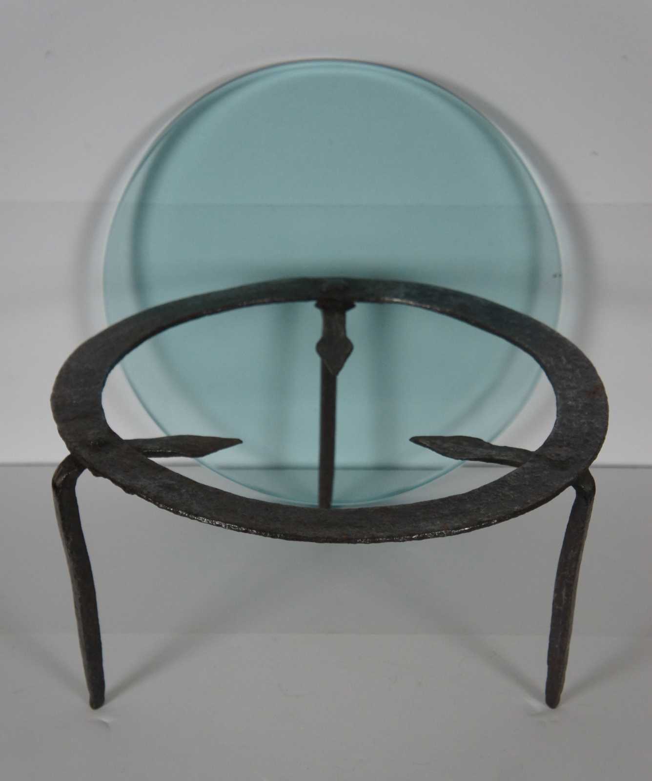 Round 18th Century antique cast iron fireplace pot stand or trivet with added contemporary glass top for use as a plant stand or fire side table.
