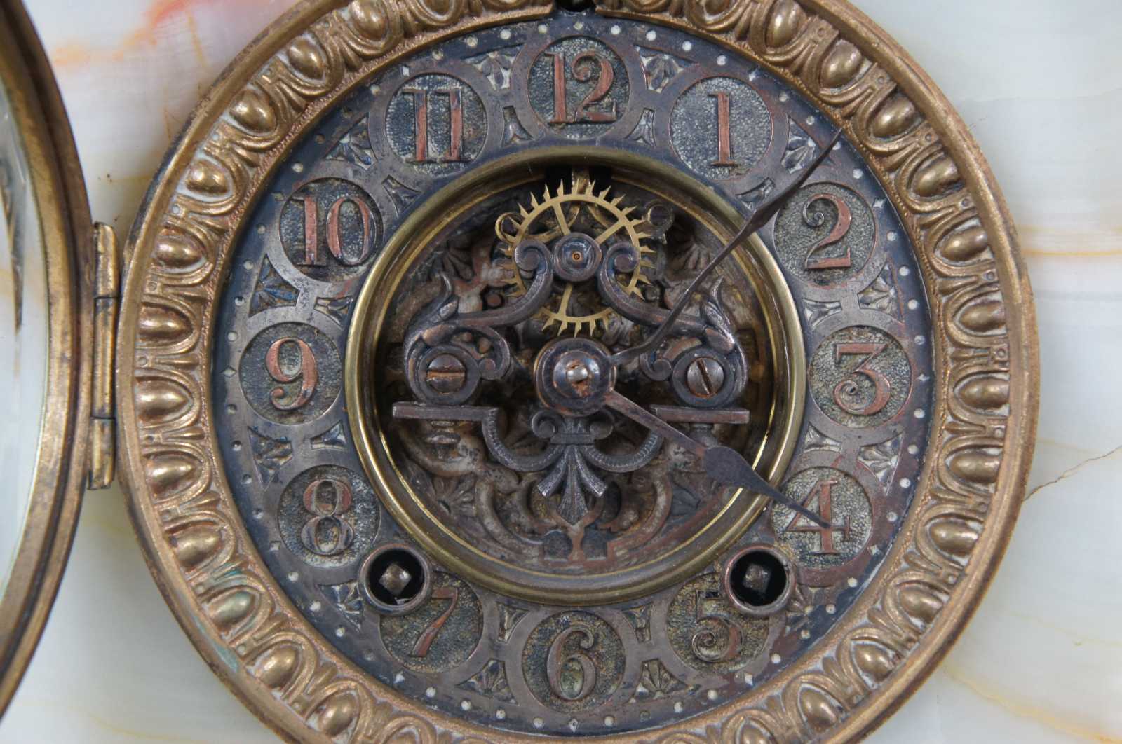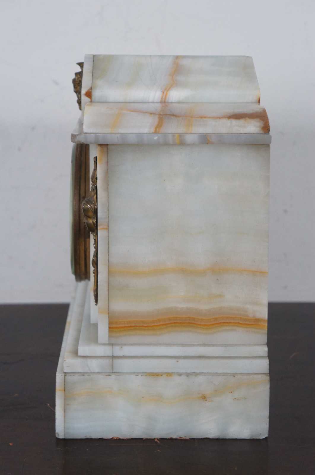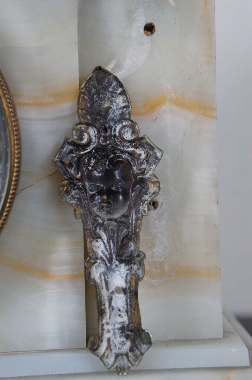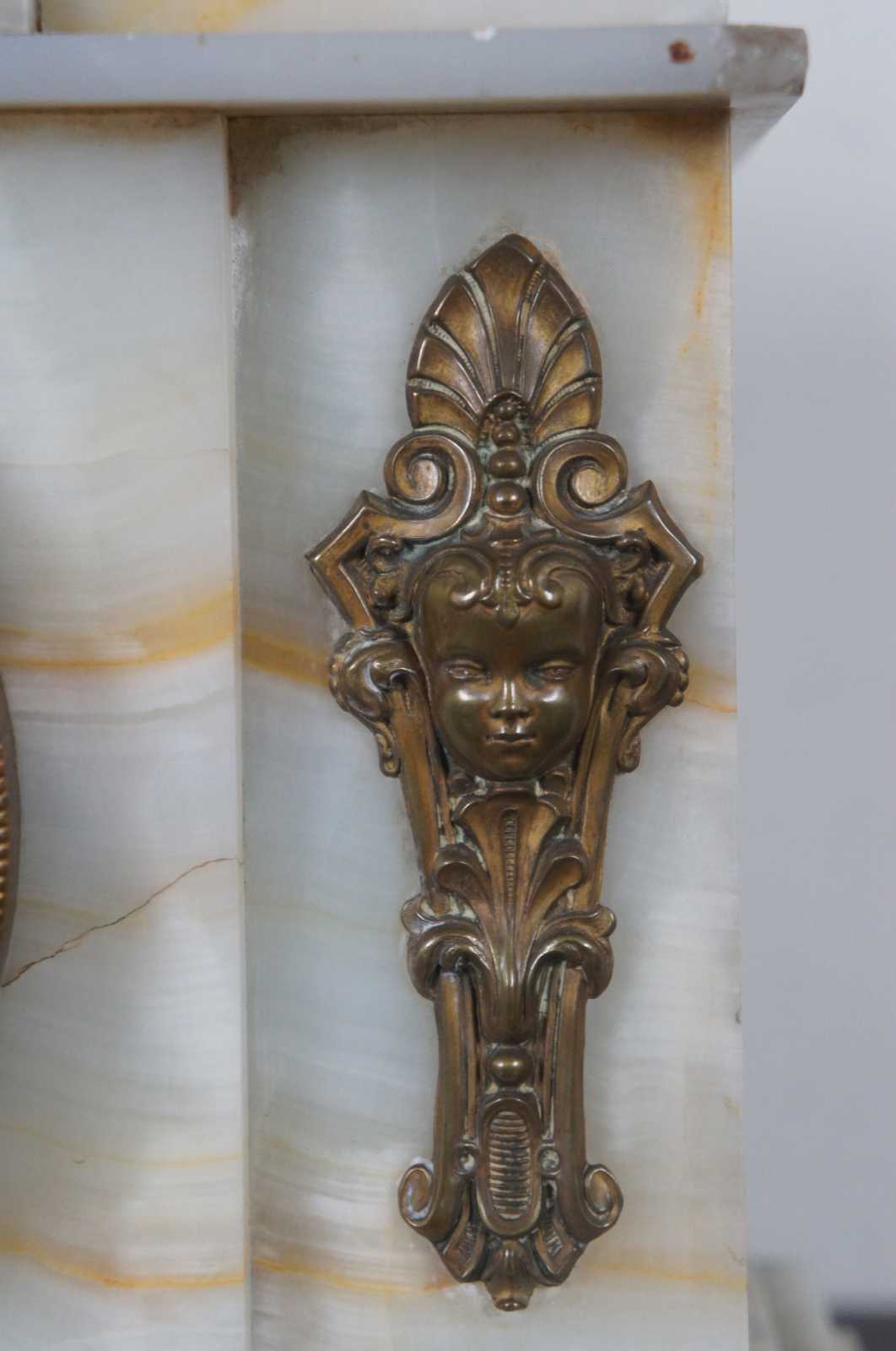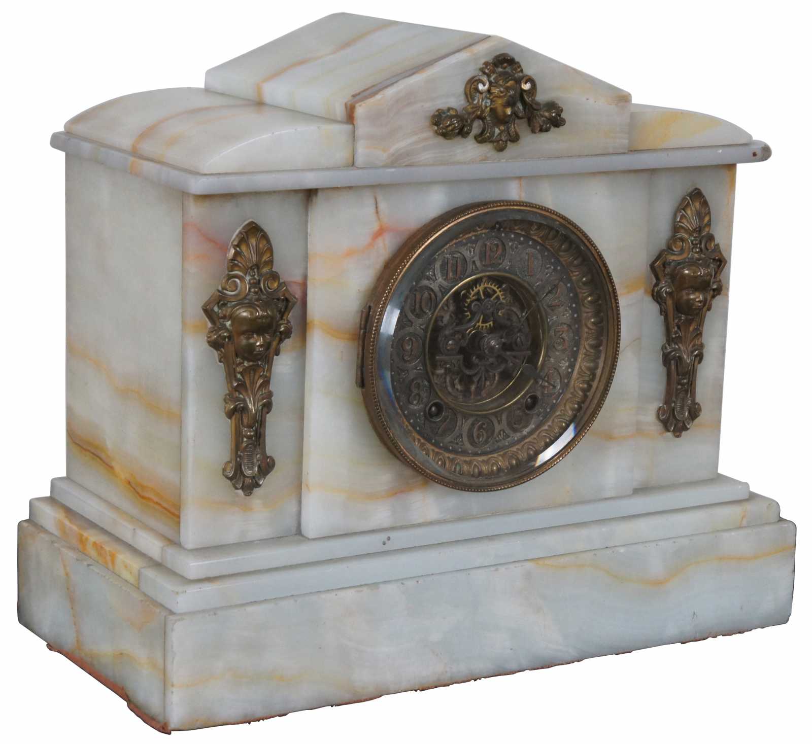 Antique Ansonia white onyx mantel clock with brass face and ormolu caryatid mounts. Features open escapement