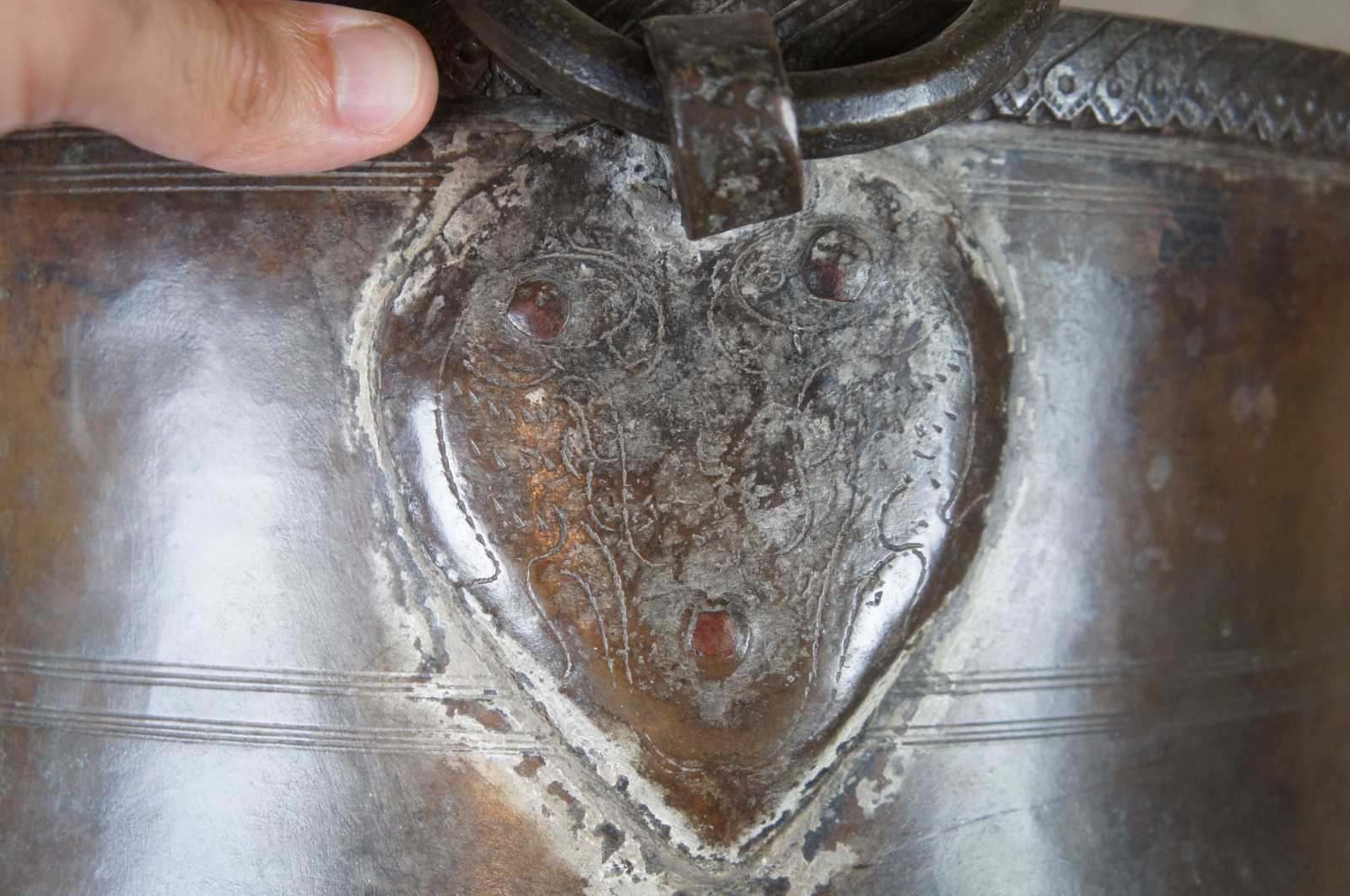 A monumental hammered copper vessel or water storage pot. Round with tapered base and Iron ring handles. Features a chased iron rim.