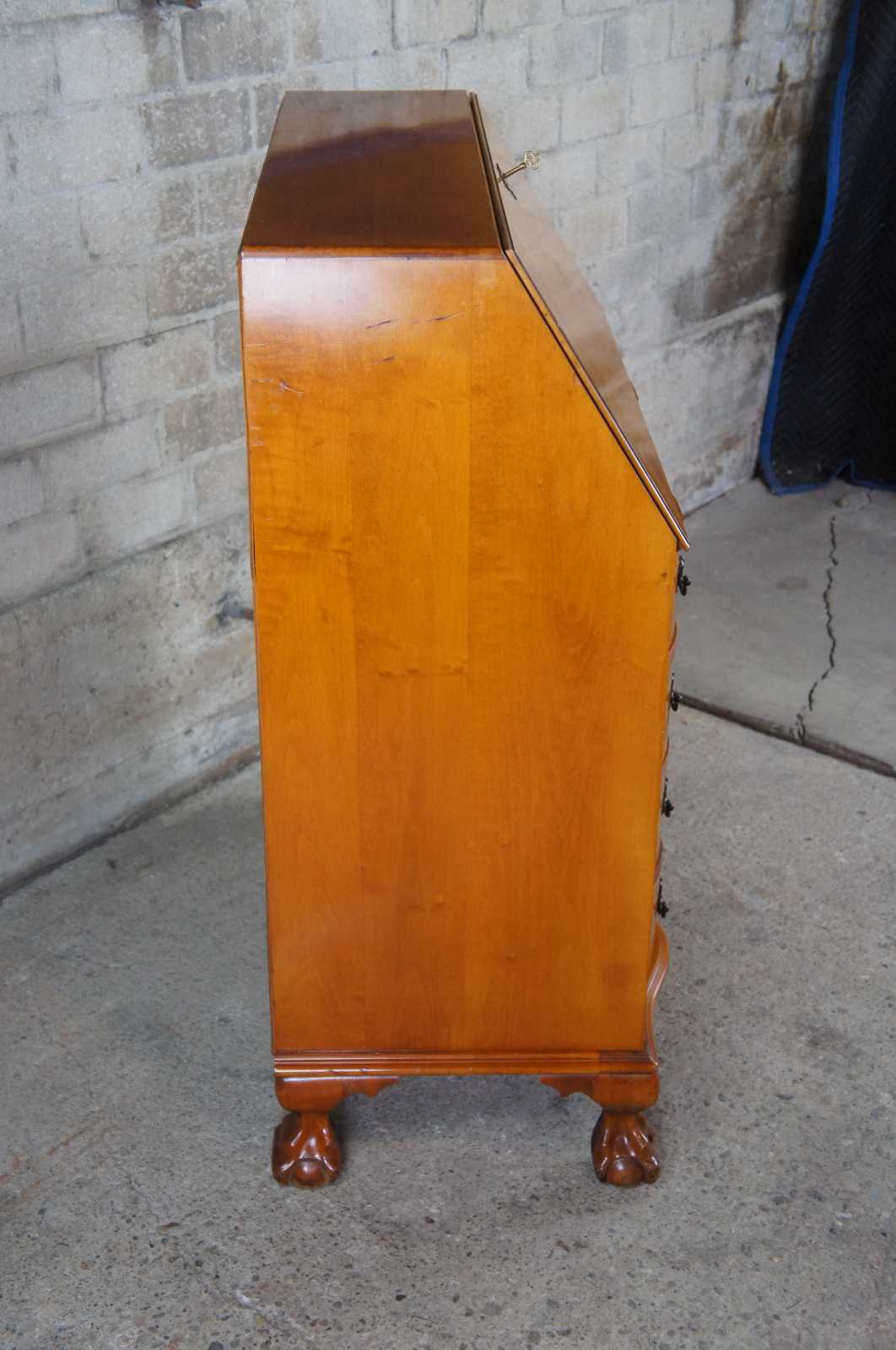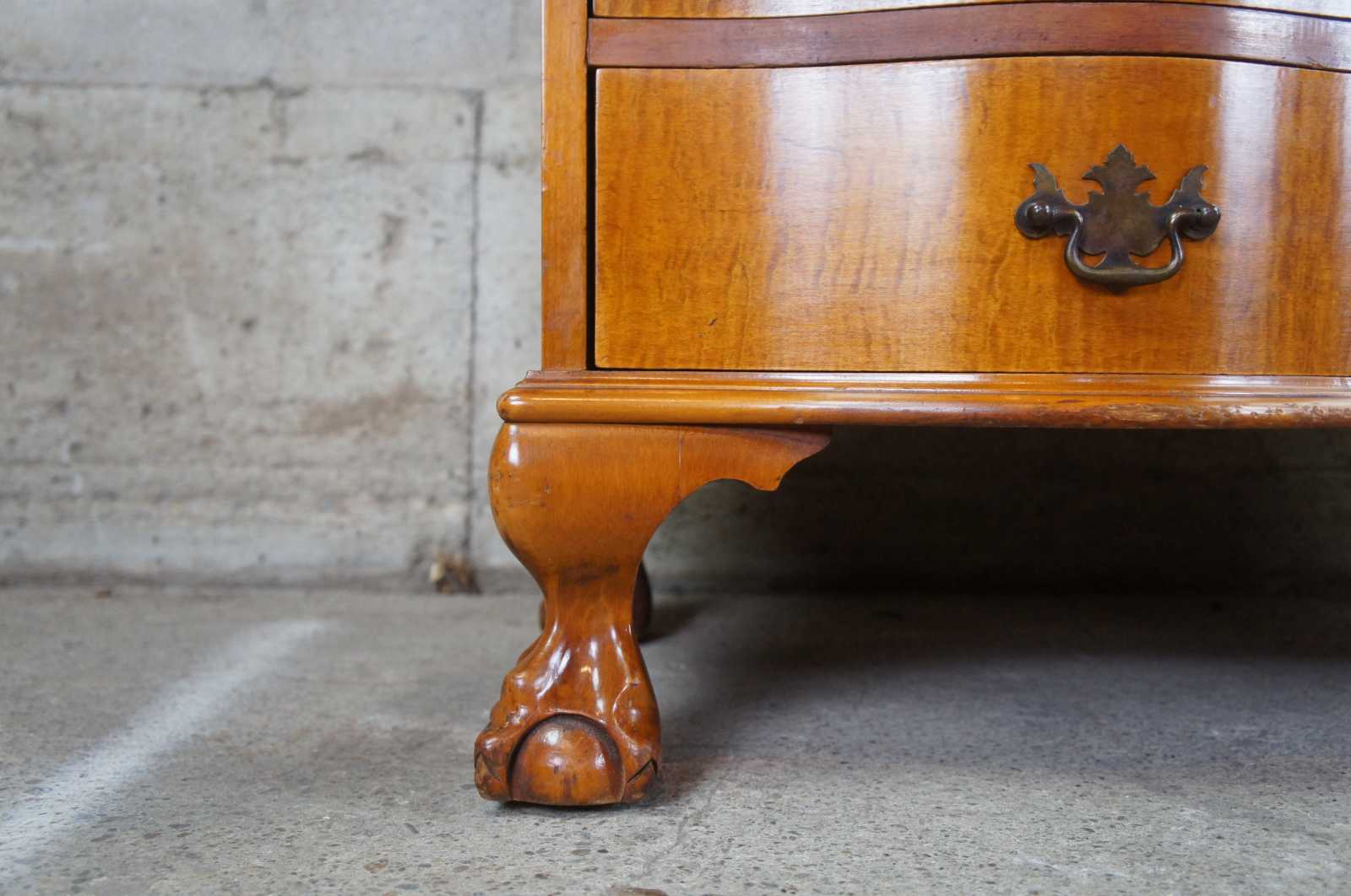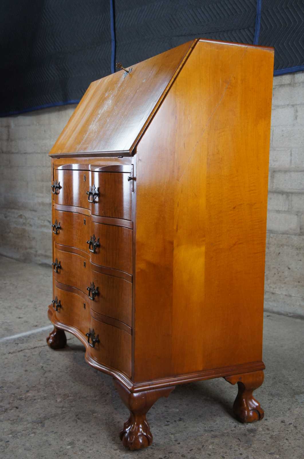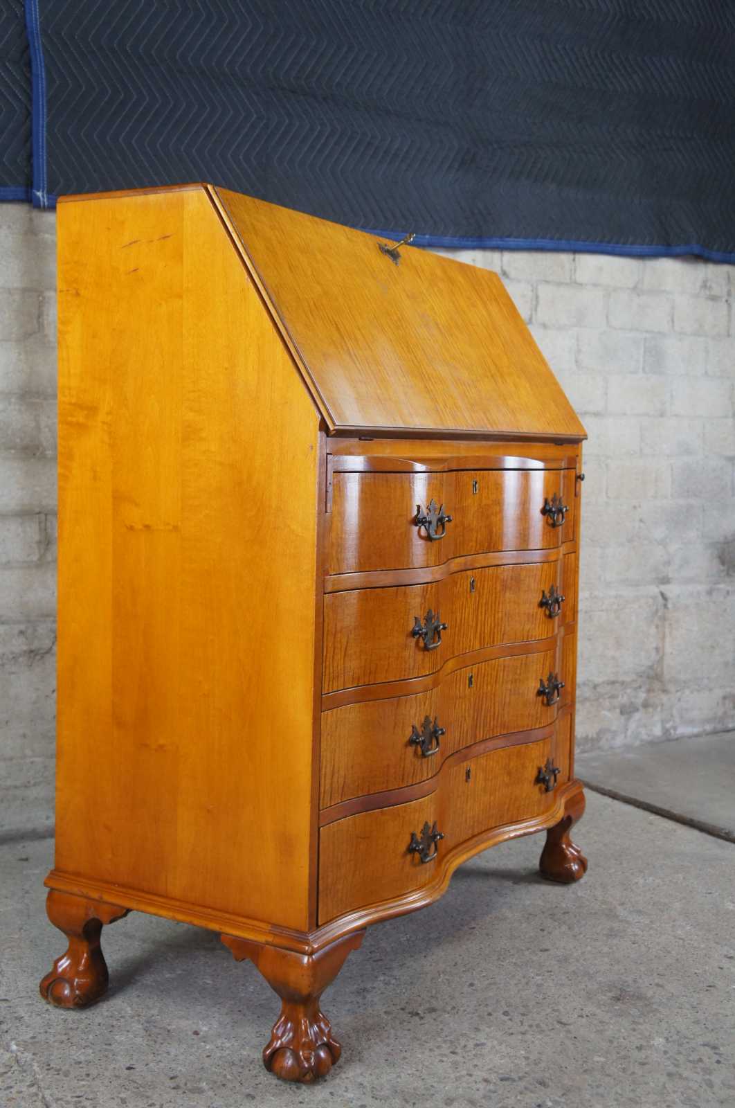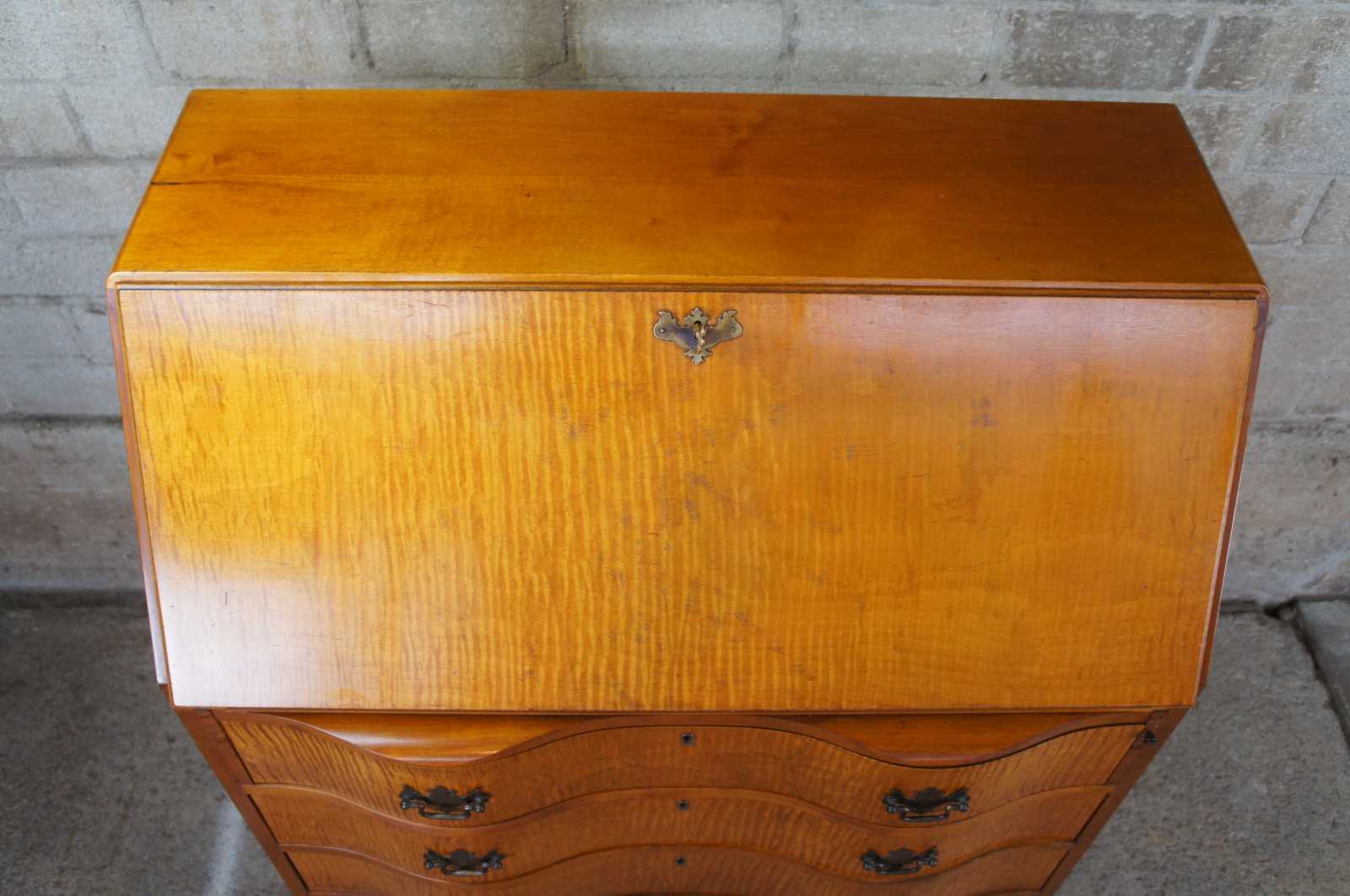 Antique secretary or writing desk. Made from tiger maple featuring a flip top that opens to multiple drawers, file storage and hidden compartments. The dresser is constructed with an oxbow front with four drawers and federal style hardware over ball and claw feet.