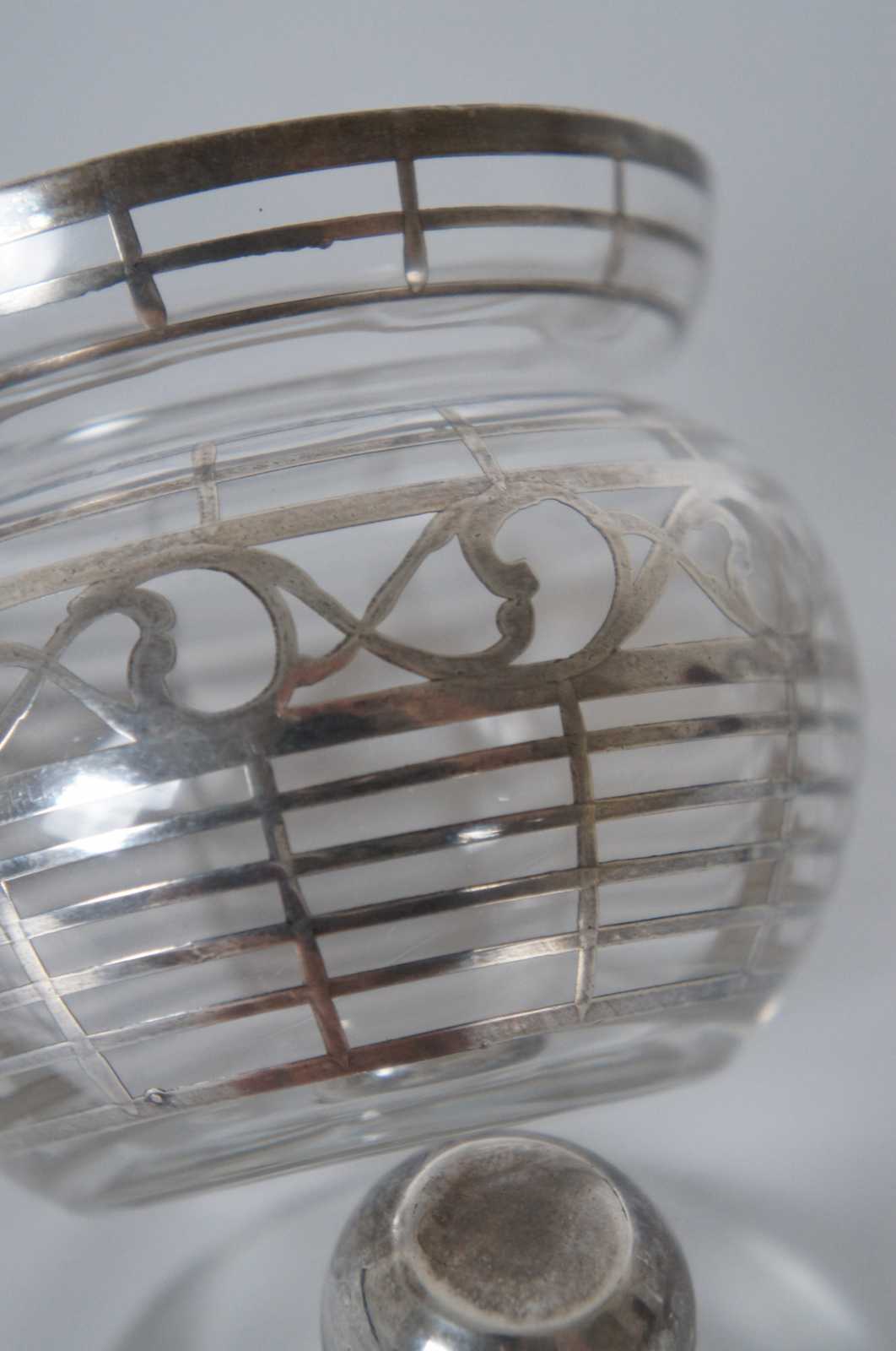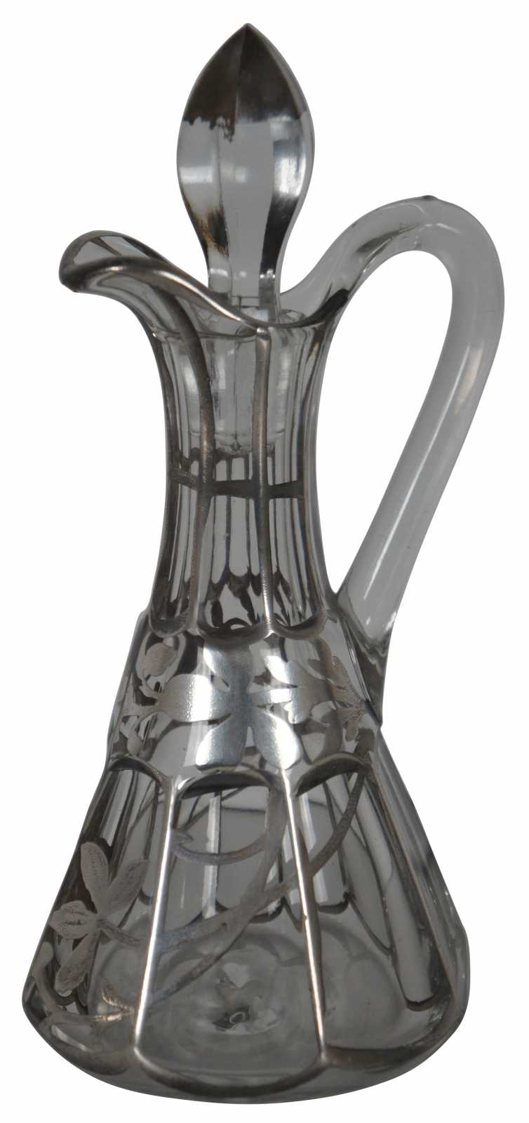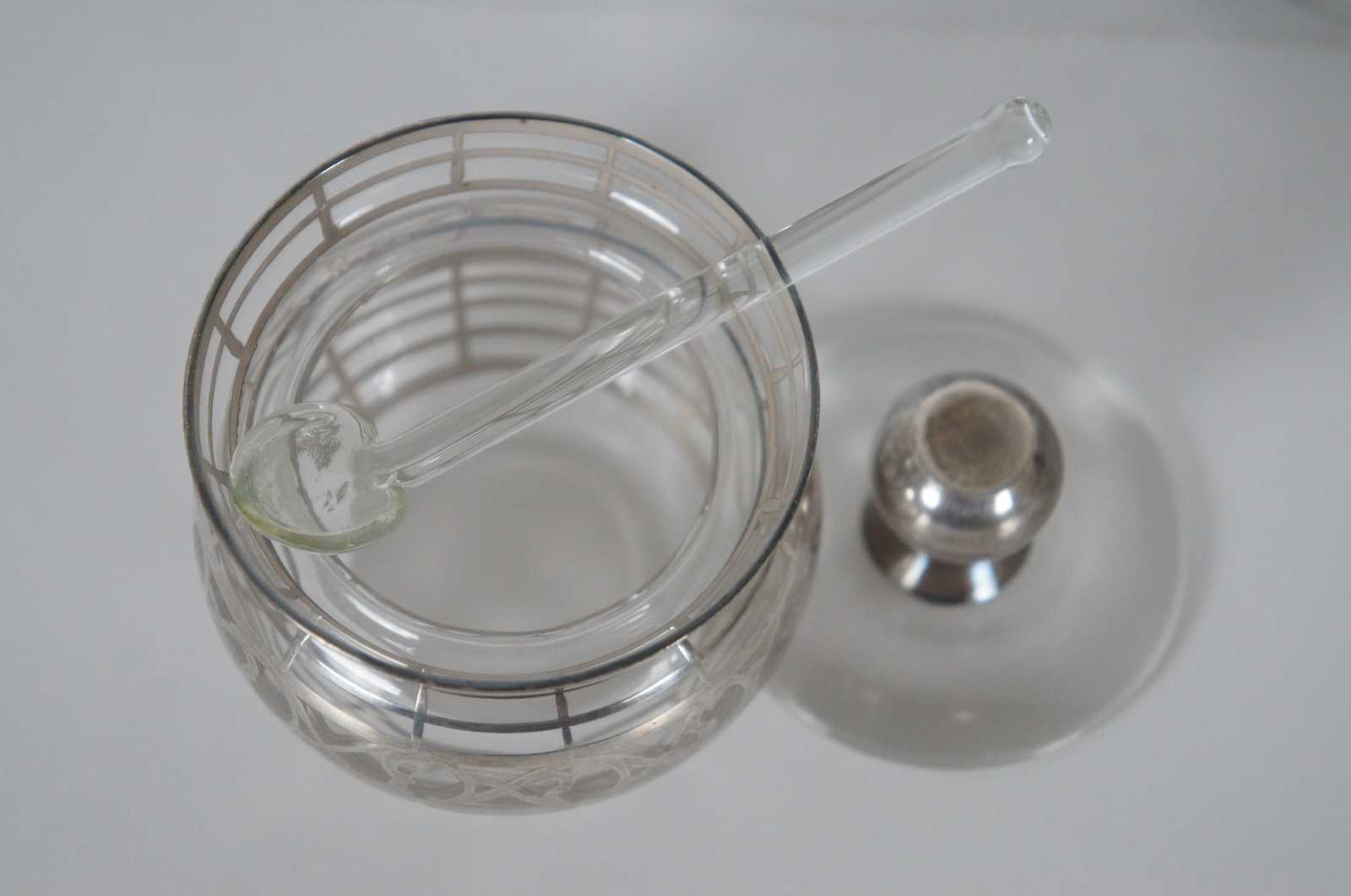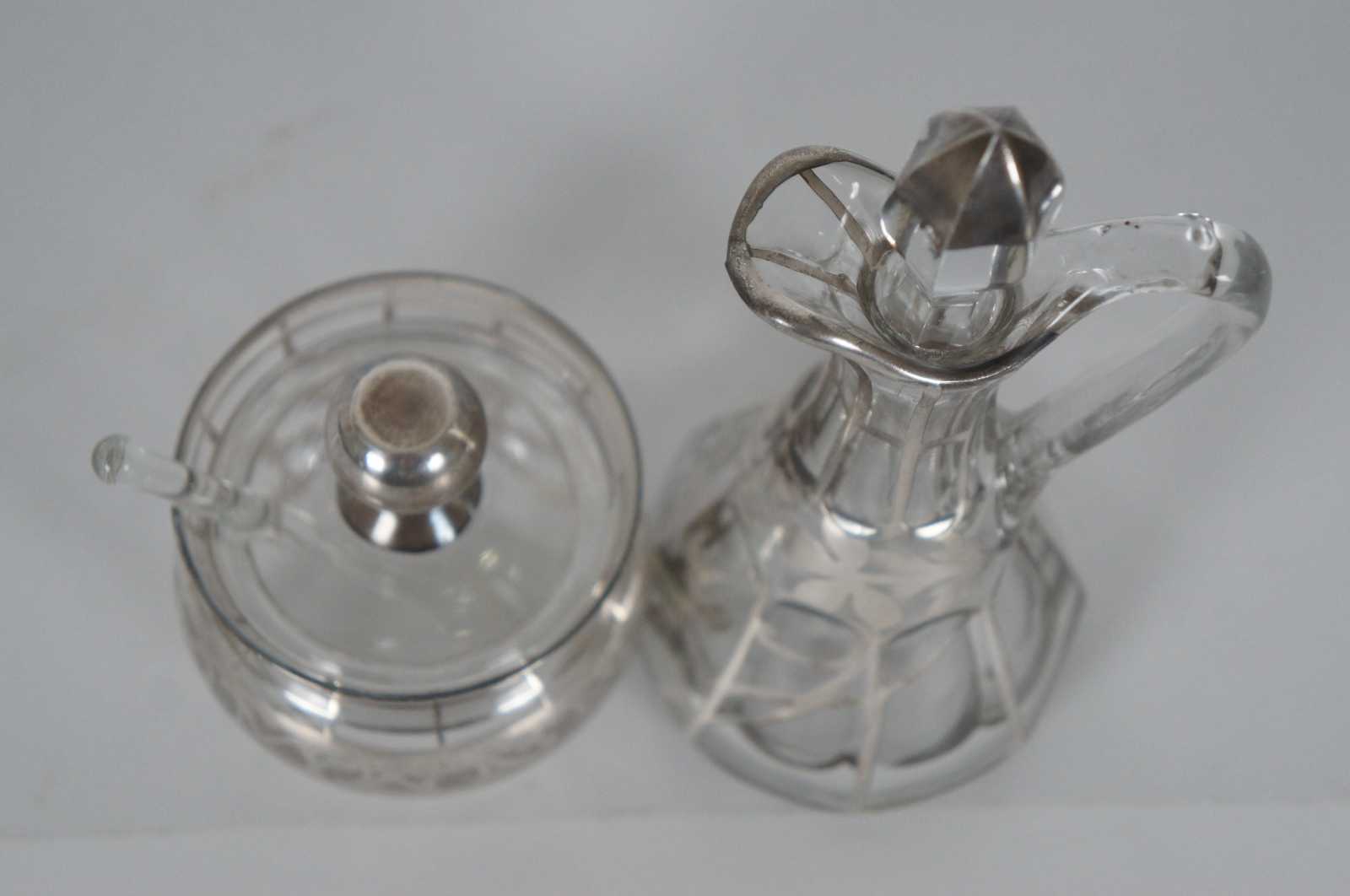 Pair of vintage glass serving pieces – jam or mustard pot with lid, spoon and silver overlay and cruet bottle with handle and stopper with painted silver gilding.