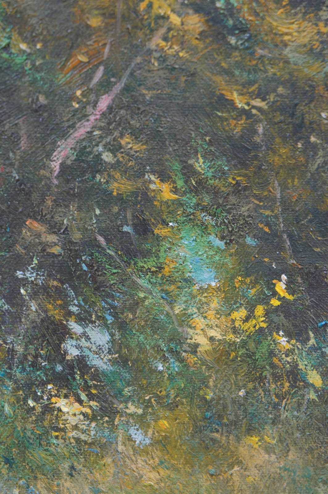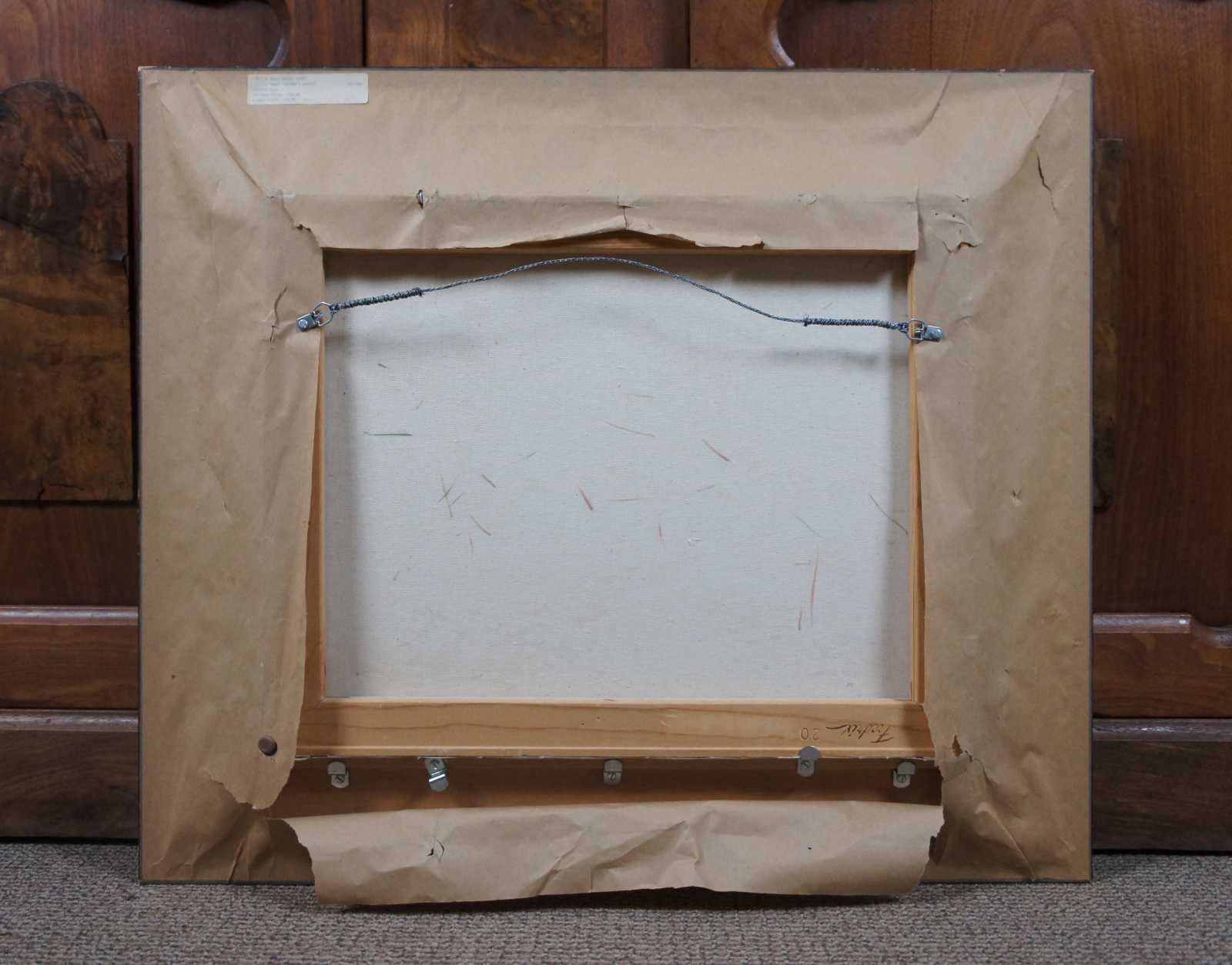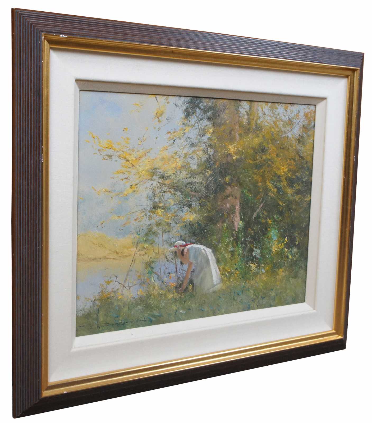 Impressionist oil on canvas landscape painting titled “Season’s Warmth” by Robert Hagan, showing a figure in a white dress picking wildflowers. “Born in 1947 and raised in the lush, languorous sub-tropical northern New South Wales, Australia and educated at Newcastle University, he communicates in a typical offhanded Aussie manner. Widely traveled with studios in Suffolk, England., San Diego, USA., Southport, Australia and Pattaya, Thailand, Robert goes about his art with confidence, humility and pragmatism. He explains, ""When you look at things you tend to concentrate on one element, a boy or girl at the waters edge, for example. It's hard to bring into meaniful vision the entire scene at the one occasion. It's all there, but its not defined and it's that which is peripheral to the starting point"". The key to impressionism is keying in the peripherel to the starting point"".