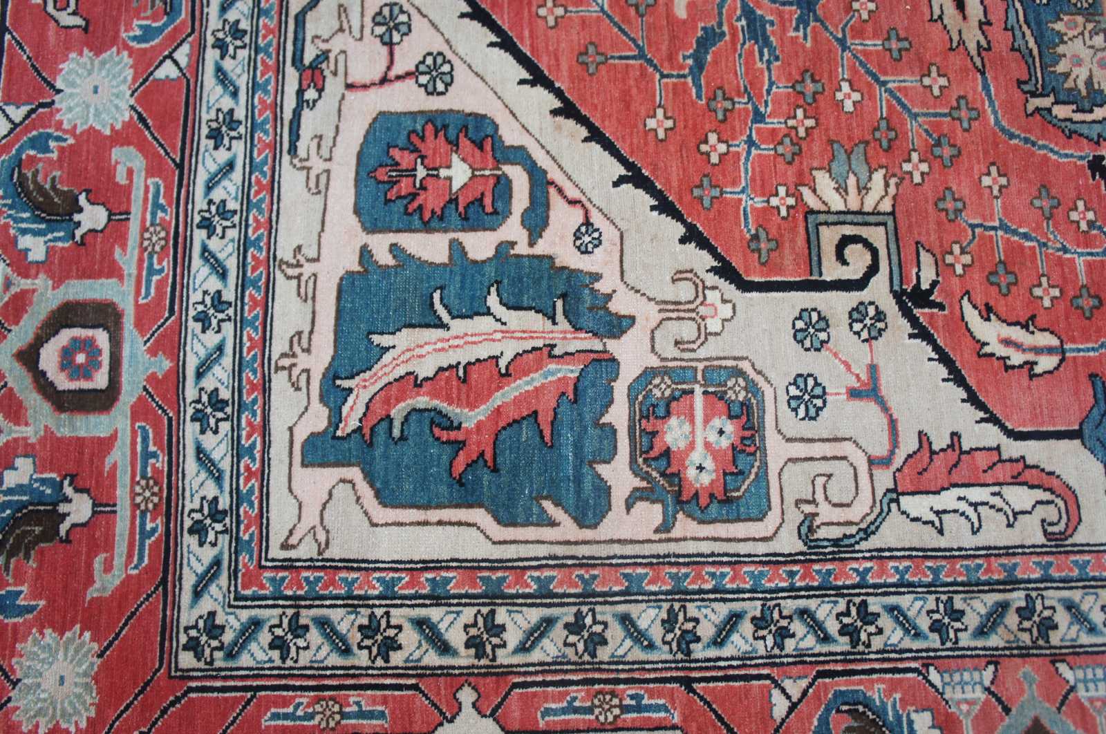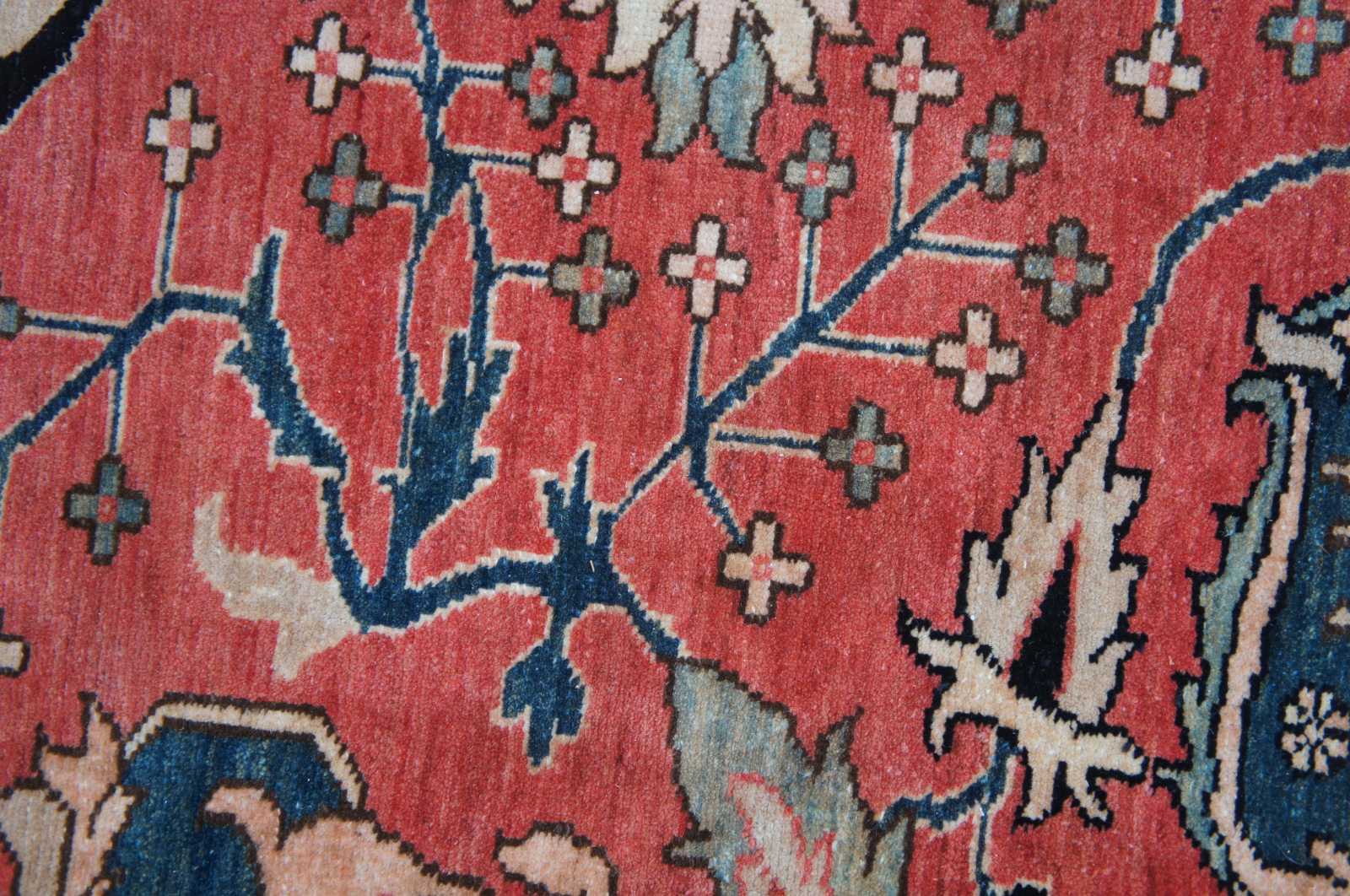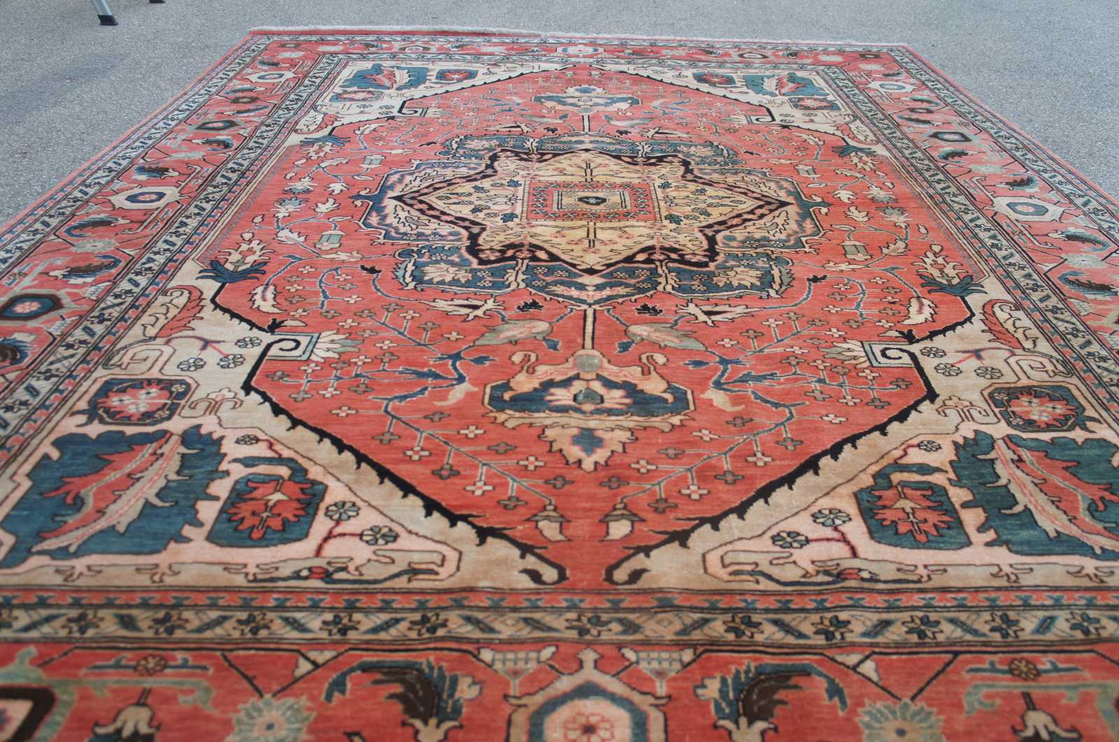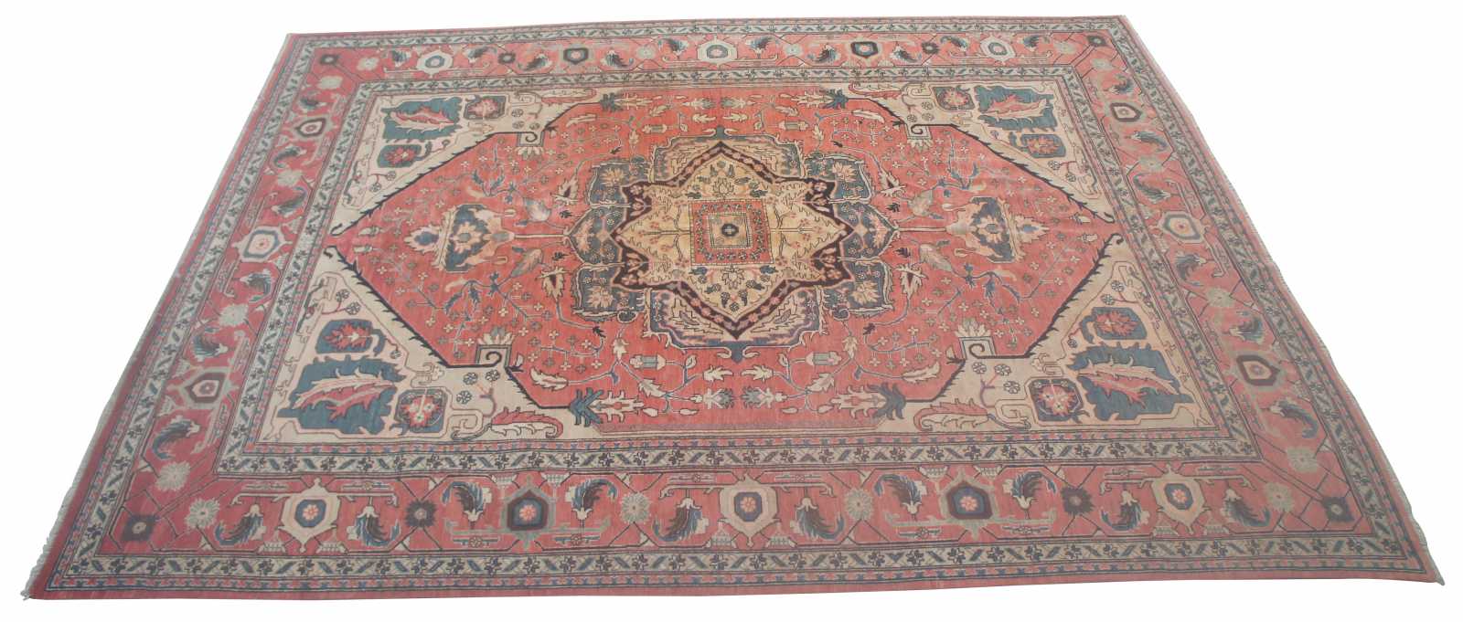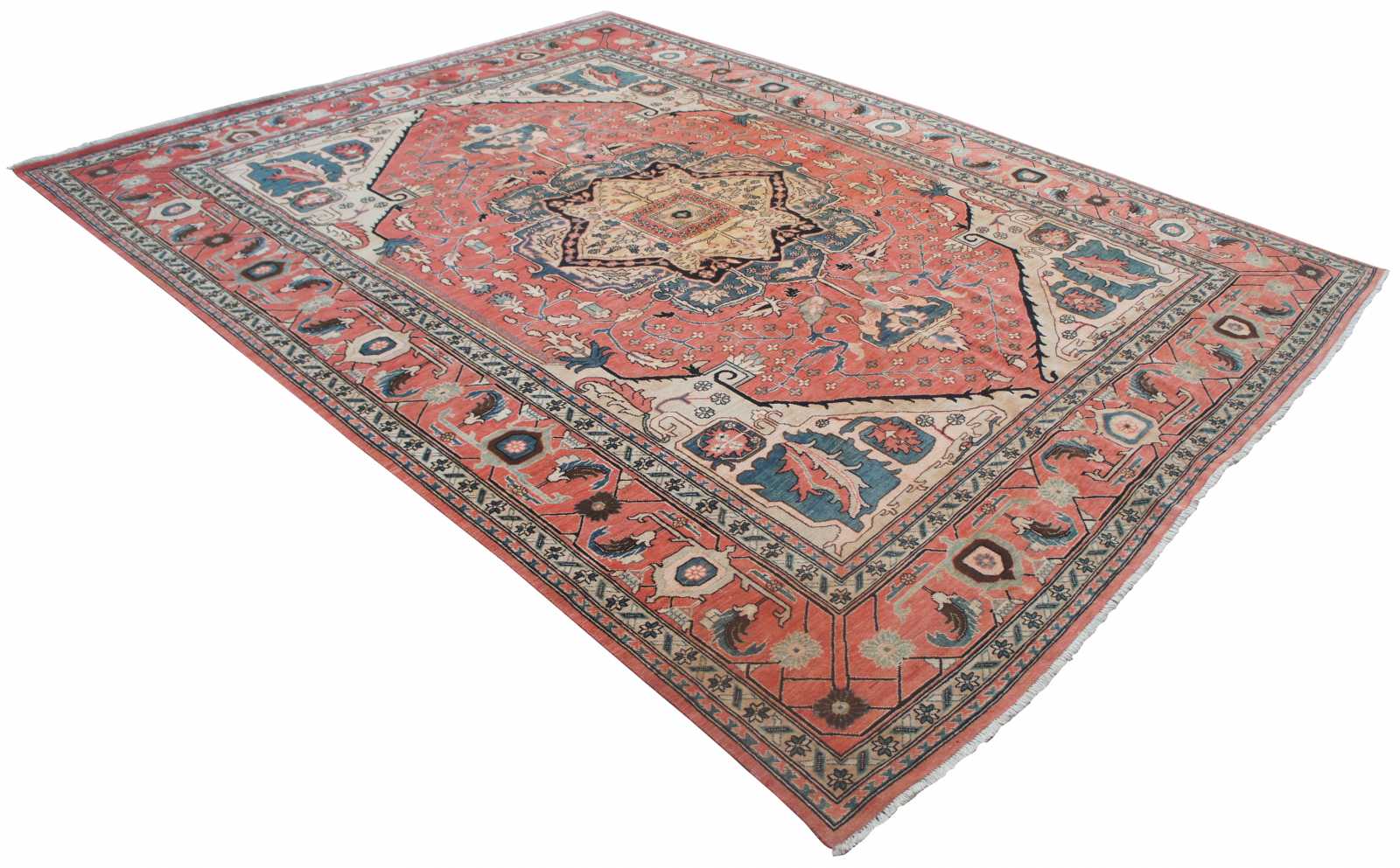 Vintage Persian Heriz area rug. Made of 100% wool featuring a floral medallion on a field of peach with blues, green / teal, pinks, tans and black.