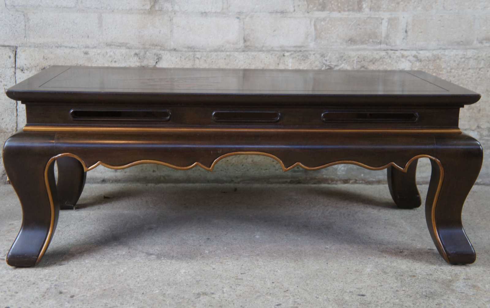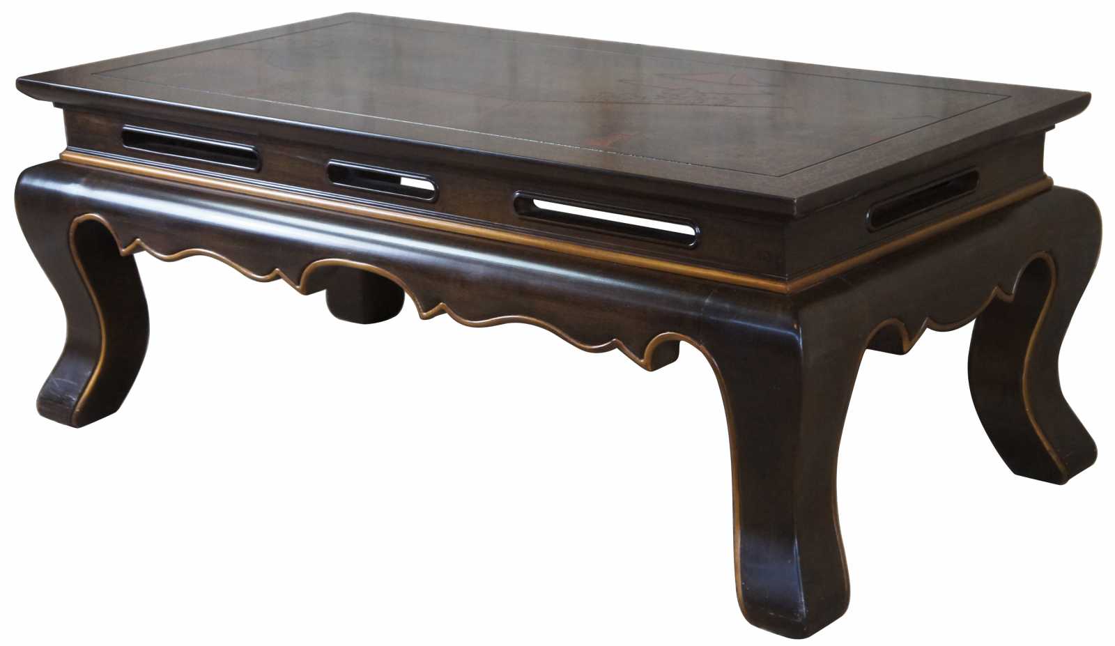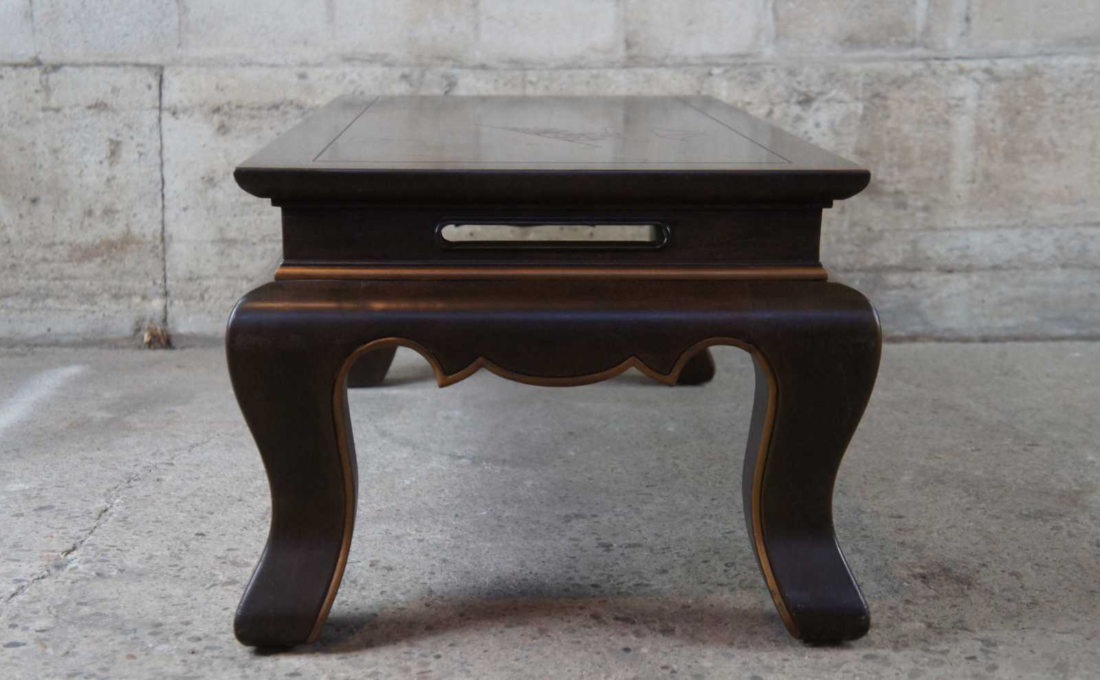 Vintage 1984 Henredon chinoserie coffee or cocktail table. Made from Ash, featuring hand painted landscape scene with geishas and pagodas. Signed lower right, Earlene W., marked on base.