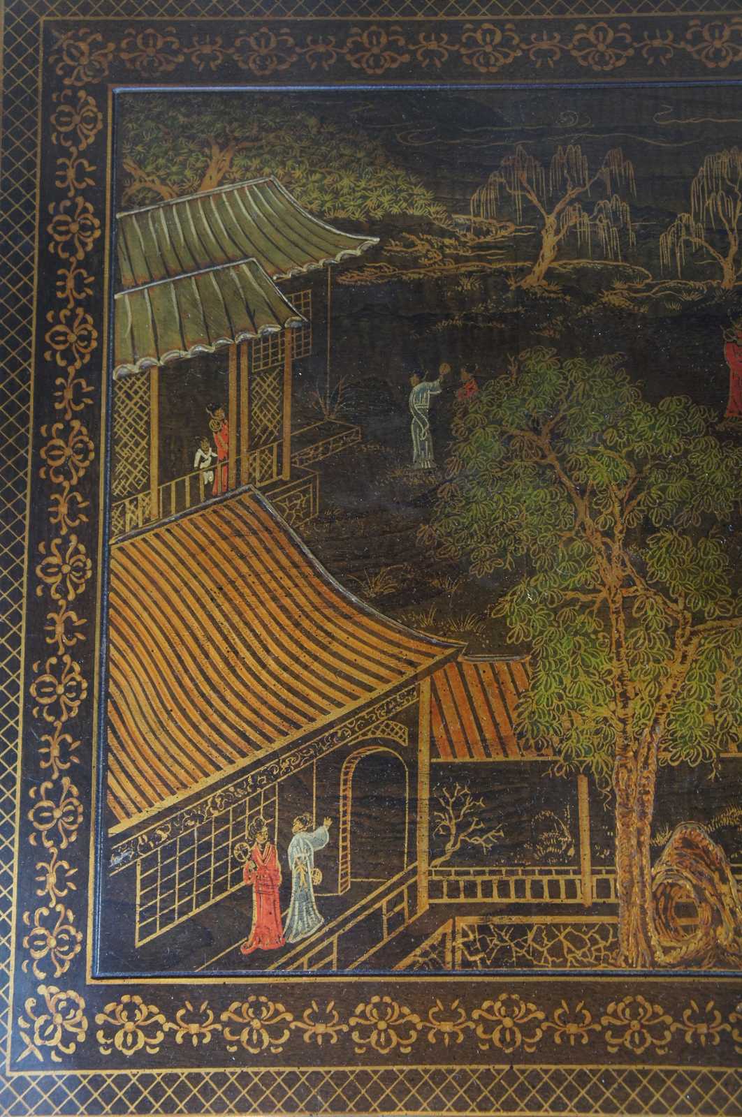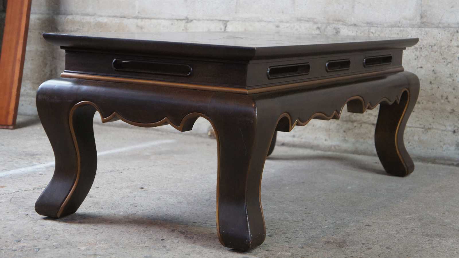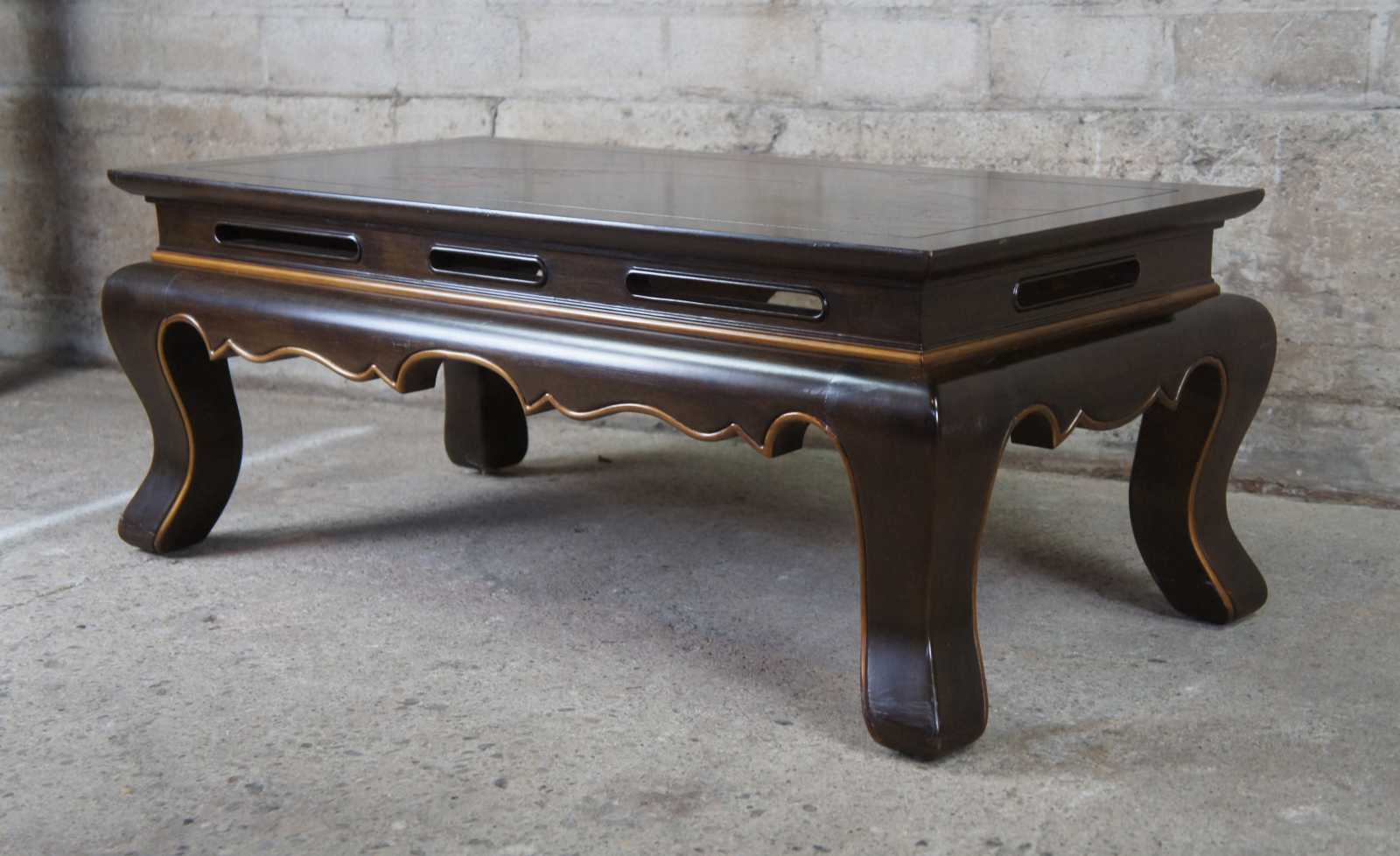 Vintage 1984 Henredon chinoserie coffee or cocktail table. Made from Ash, featuring hand painted landscape scene with geishas and pagodas. Signed lower right, Earlene W., marked on base.