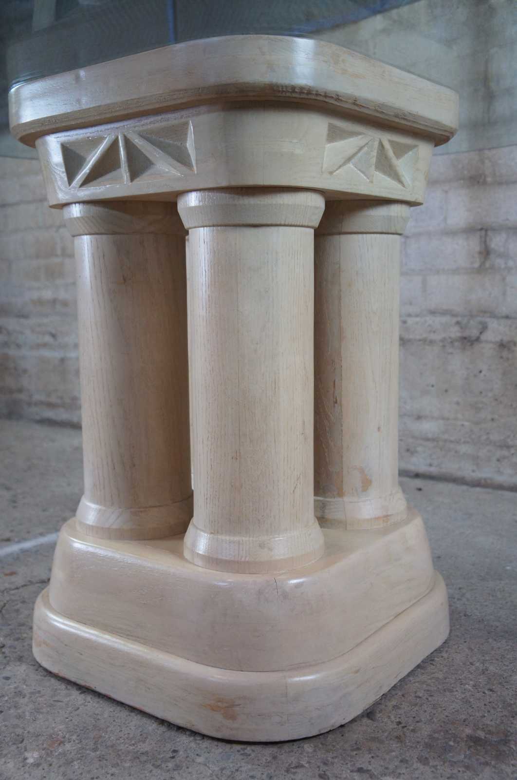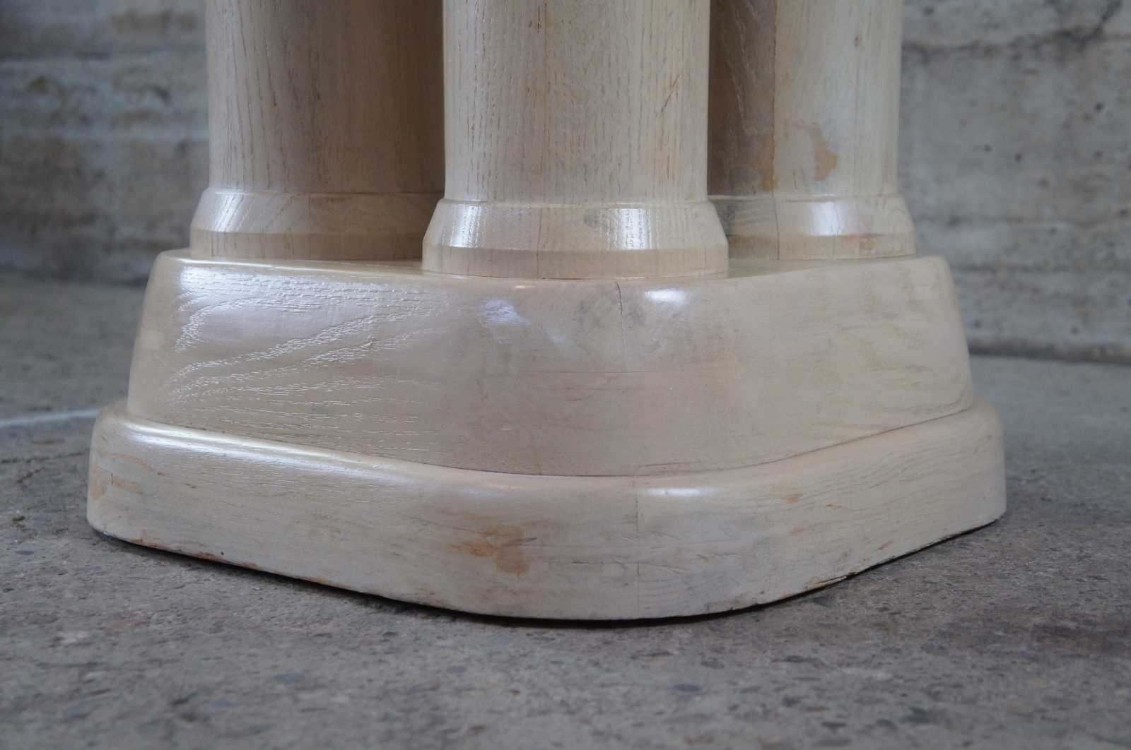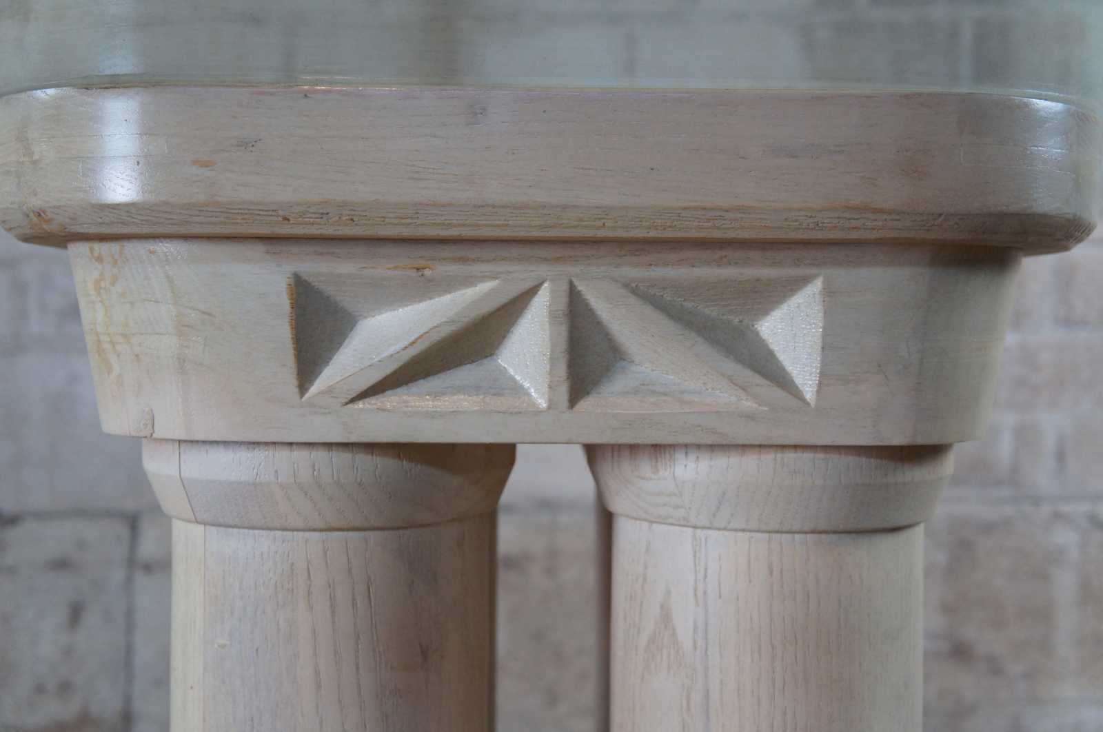 Vintage Henredon pickled oak dining table. Features four column pedestal base with square inset copper accent and round glass top.