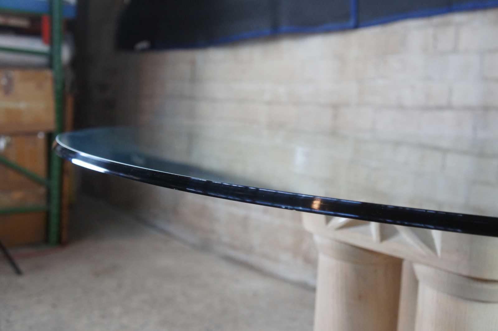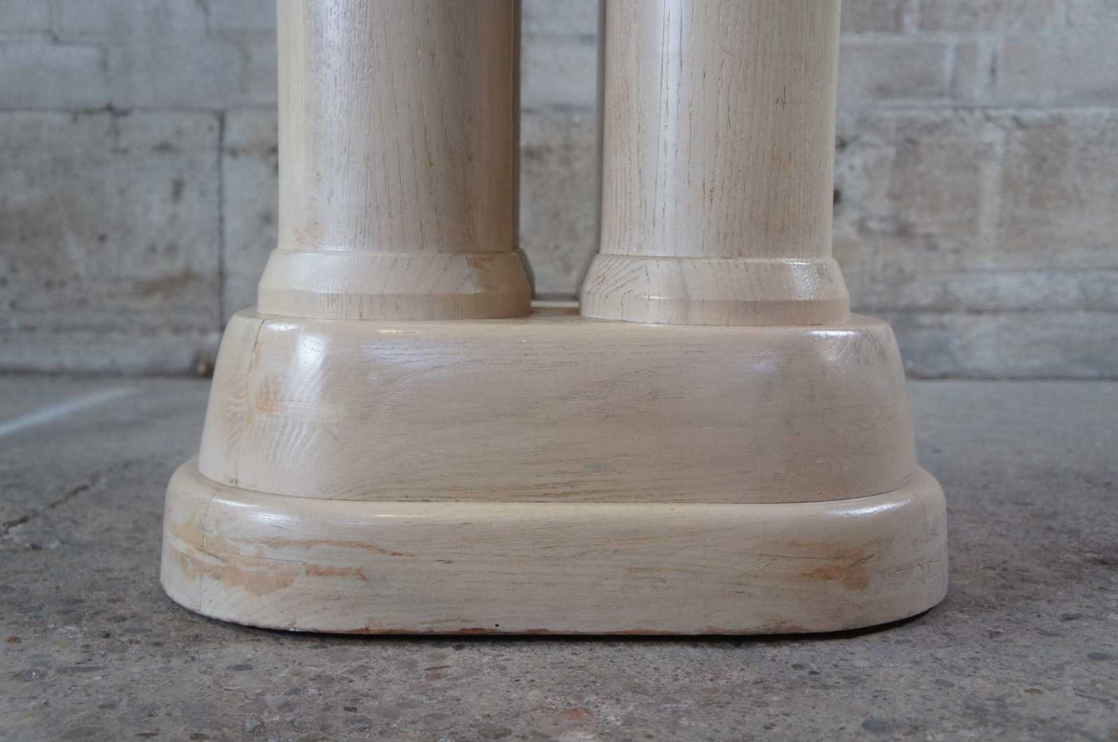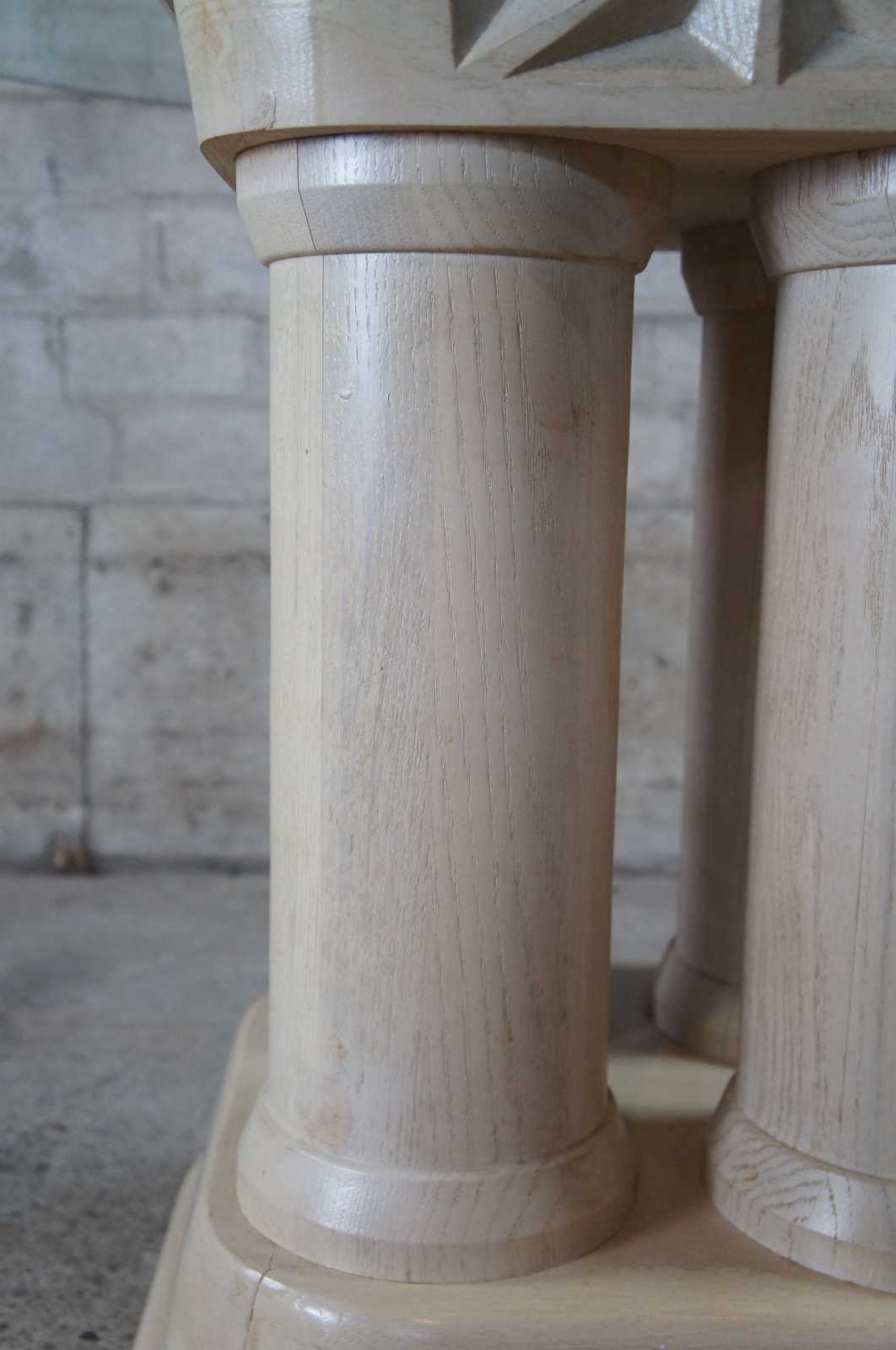 Vintage Henredon pickled oak dining table. Features four column pedestal base with square inset copper accent and round glass top.