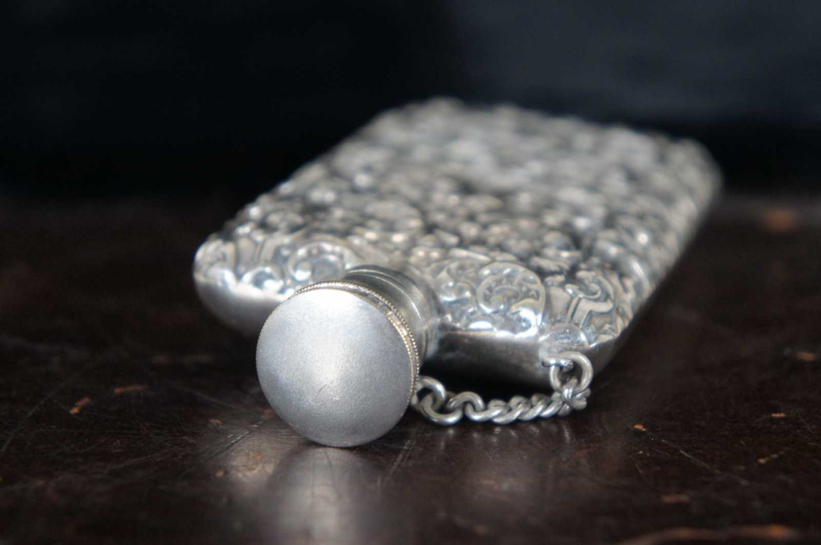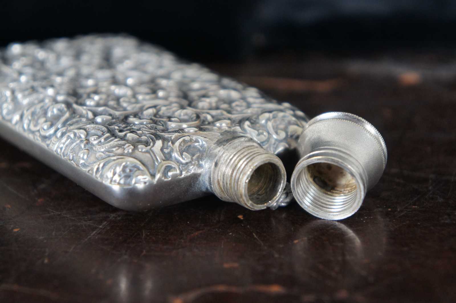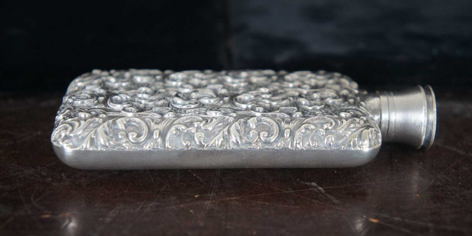 Antique repousse floral silver plate pocket flask with sparrow bird and engraved “Only” on the reverse.