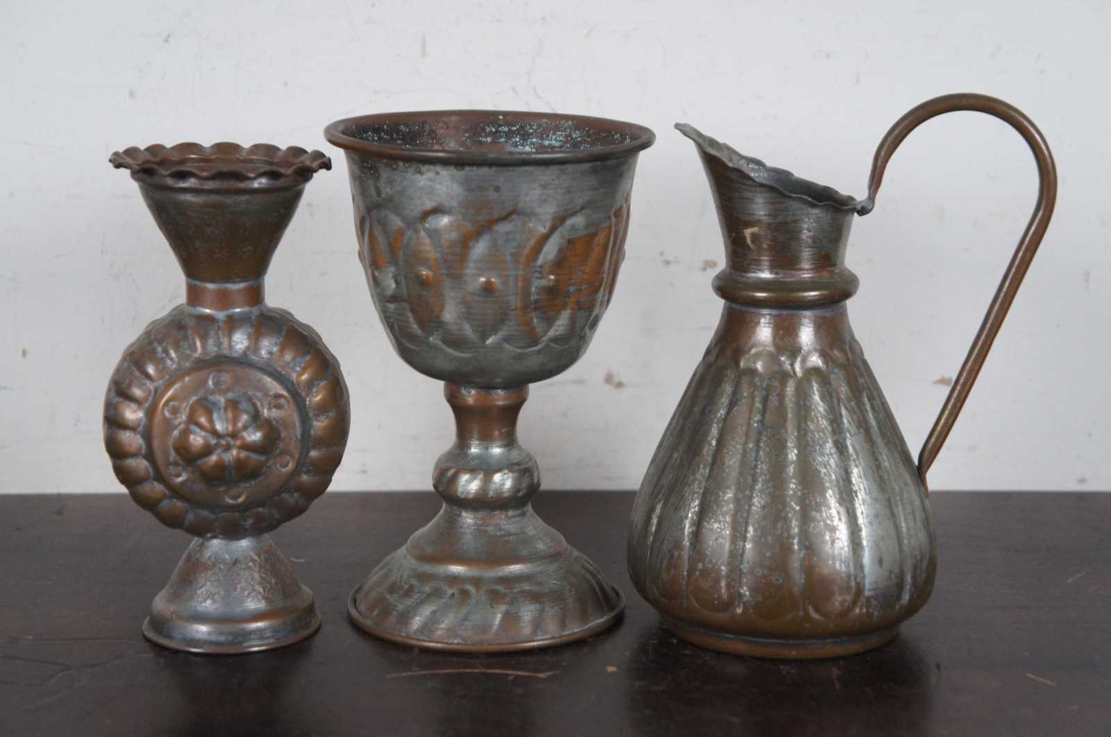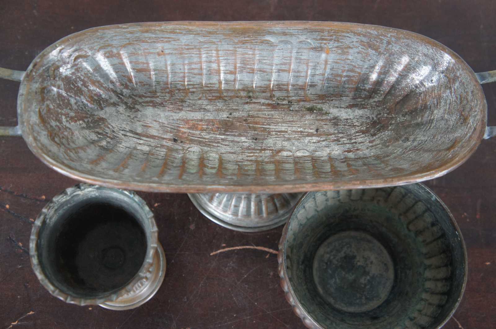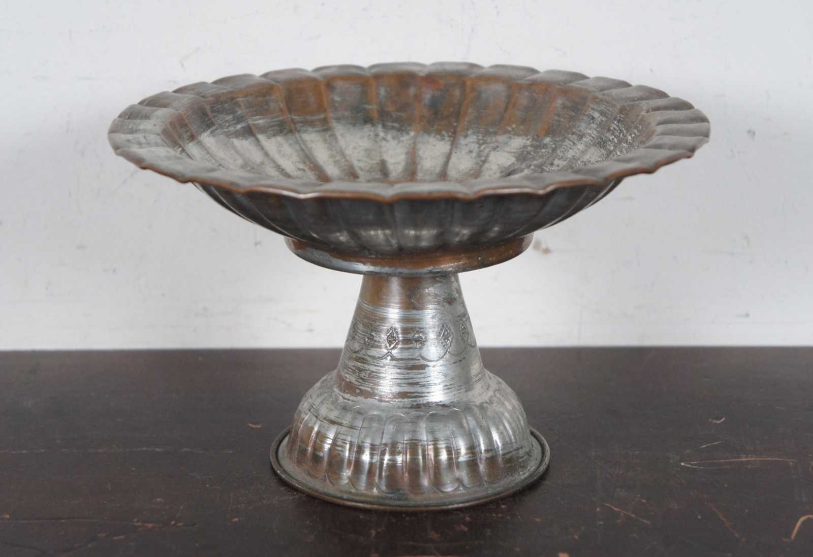 Lot of seven assorted vintage copper/tin pieces including two centerpiece compotes, a small pitcher, large goblet, small goblet, small planter and a vase. Only one hallmarked.