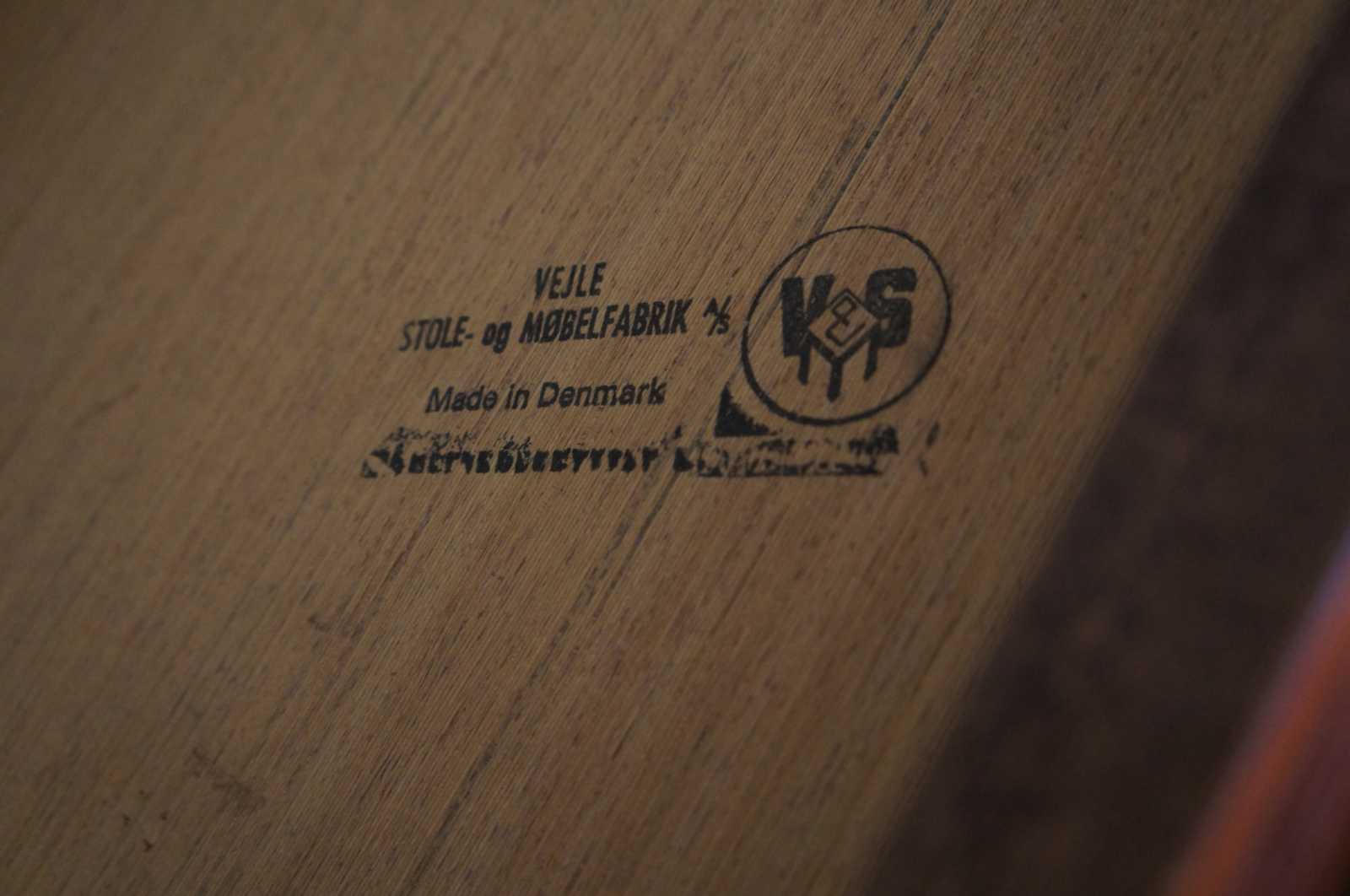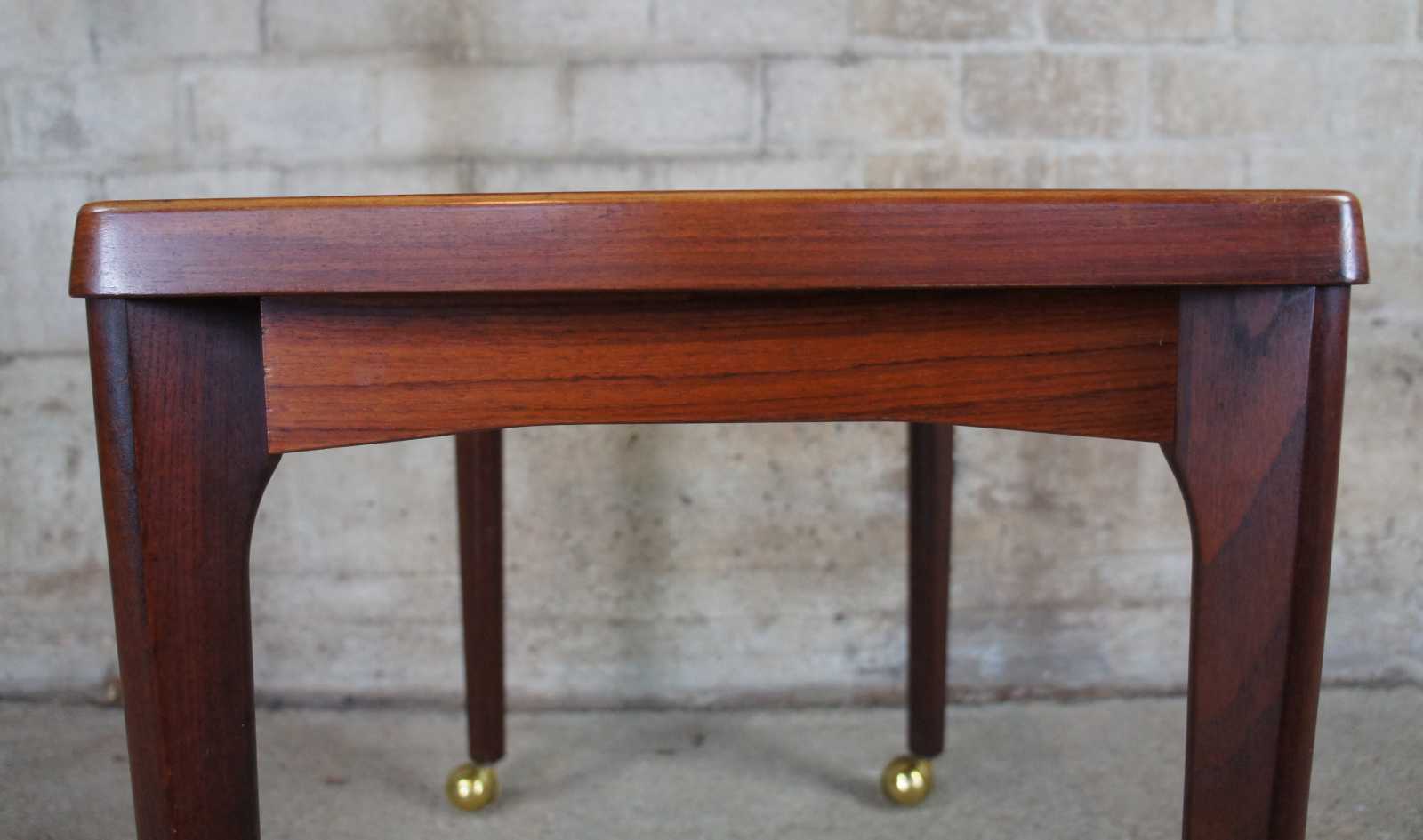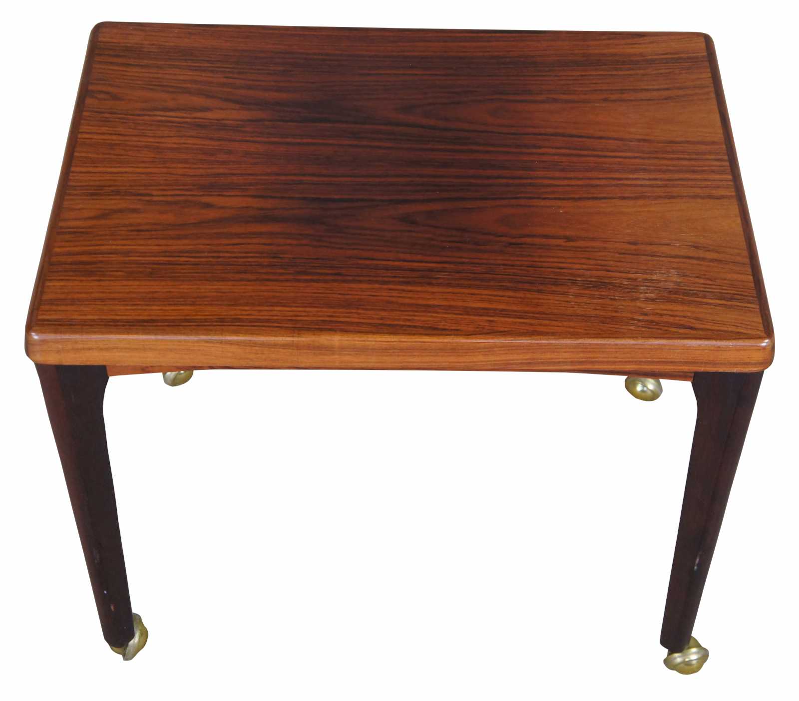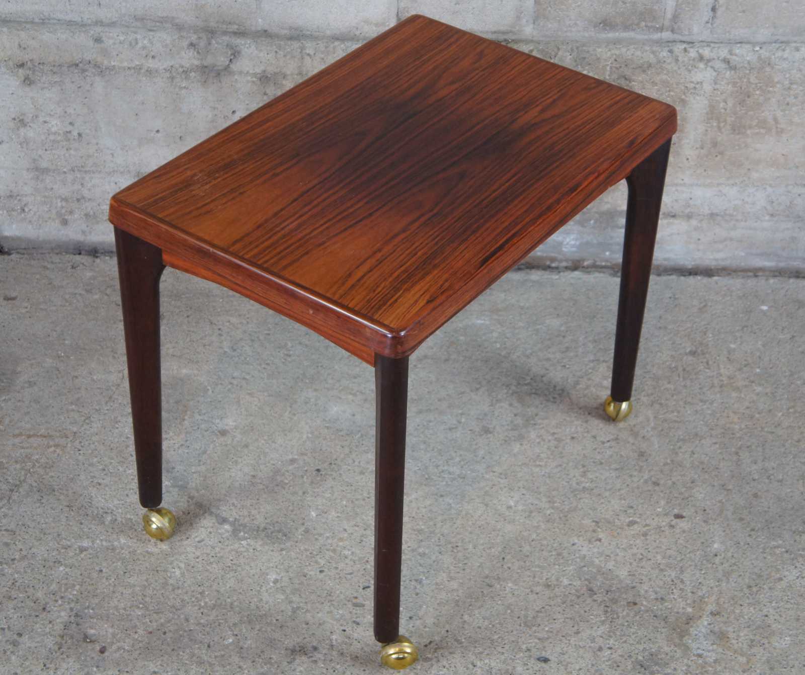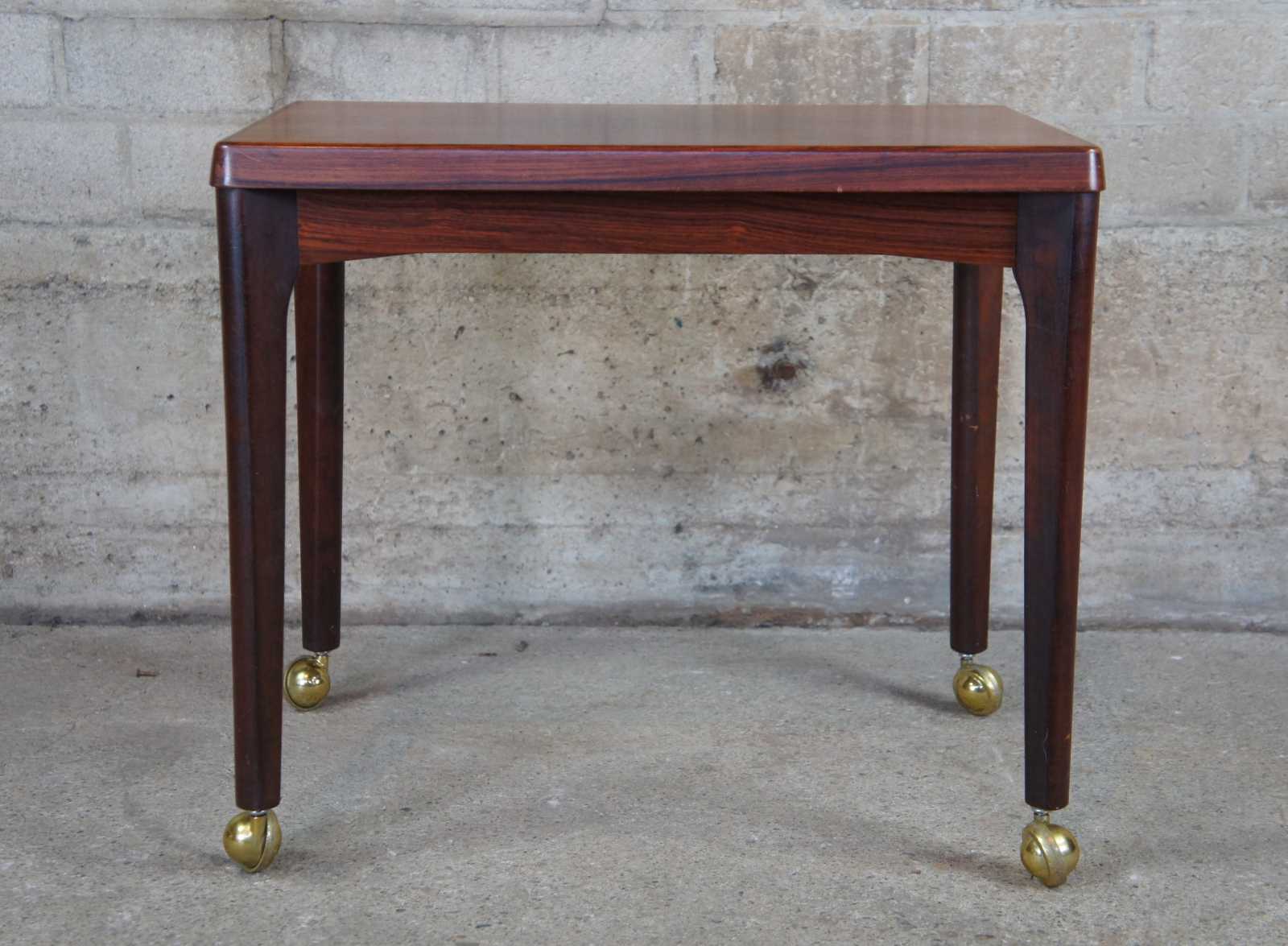 Mid century modern Vejle Stole Movelfabrik console, accent or side table. Made of Rosewood featuring rectangular form and large rollilng casters. Marked Made in Denmark along bottom.