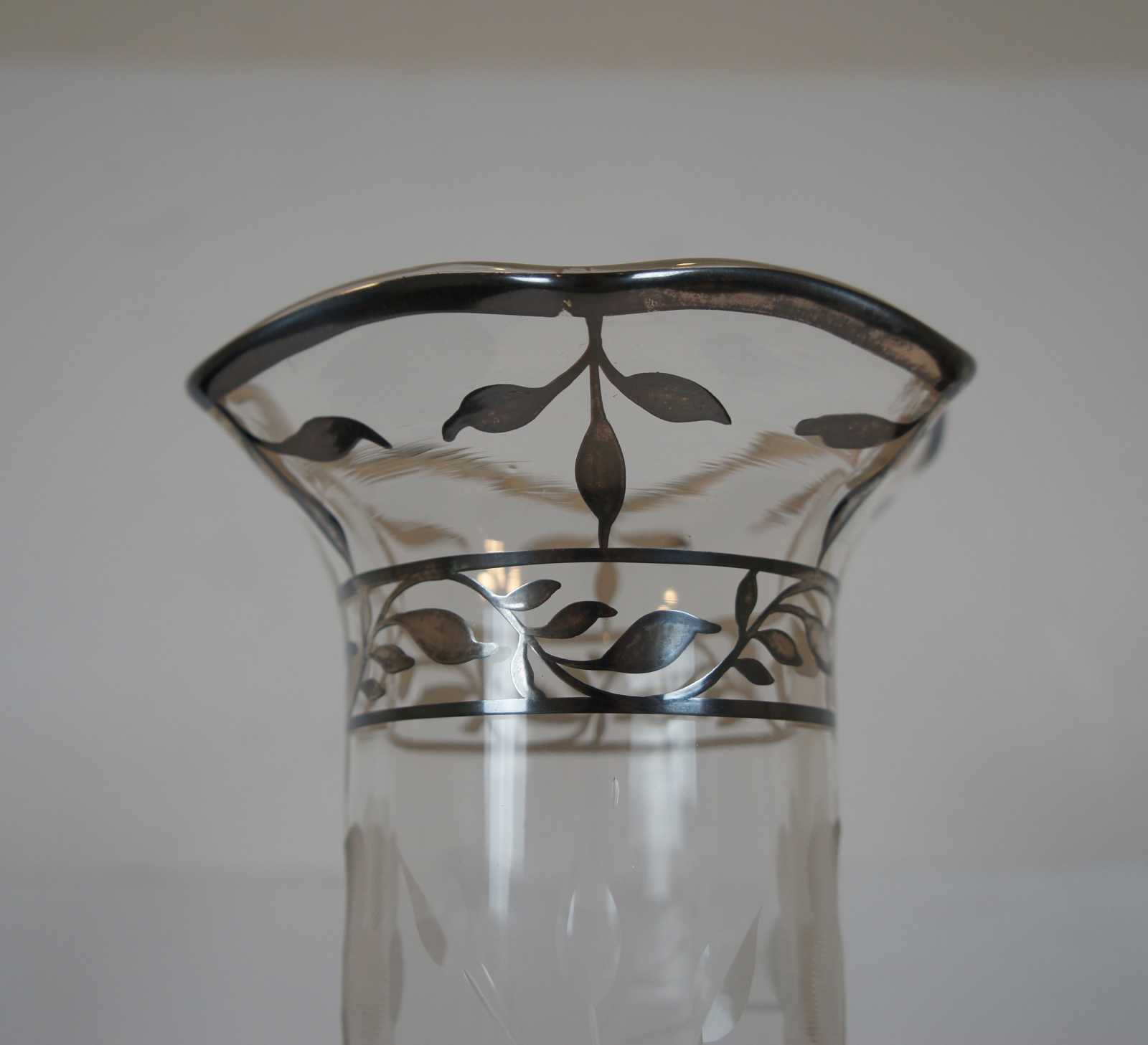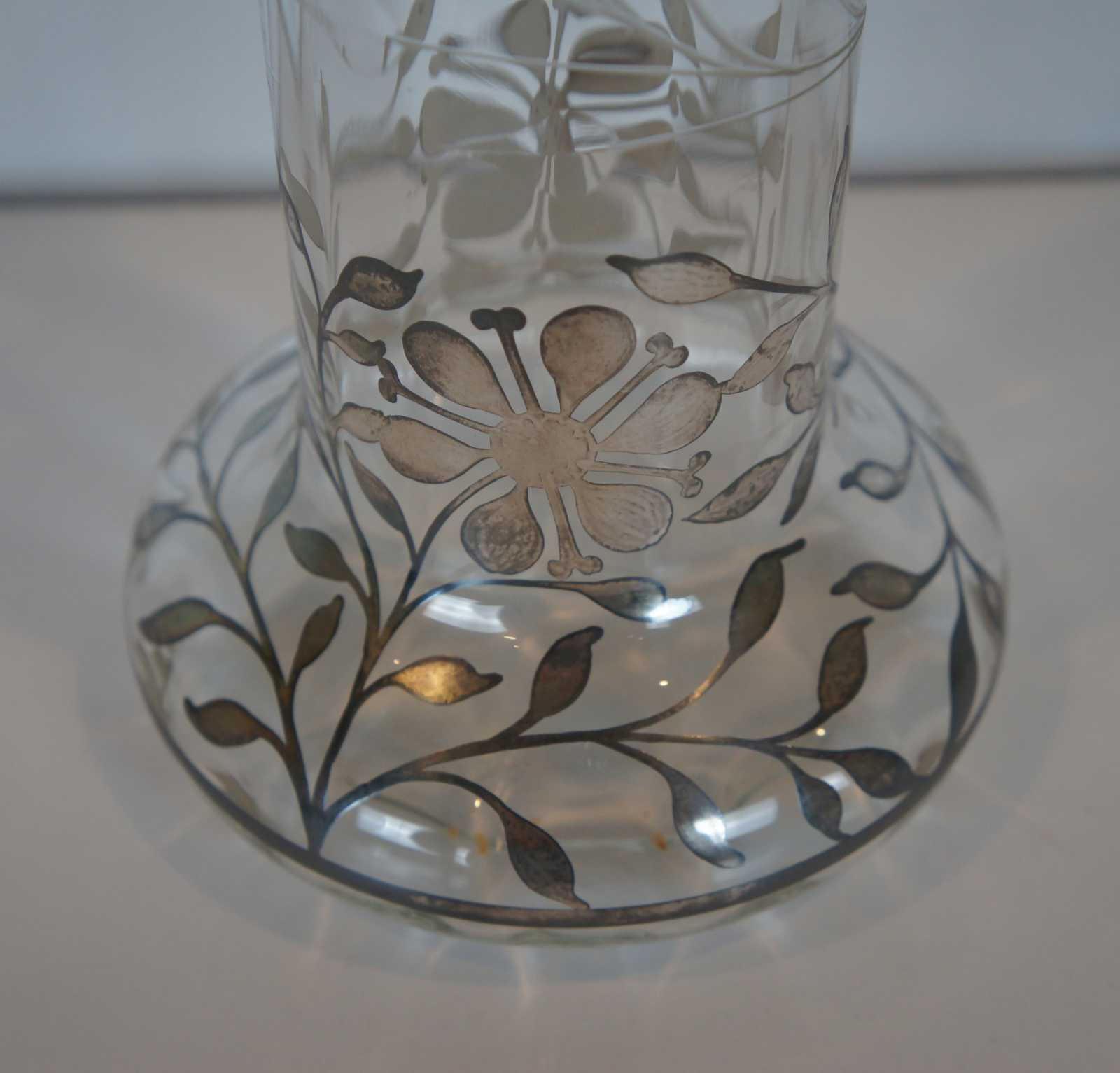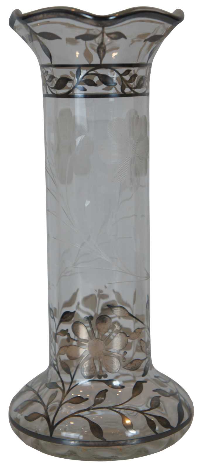 Antique art nouveau tall glass flower vase with floral sterling silver overlay.