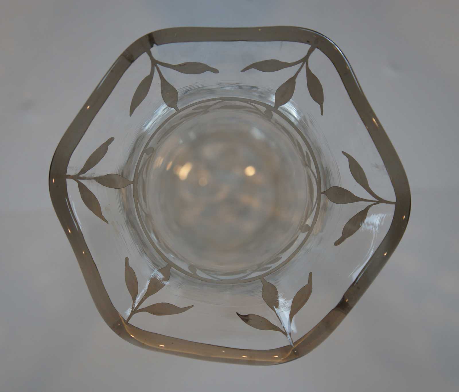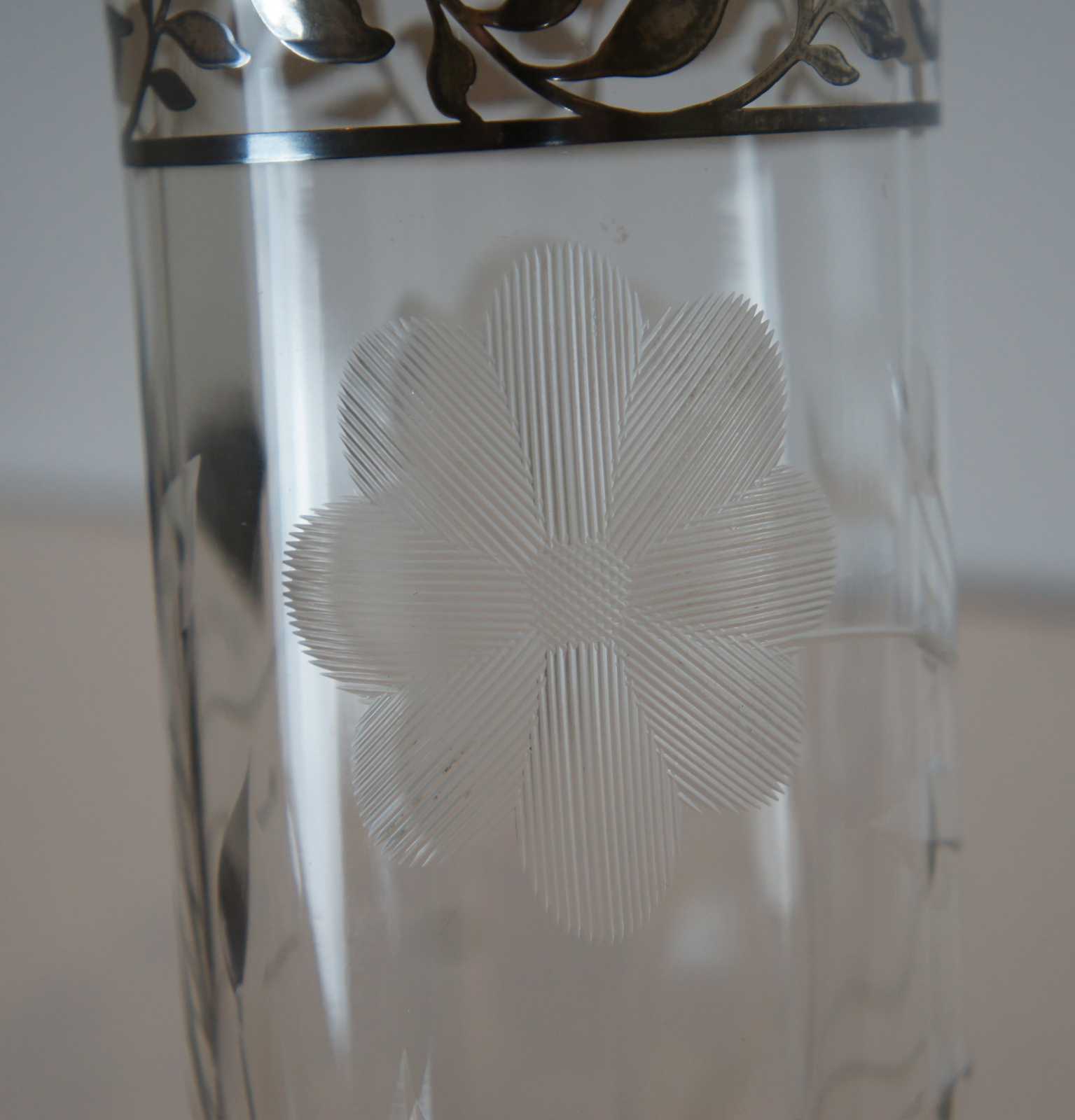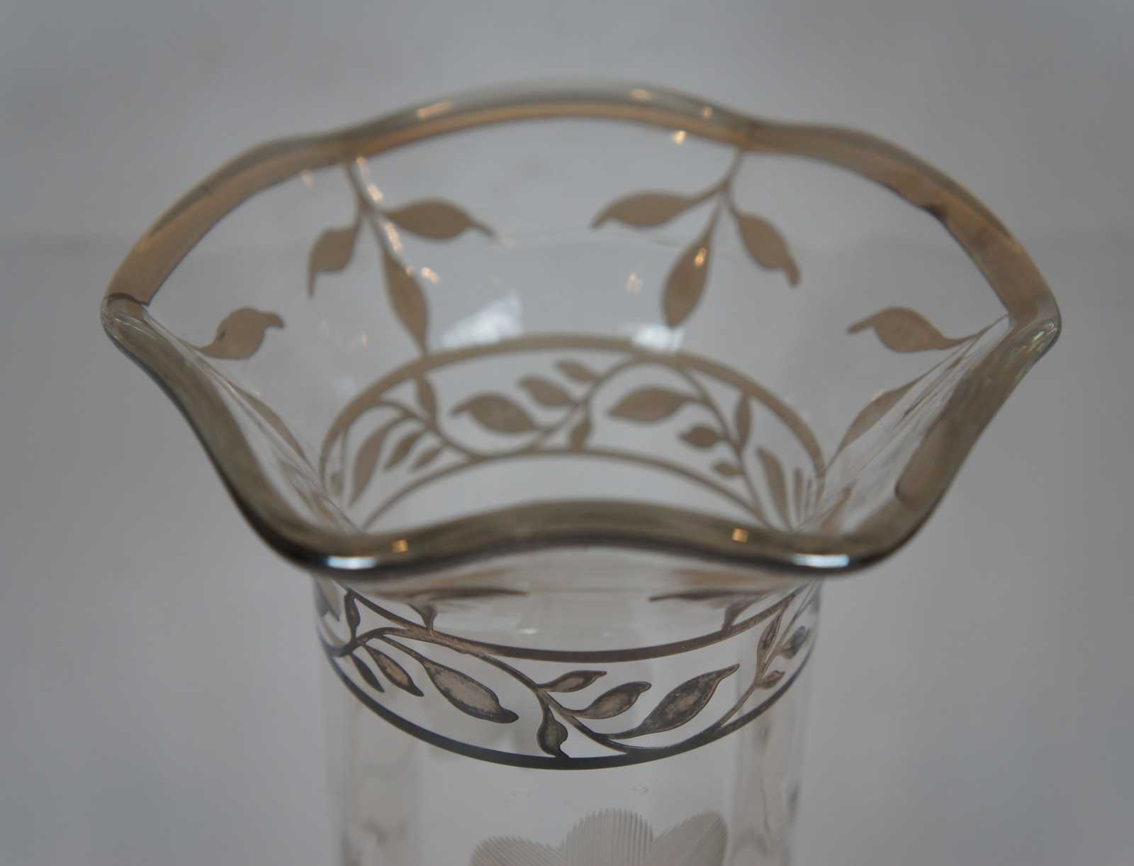 Antique art nouveau tall glass flower vase with floral sterling silver overlay.