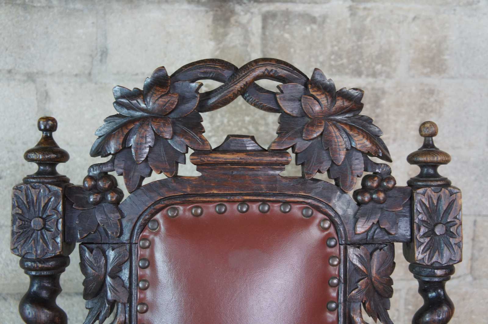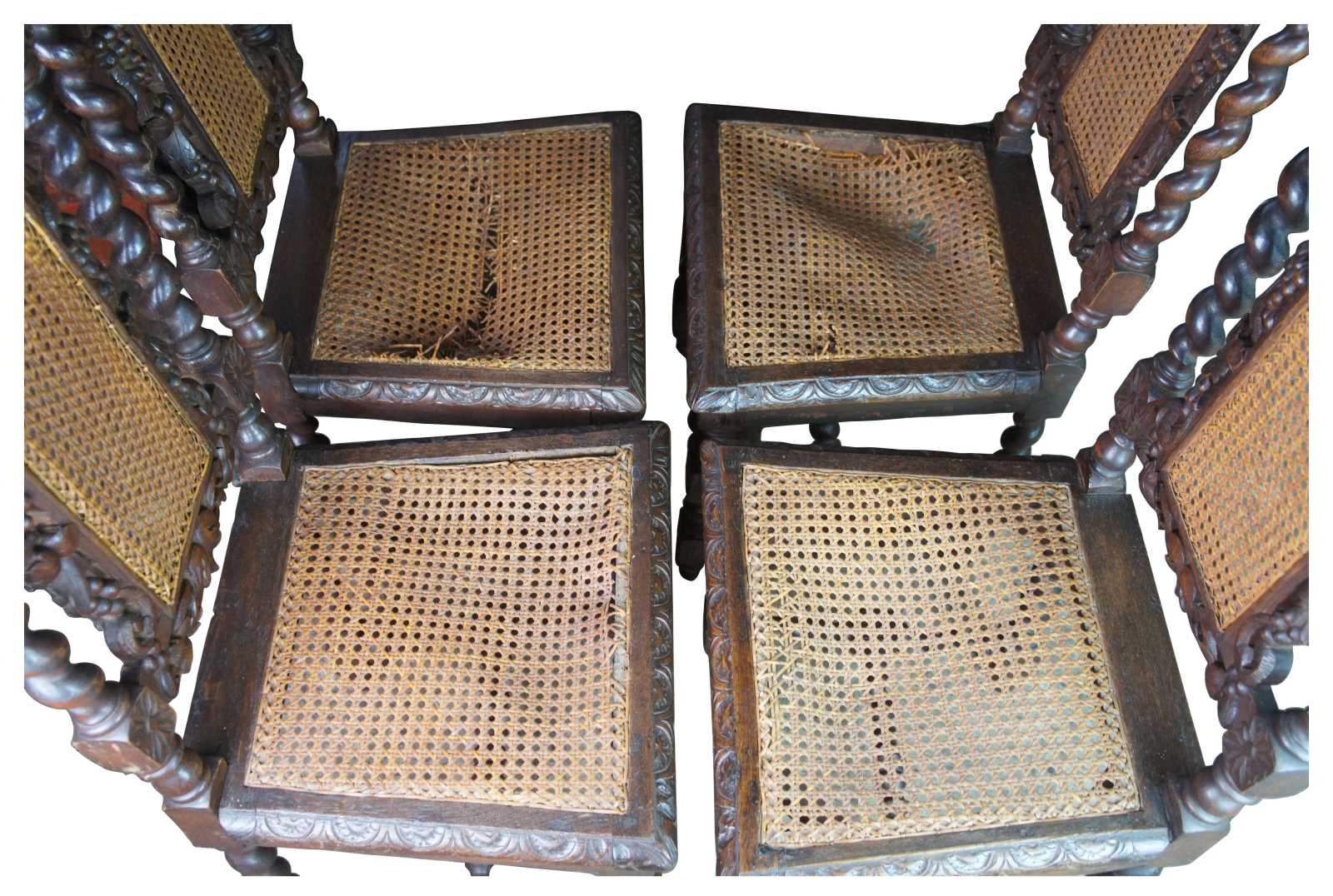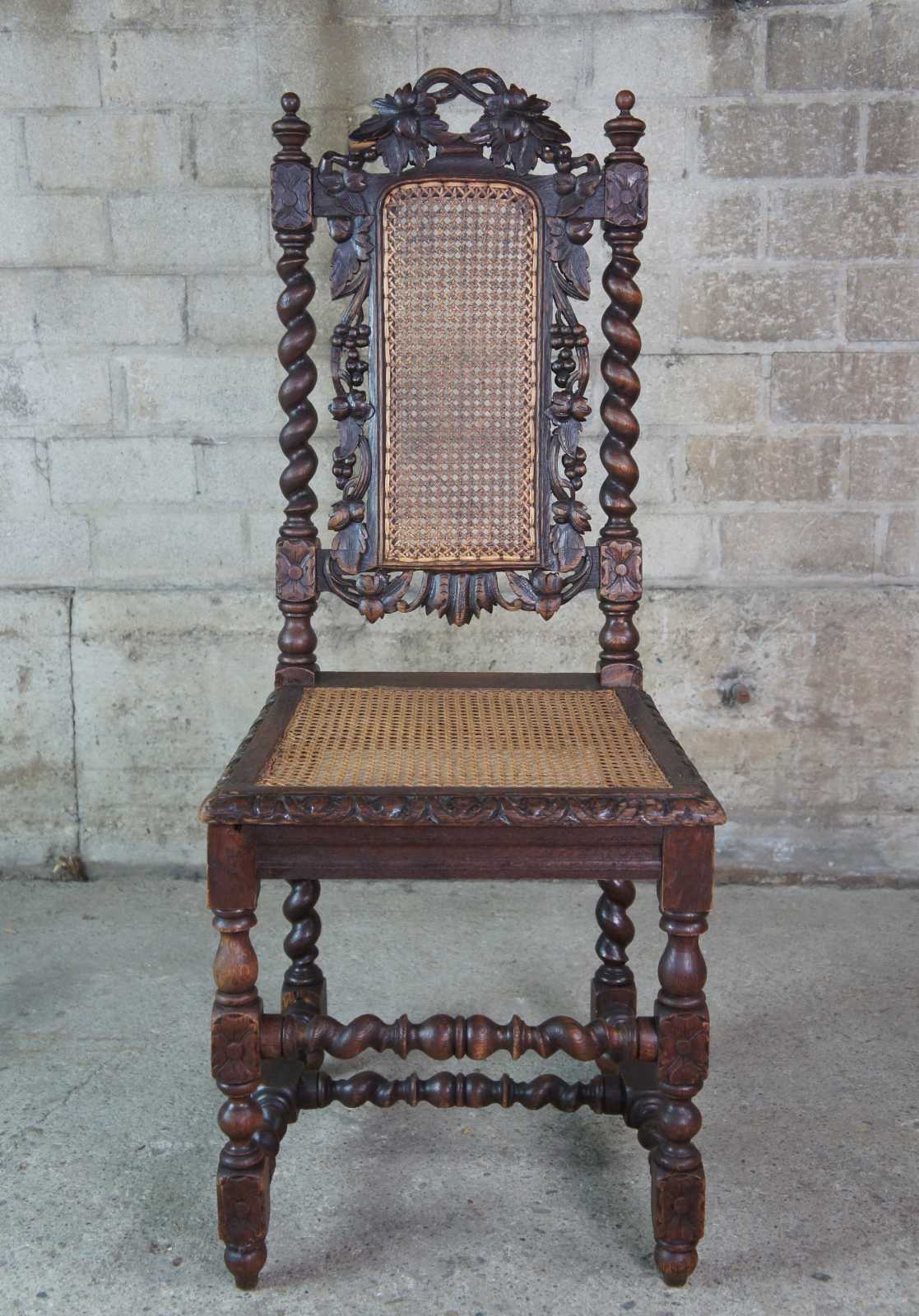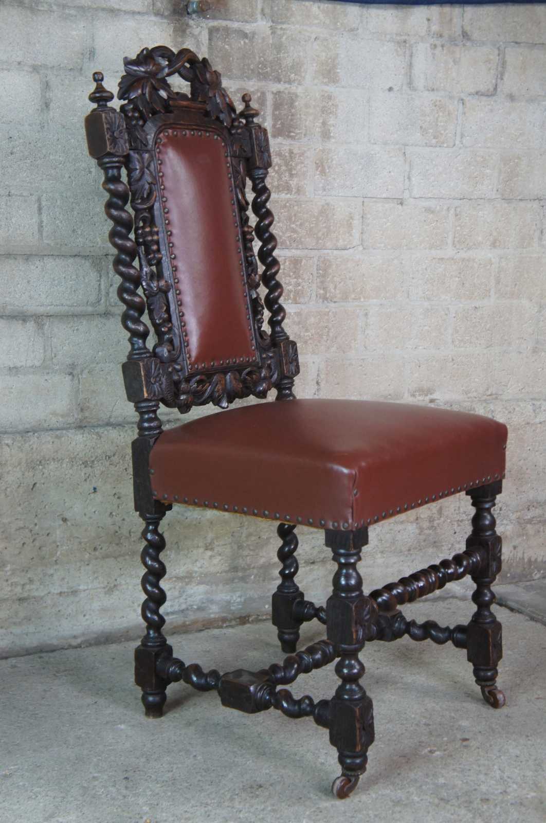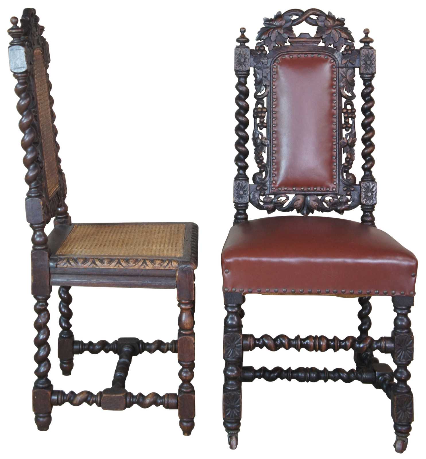 Ten antique Renaissance Revival dining chairs. Made of oak featuring ornate berry / leaf / floral carvings with barley twisted supports and caning with leather and nailhead trim.