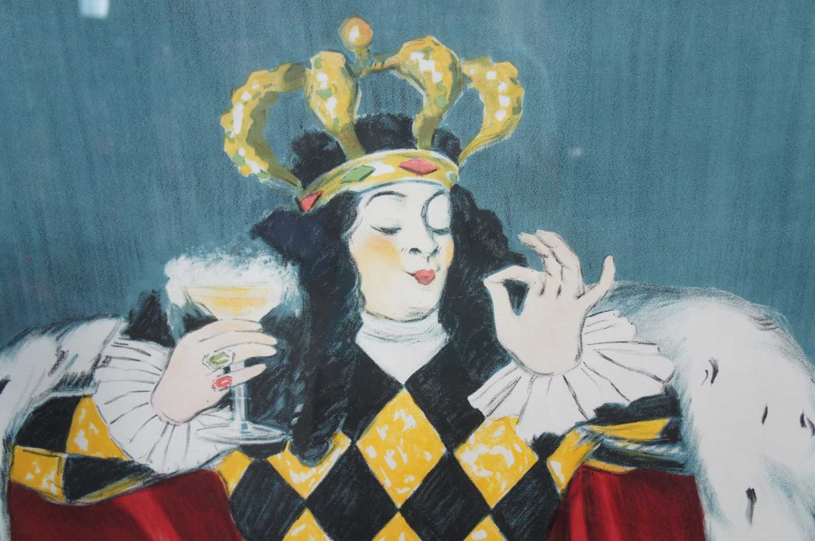 Crémant du Roi, Veuve Amiot, grands vins mousseux Veuve Amiot, showing the King Louis XIV's brother tasting a cup of this delicious French Champagne. A famous Cappiello original stone lithograph, finely printed in 1922.