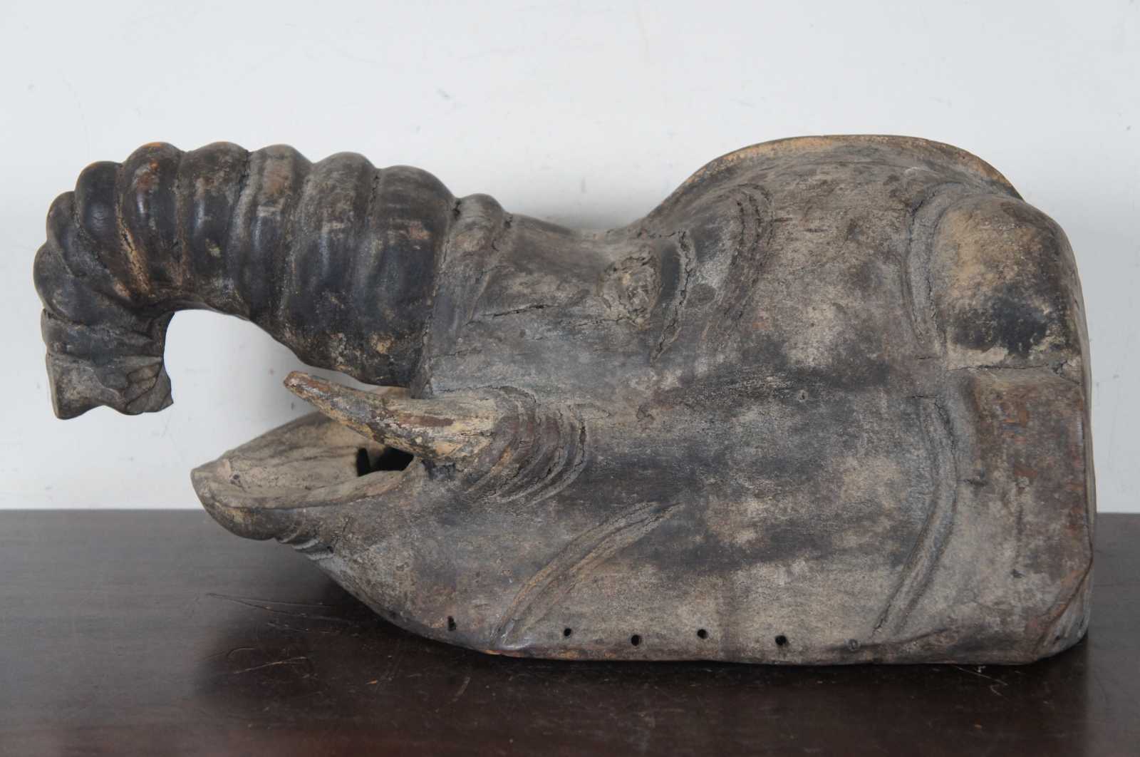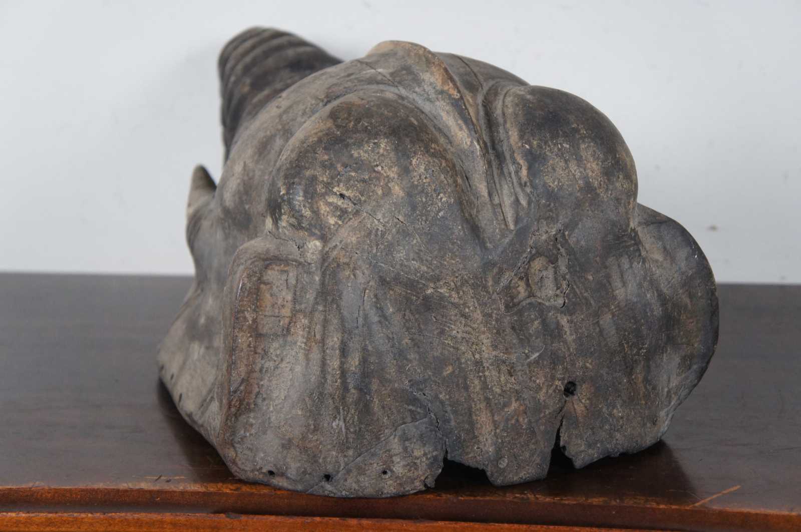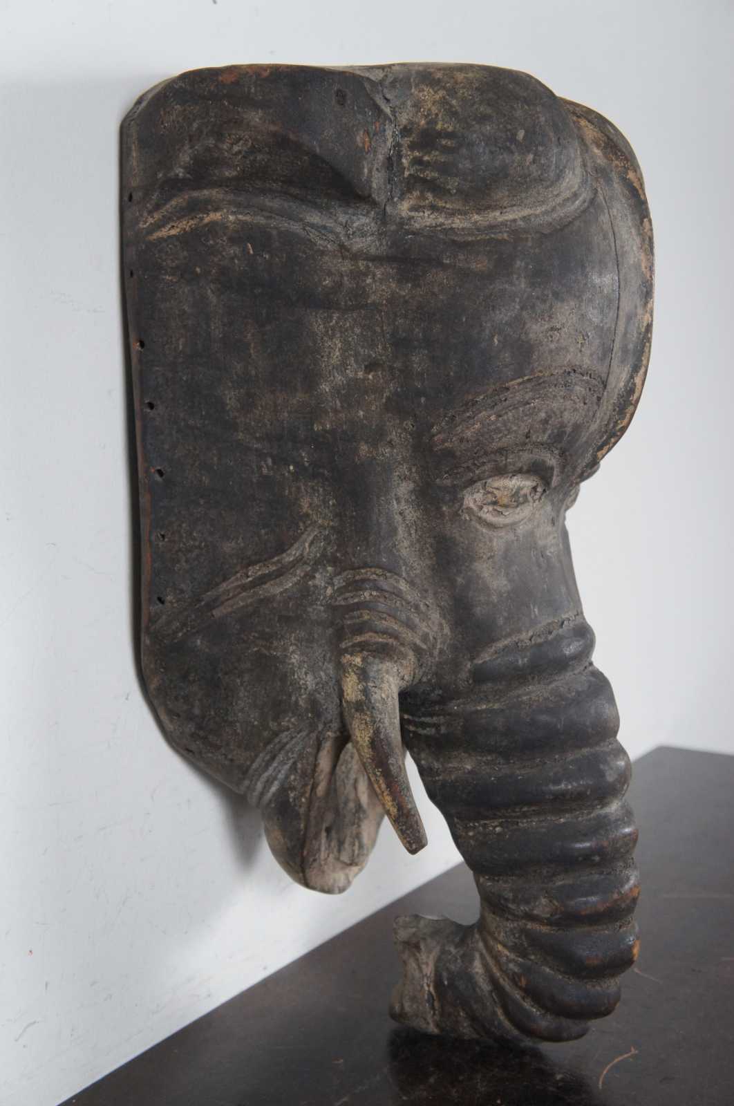 Antique hand carved wooden mask or wall hanging in the shape of an Indian elephant with wrinkled trunk and short tusks.
