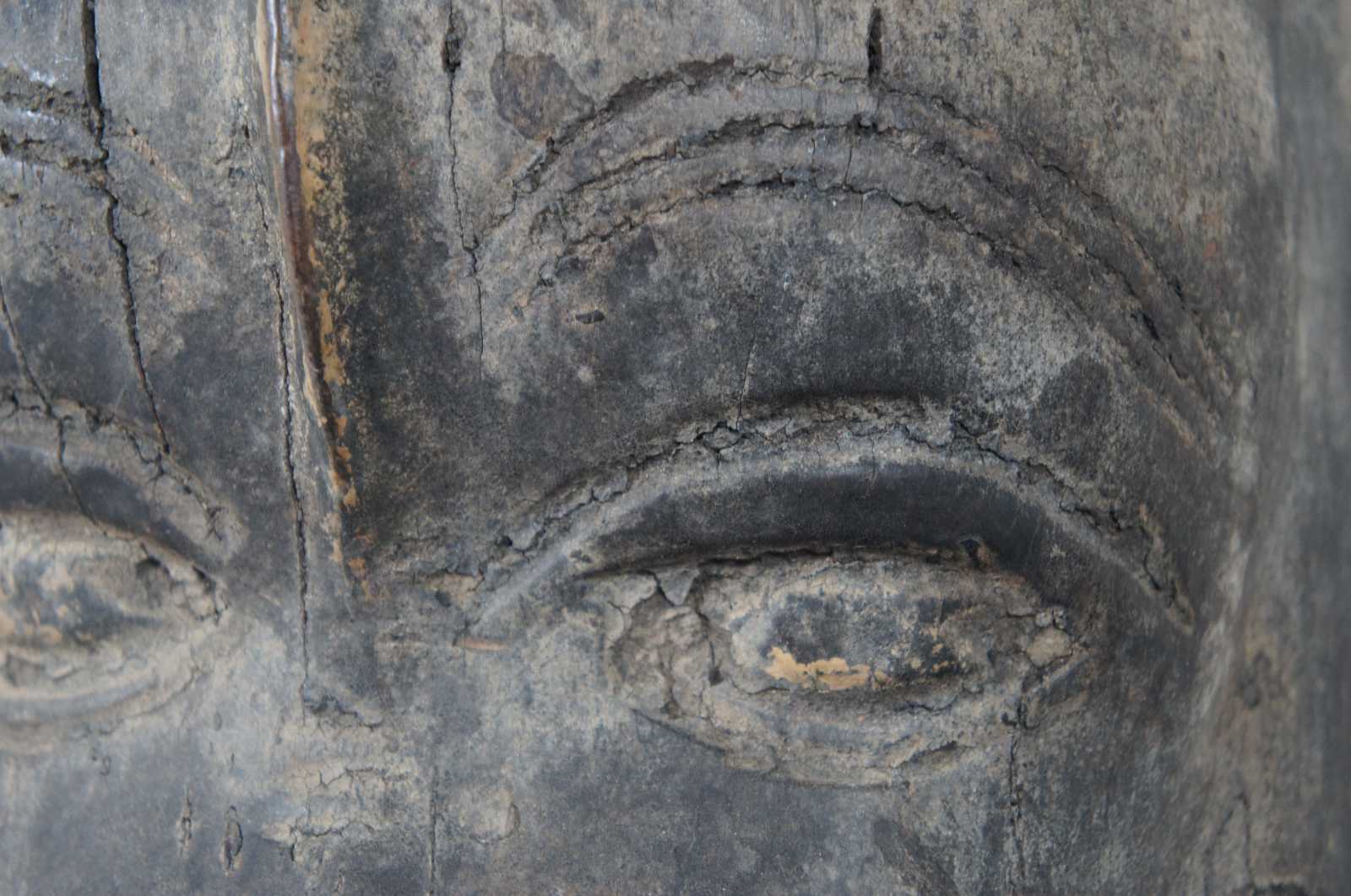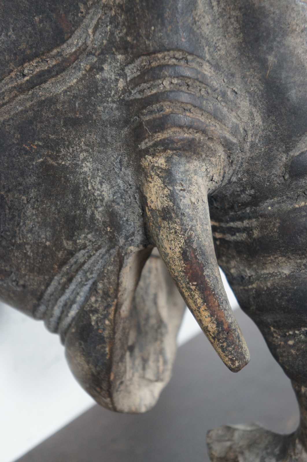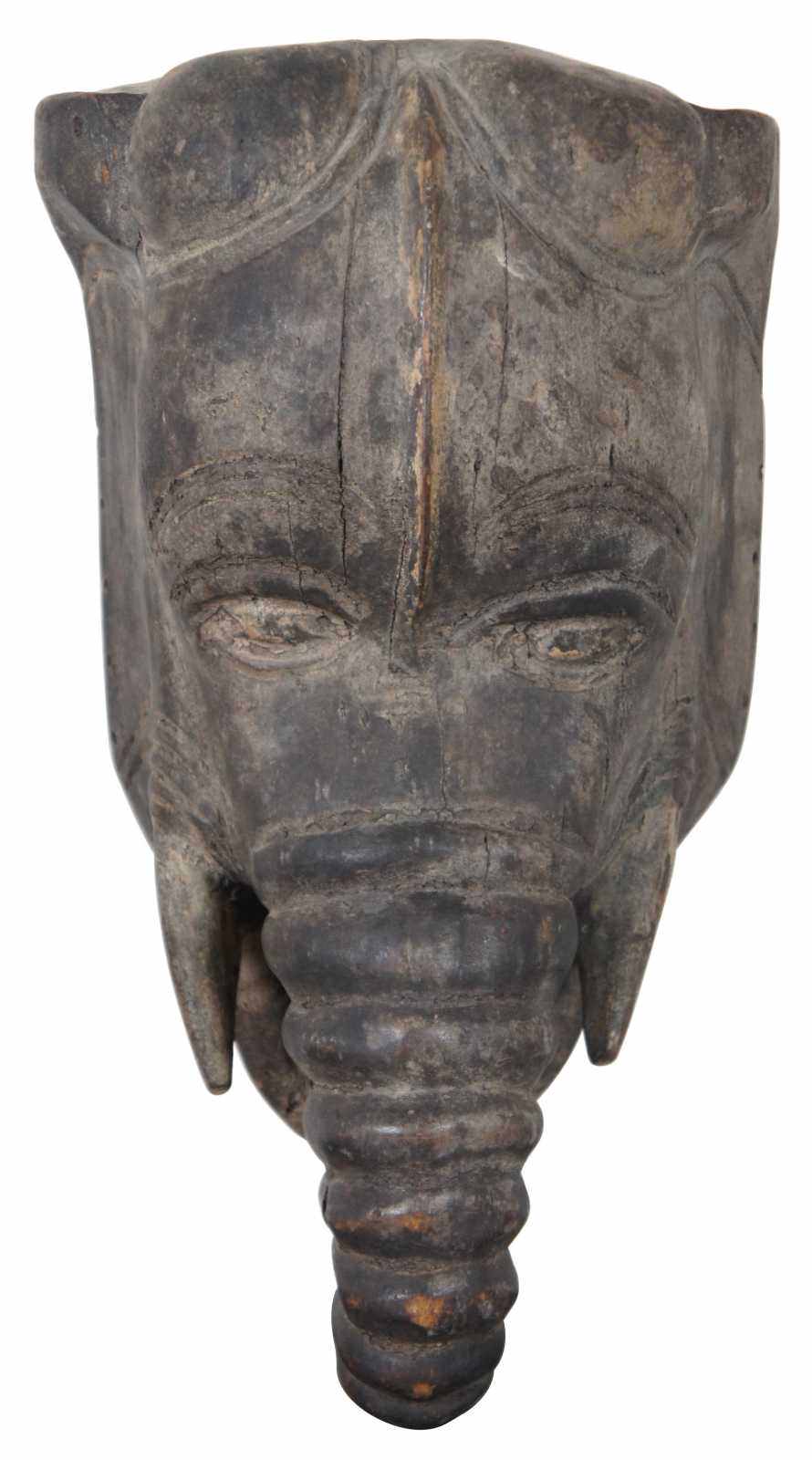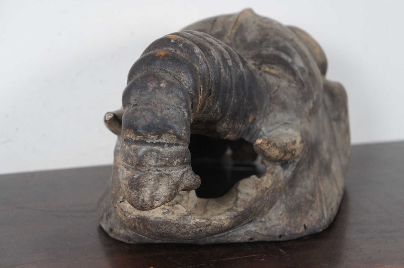 Antique hand carved wooden mask or wall hanging in the shape of an Indian elephant with wrinkled trunk and short tusks.