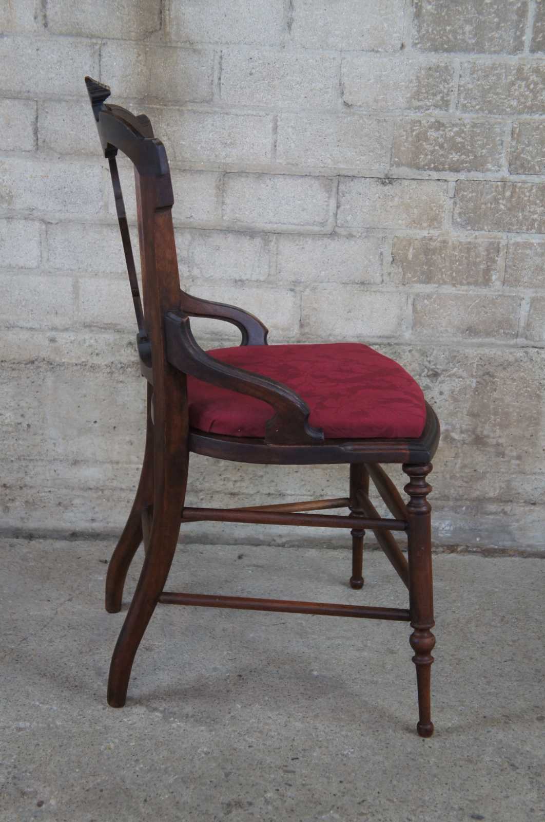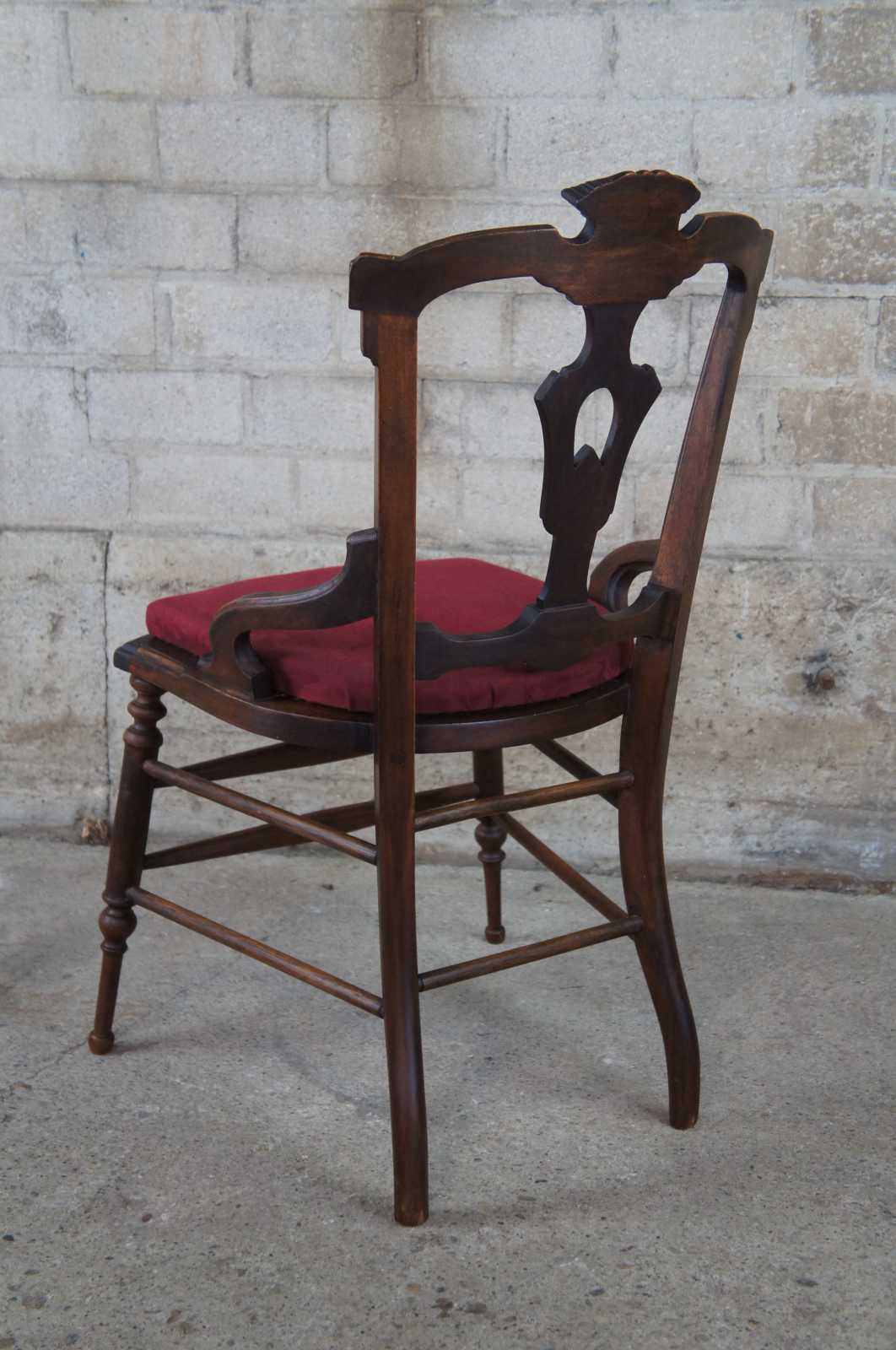 Antique Victorian Eastlake dining parlor chair. Made of walnut featuring ornate design with carved accents and turned legs.