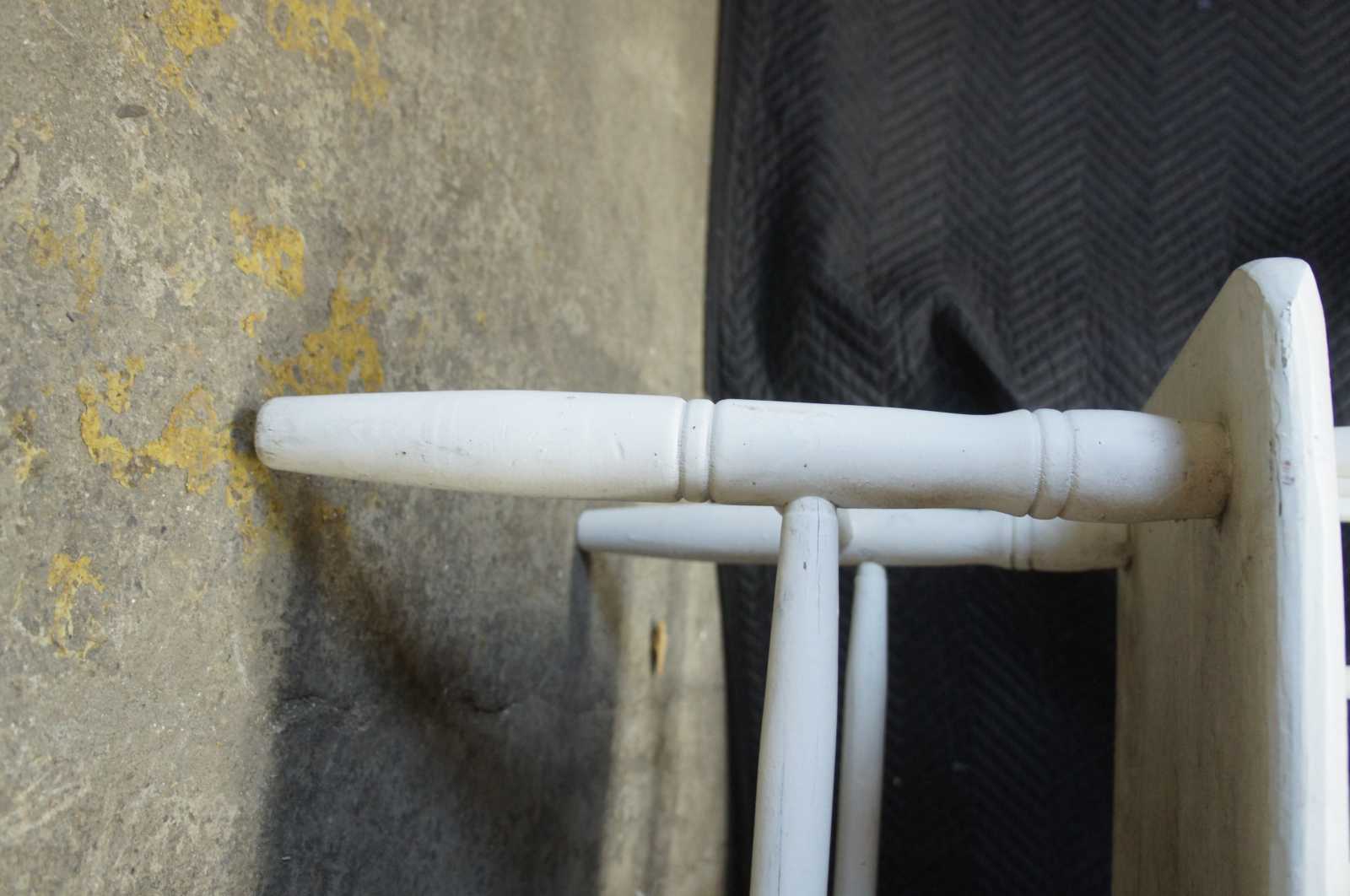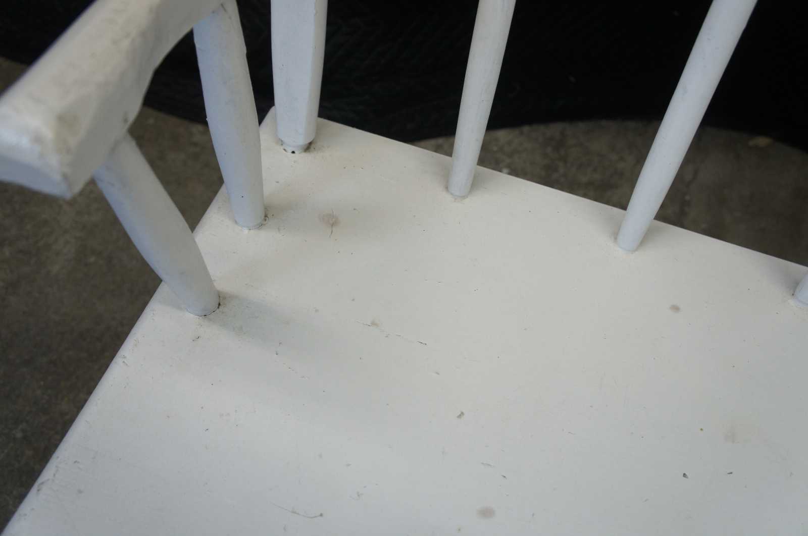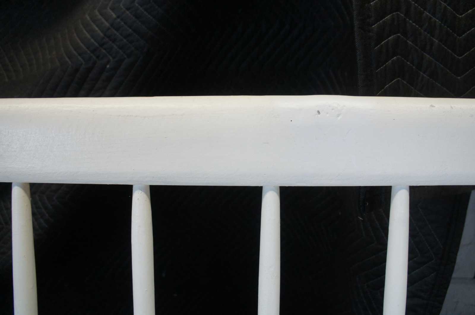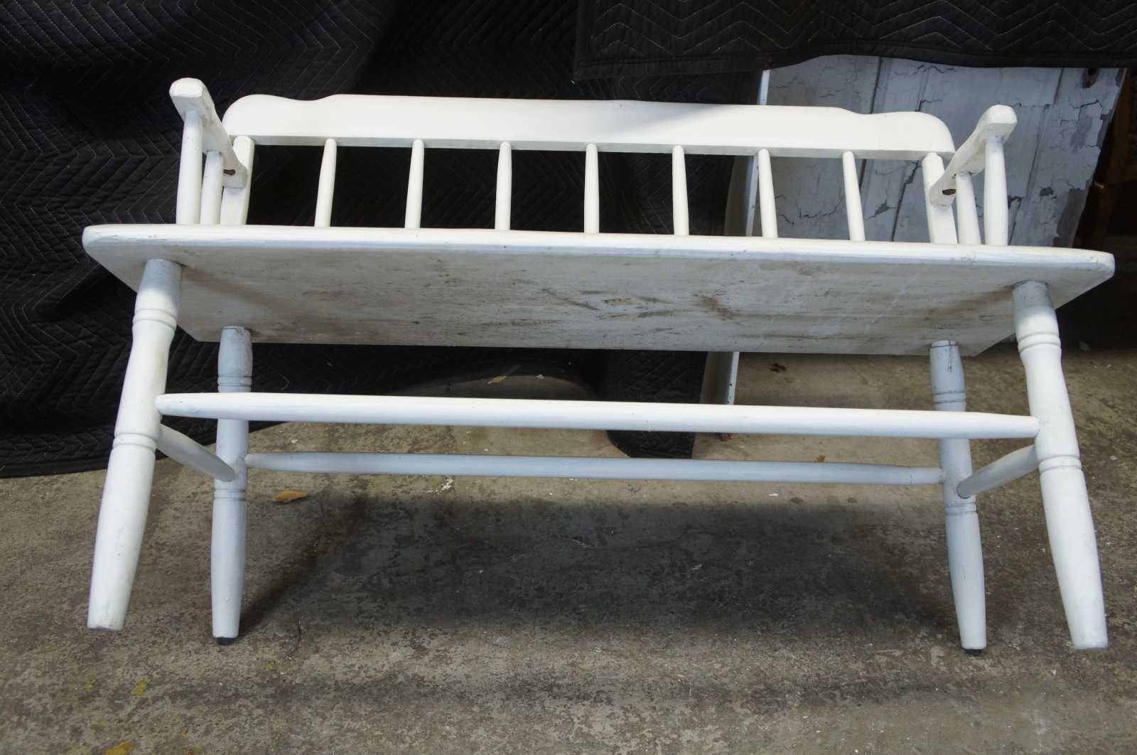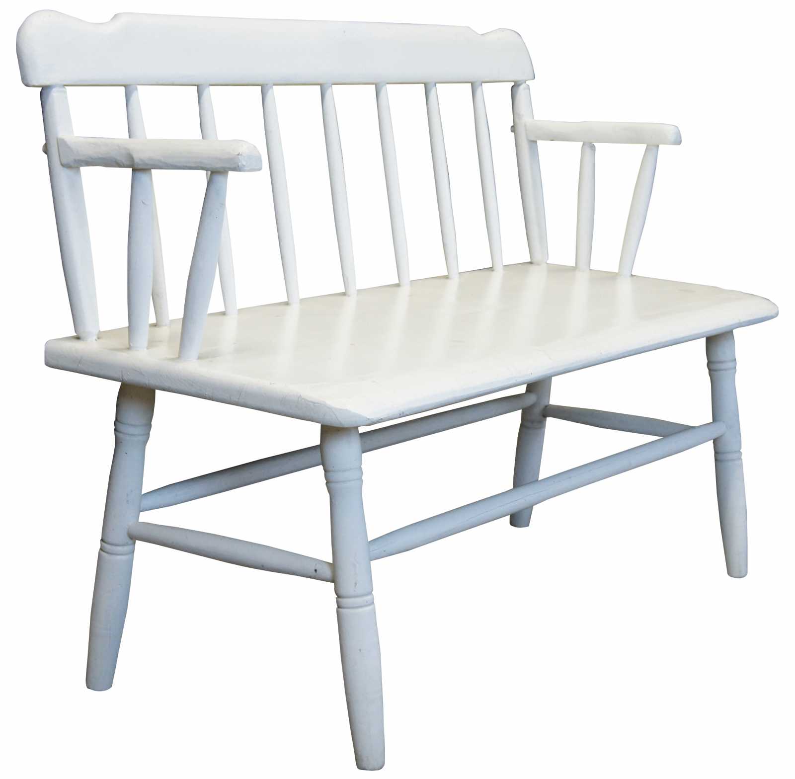 Primitive antique windsor style bench. Made from pine with spindled arms and back. Great for use on a patio or inside.