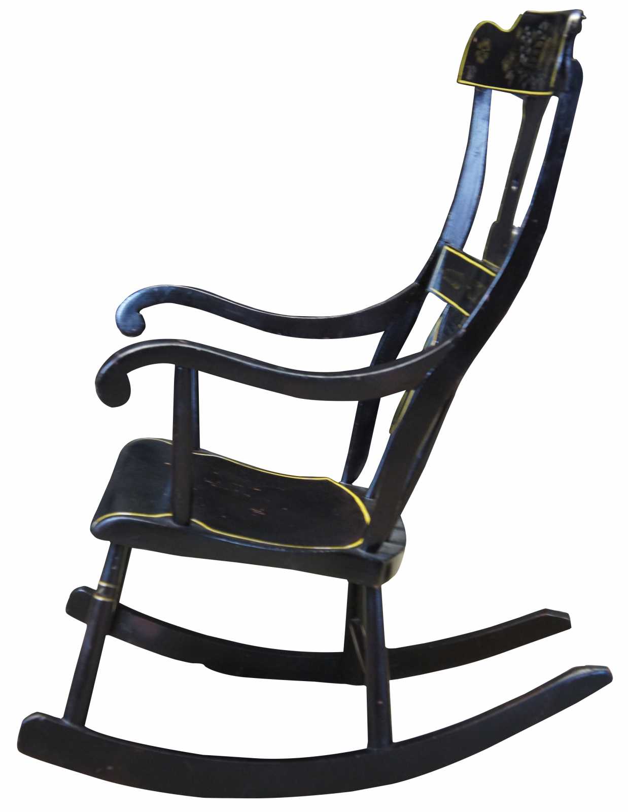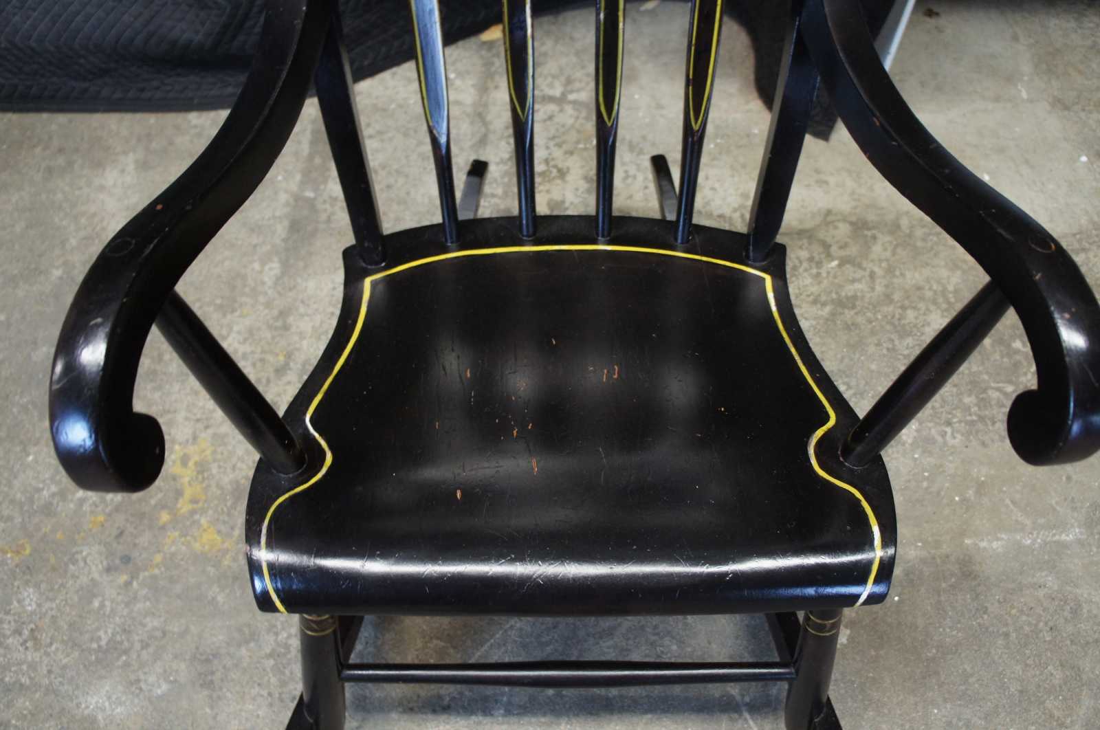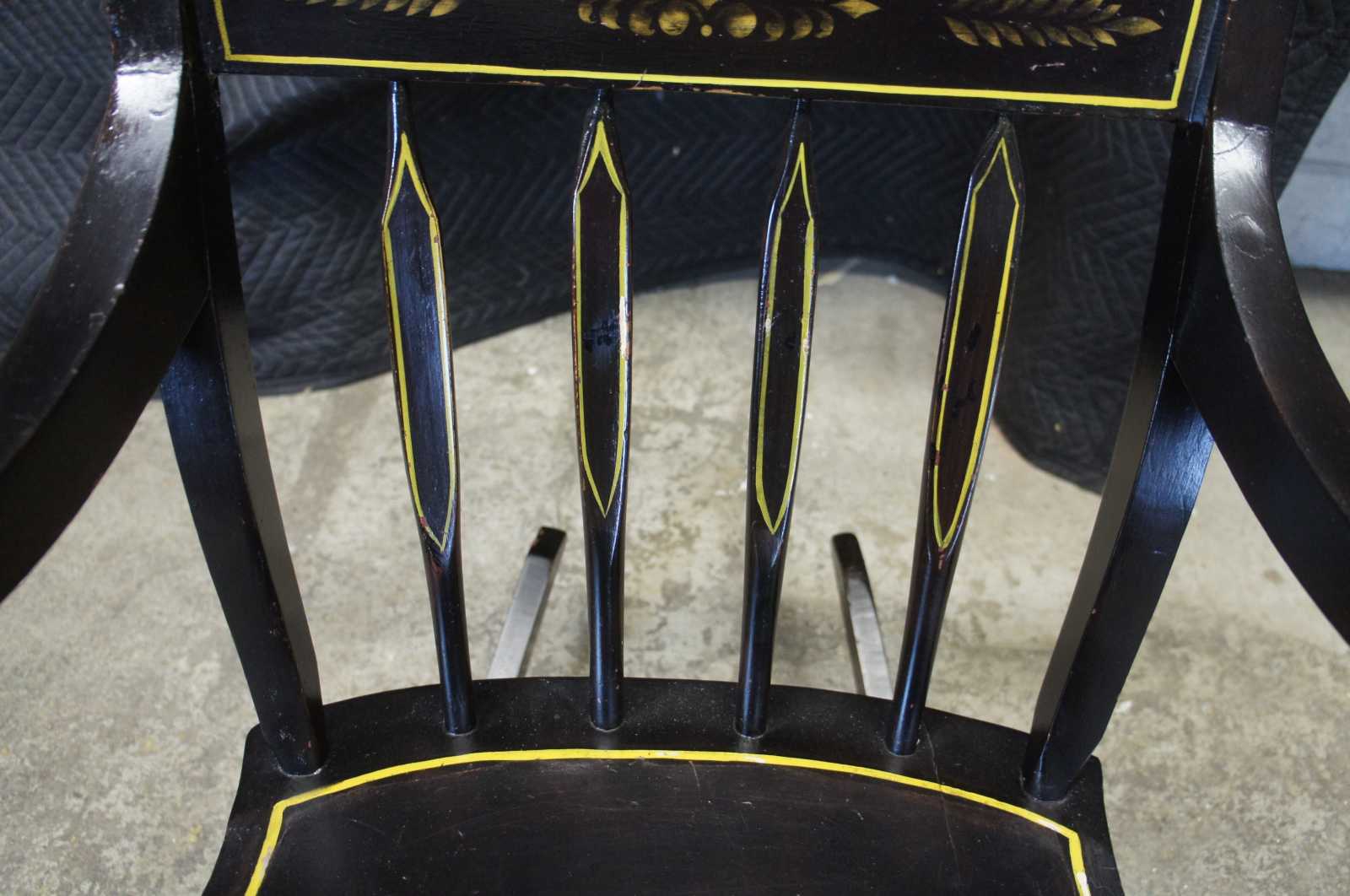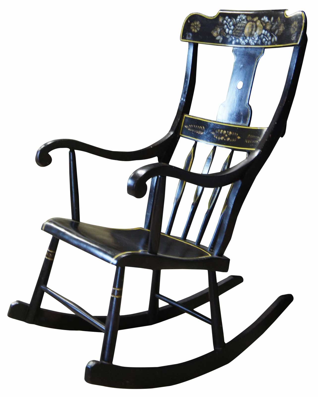 Antique 19th century Boston rocker. Features a black painted finish with hand stencilled fruit and flower deisgns. Includes a contoured rail over a pierced splat and lower rail over spindles leading to scrolled arms and a shaped seat.