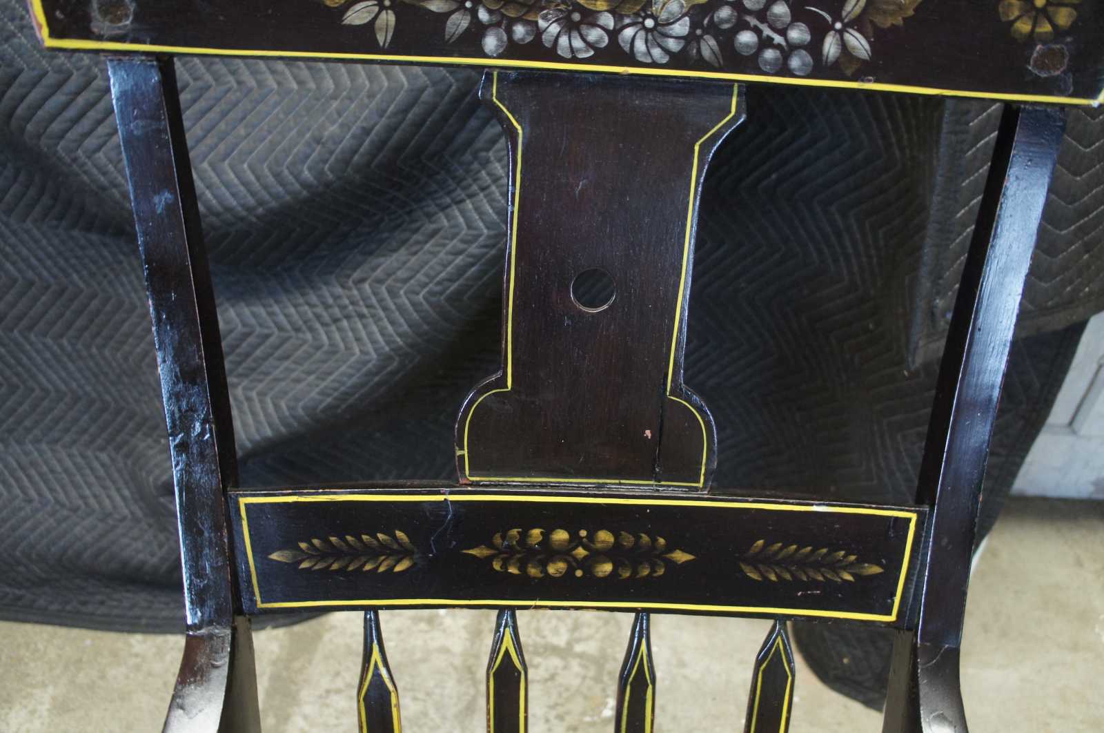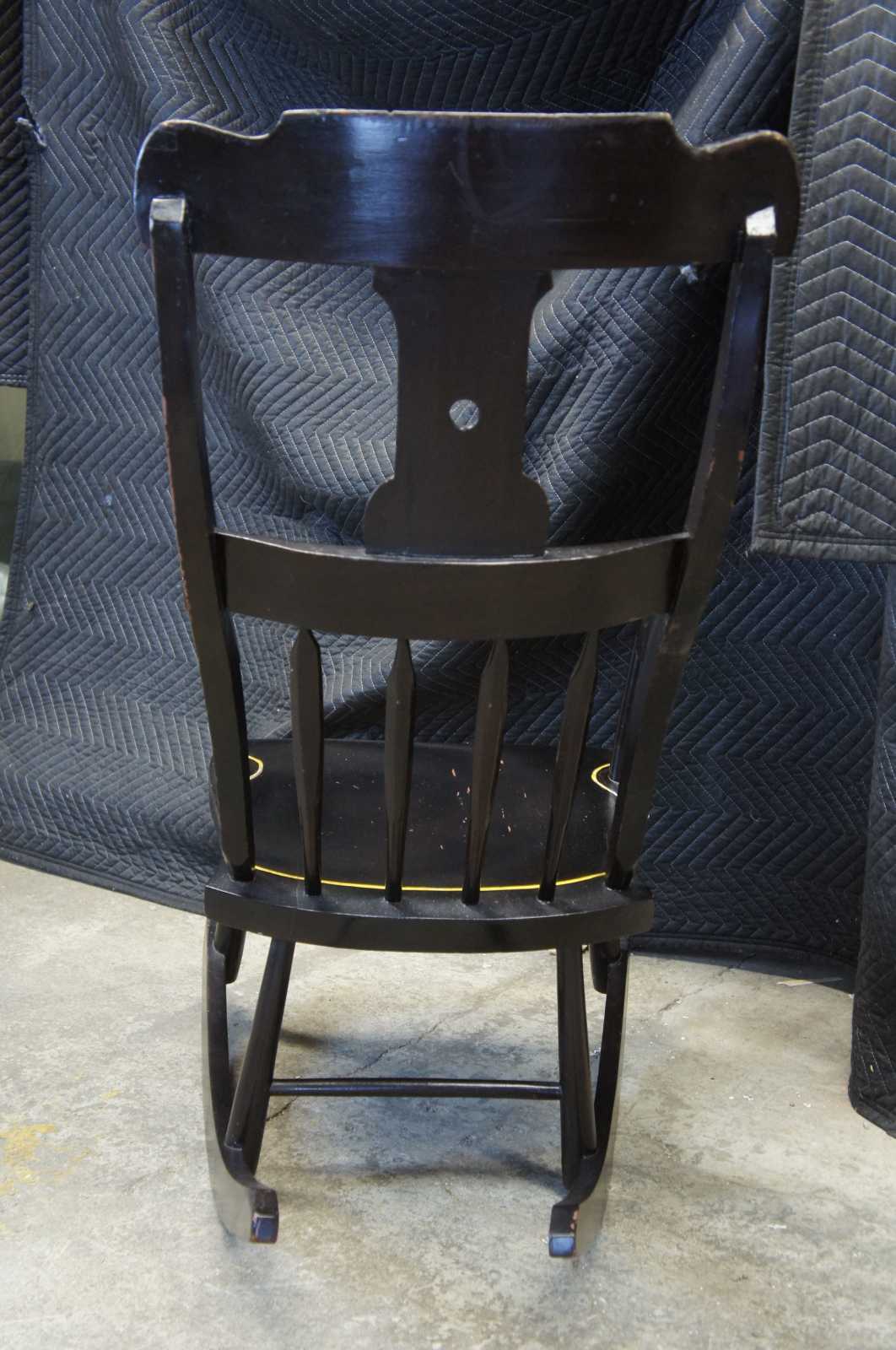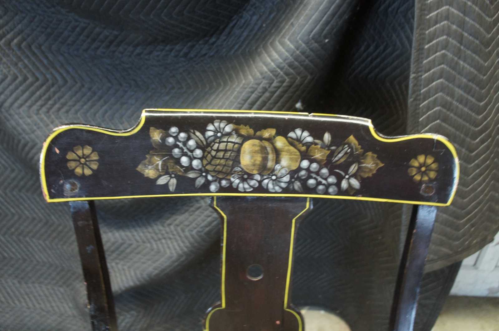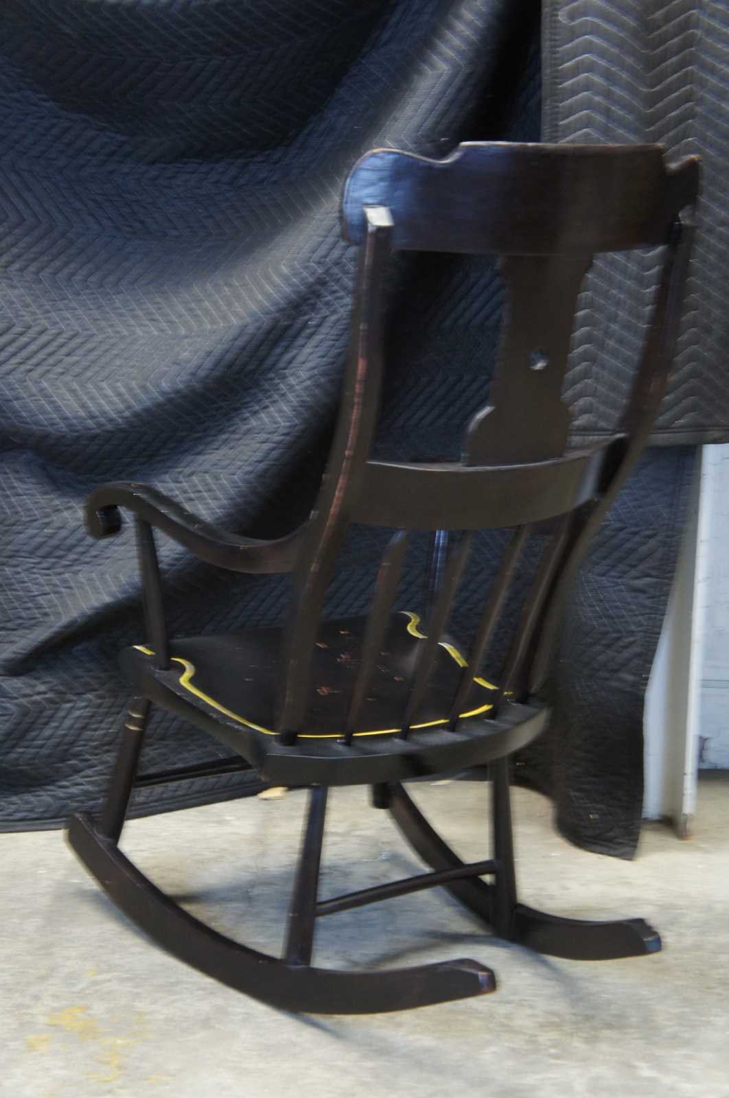 Antique 19th century Boston rocker. Features a black painted finish with hand stencilled fruit and flower deisgns. Includes a contoured rail over a pierced splat and lower rail over spindles leading to scrolled arms and a shaped seat.