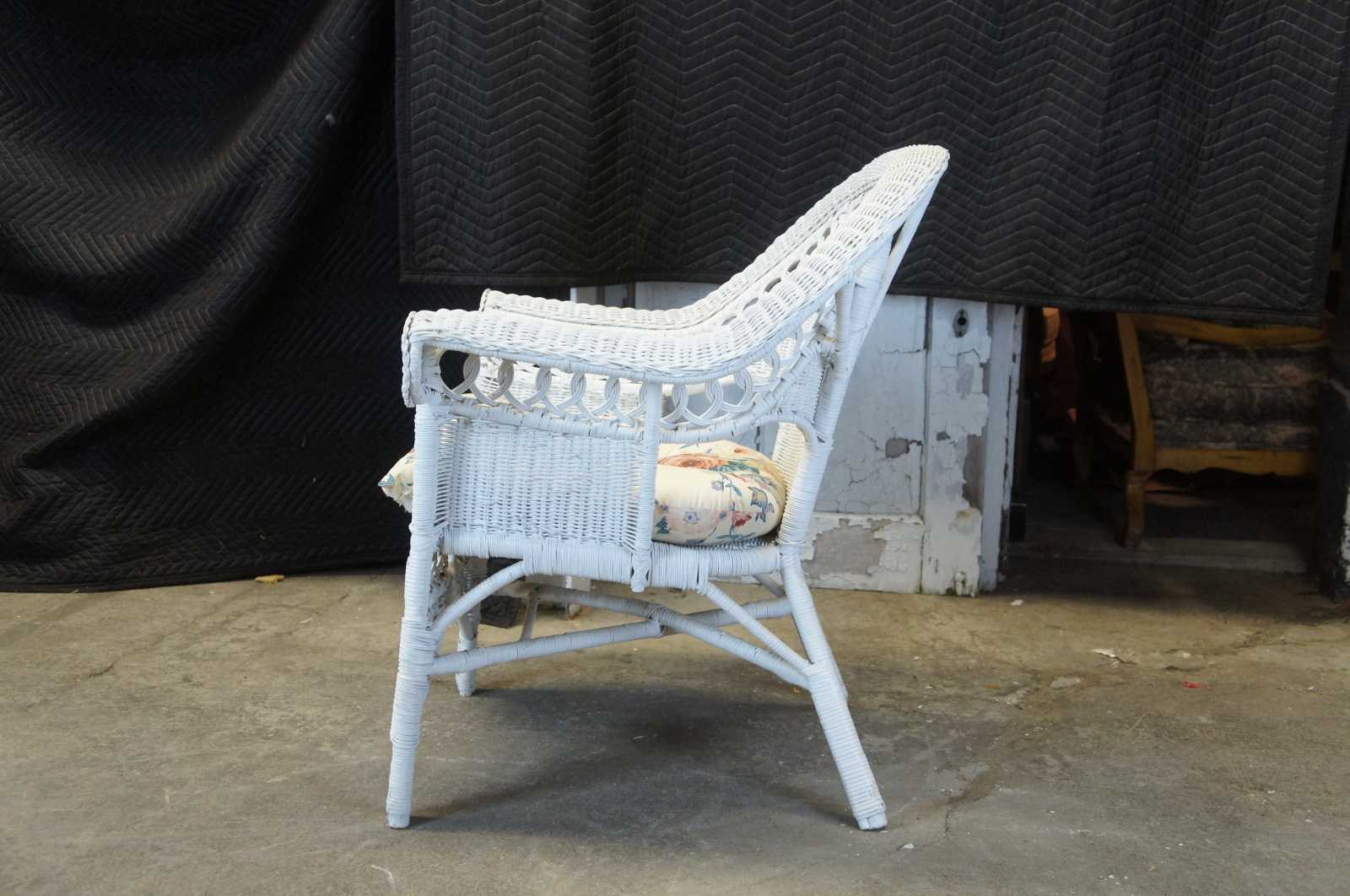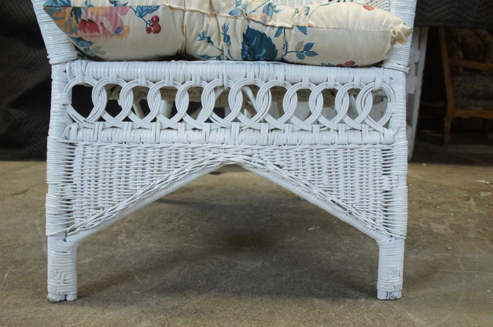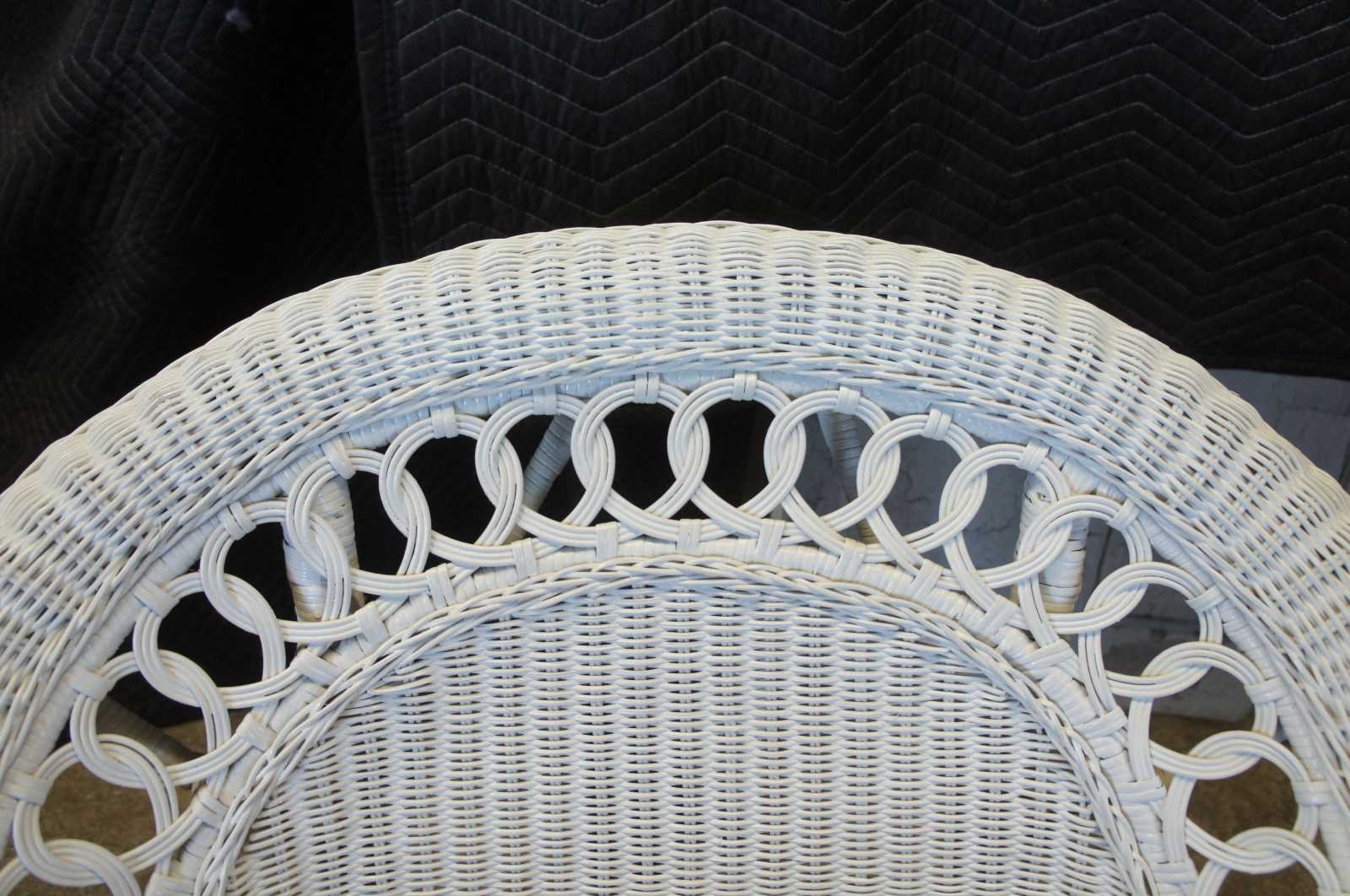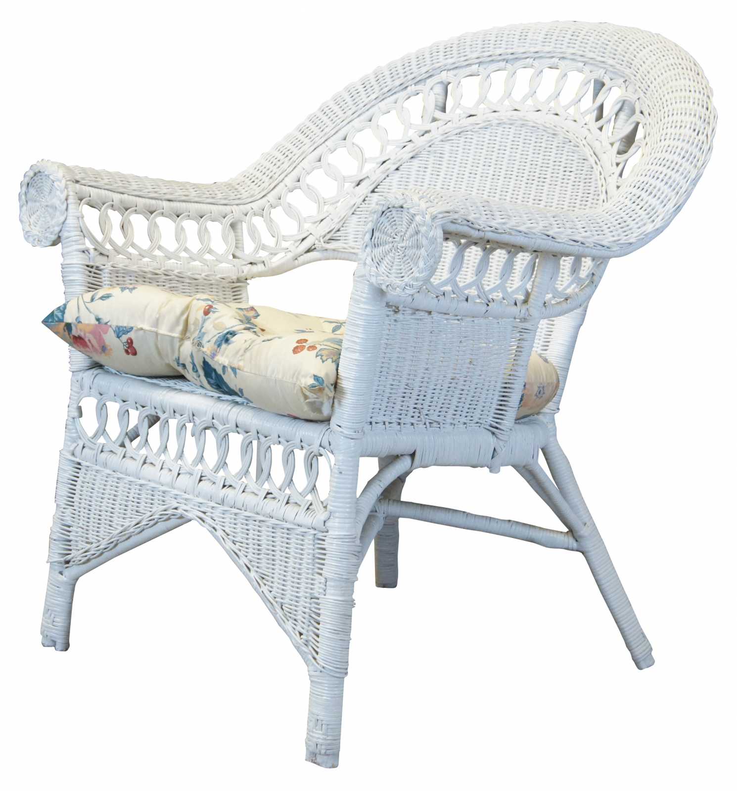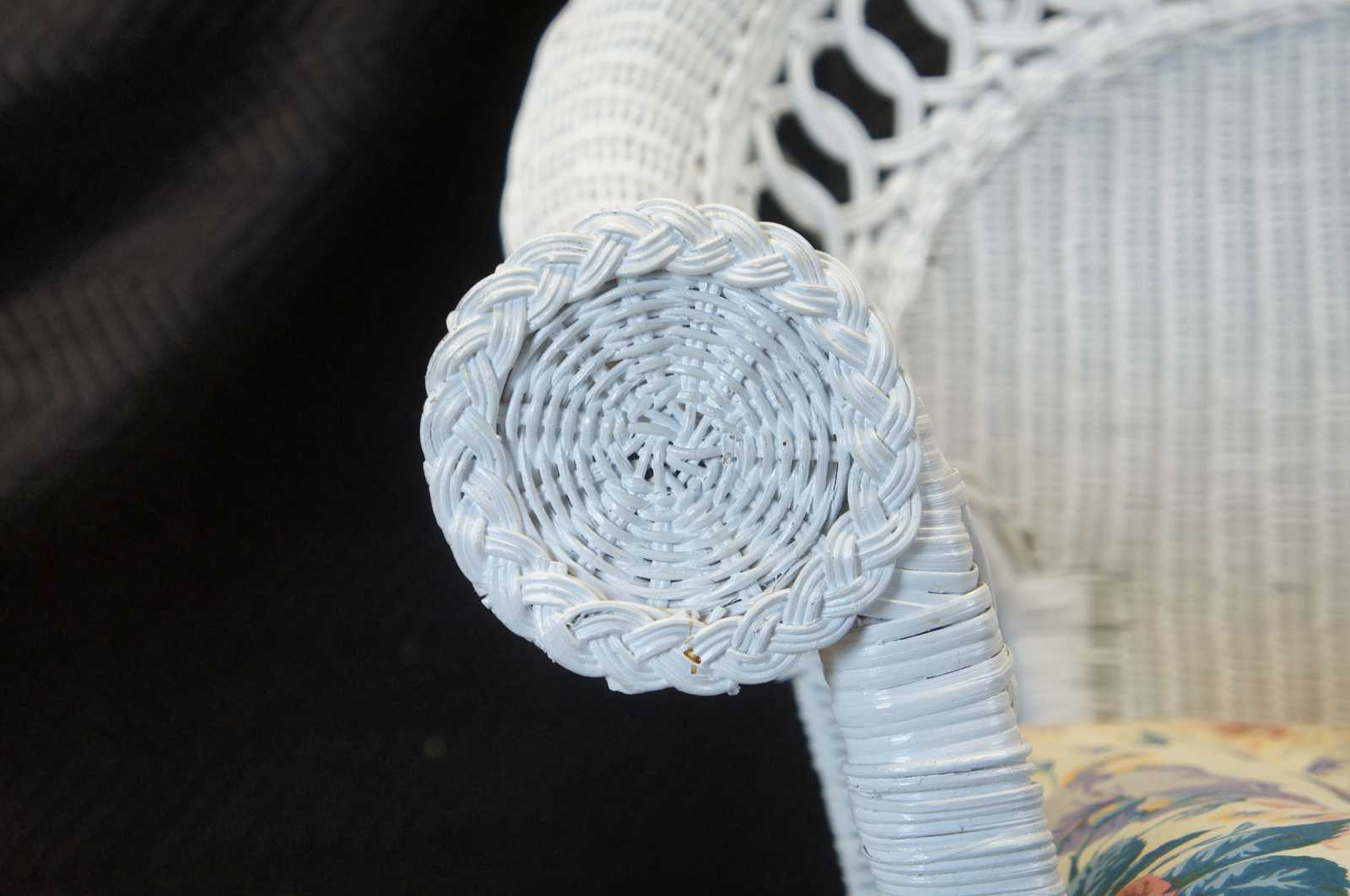 Two vintage bamboo, wicker and rattan armchairs featuring a rolled arm with circular braided wheel accent and interlocking rattan loop design.