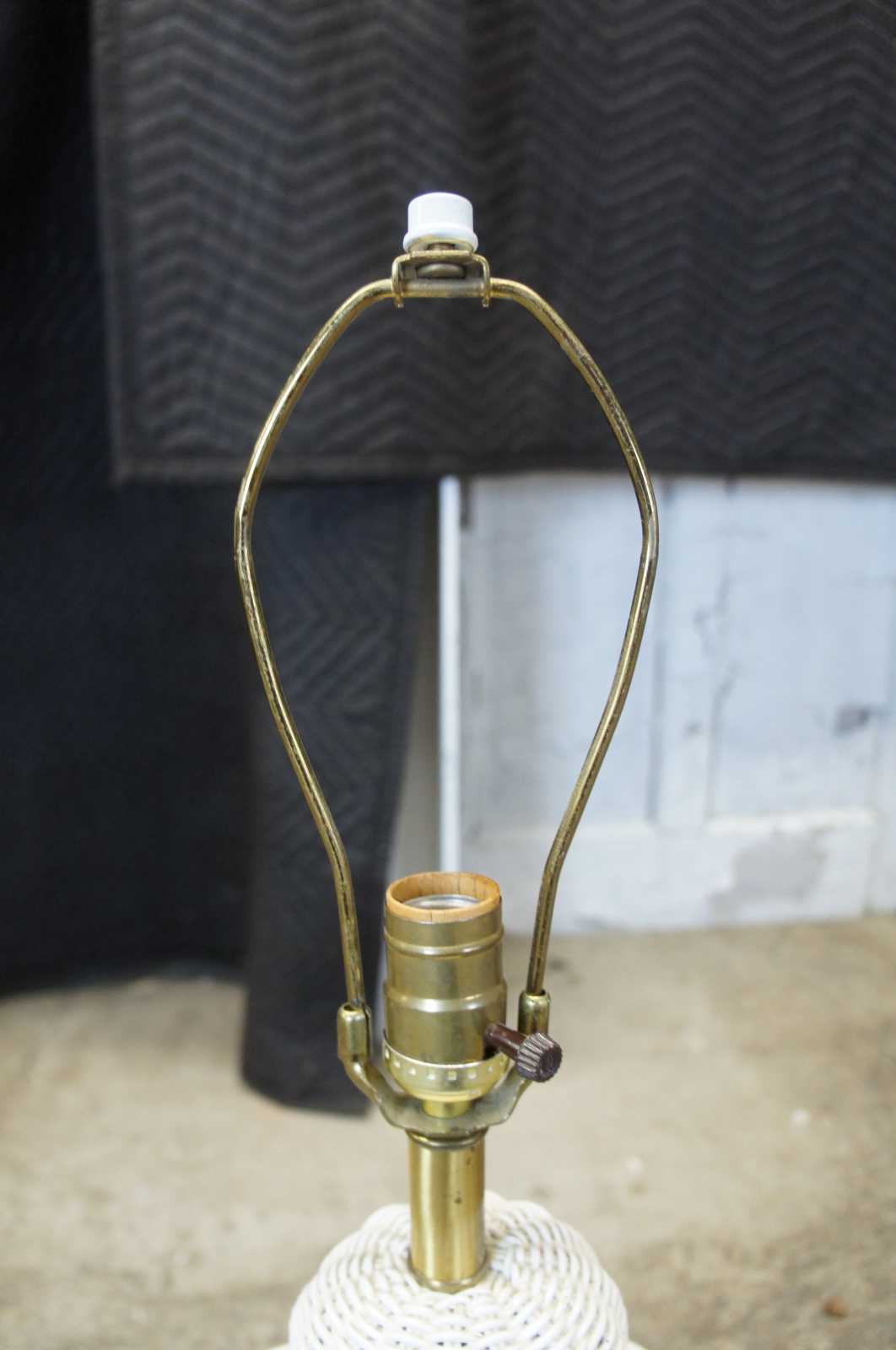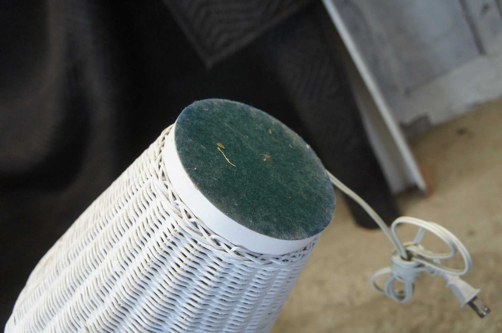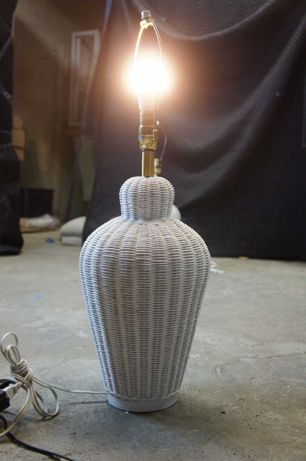 Vintage white wicker urn shaped table lamps.
