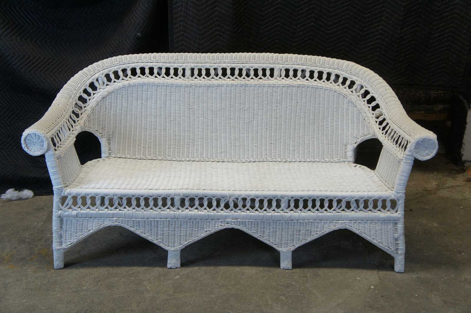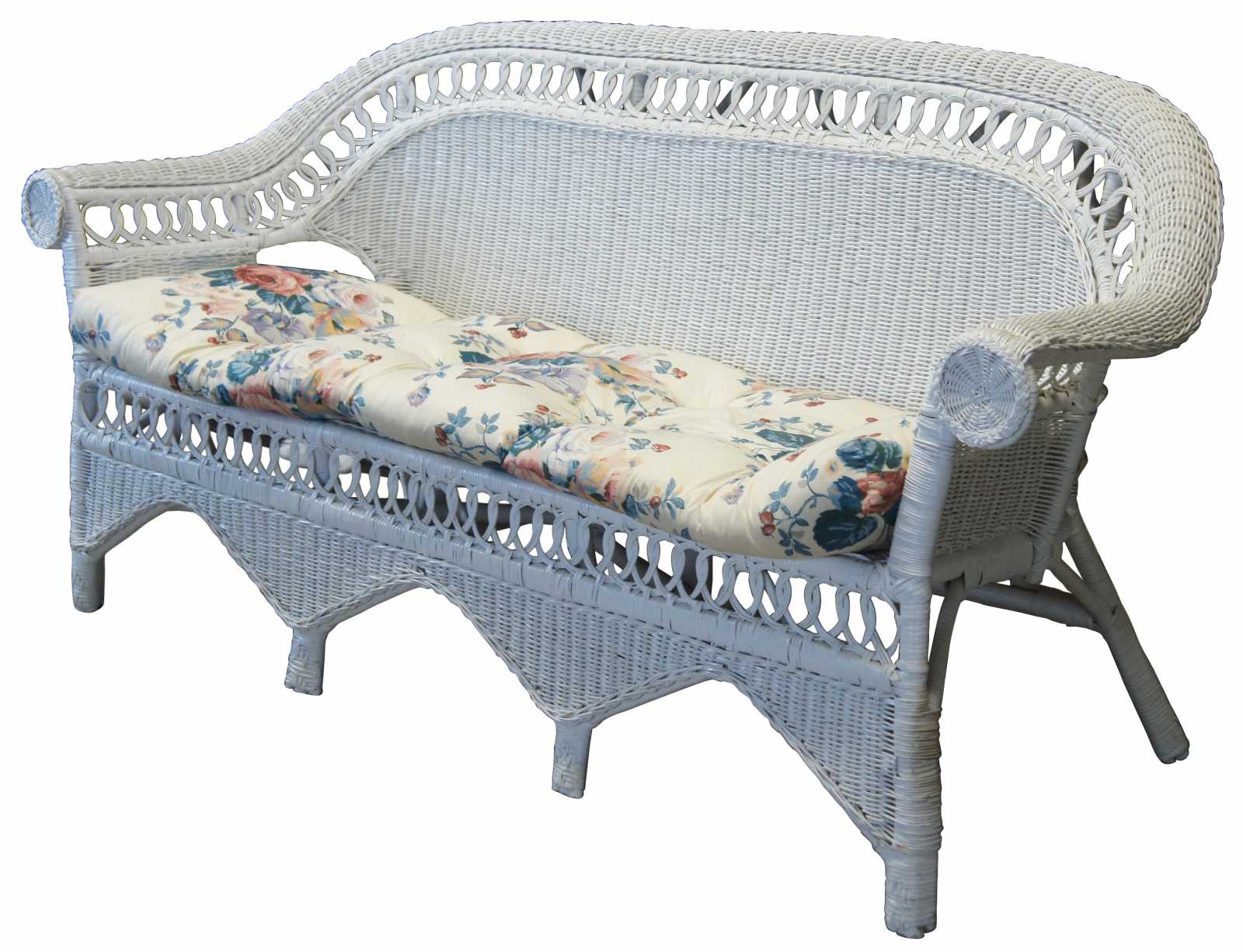 Circa 1940s wicker sofa. Features a long rolled arm with circular braided wheel accent and interlocking rattan loop design. Includes a yellow floral tufted cushion.
