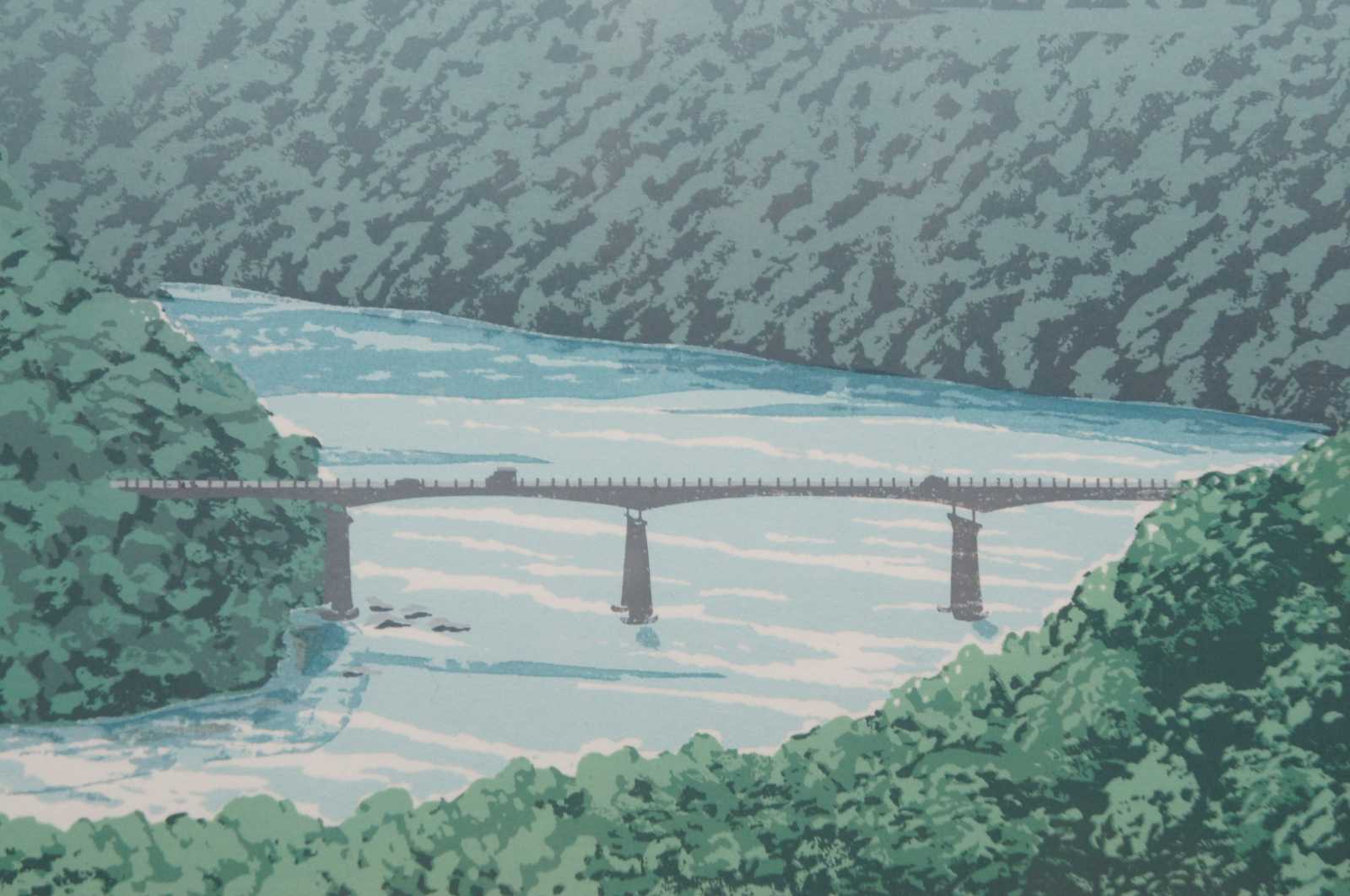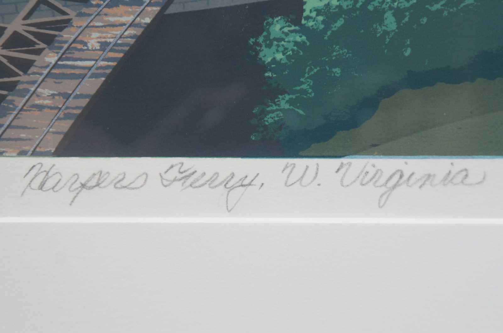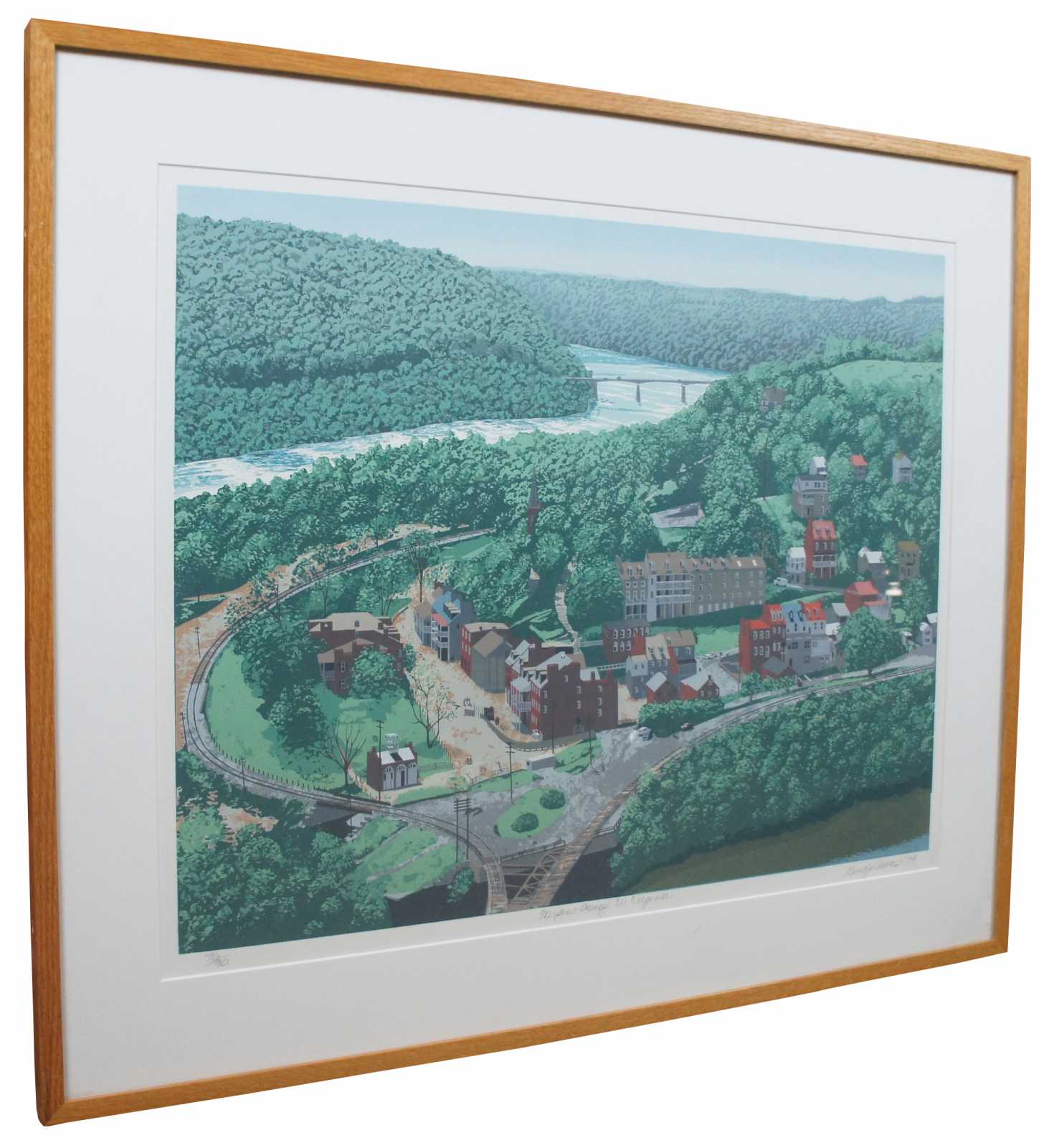 Vintage serigraph landscape print of “Harpers Ferry, W. Virginia” by Randy Owens, 1979, pencil signed and numbered 76/90. A rare departure from his most common theme of racing cars.