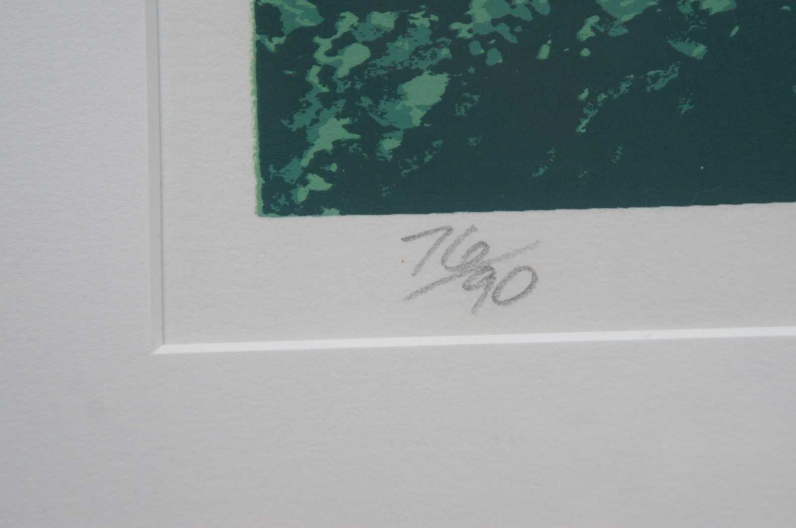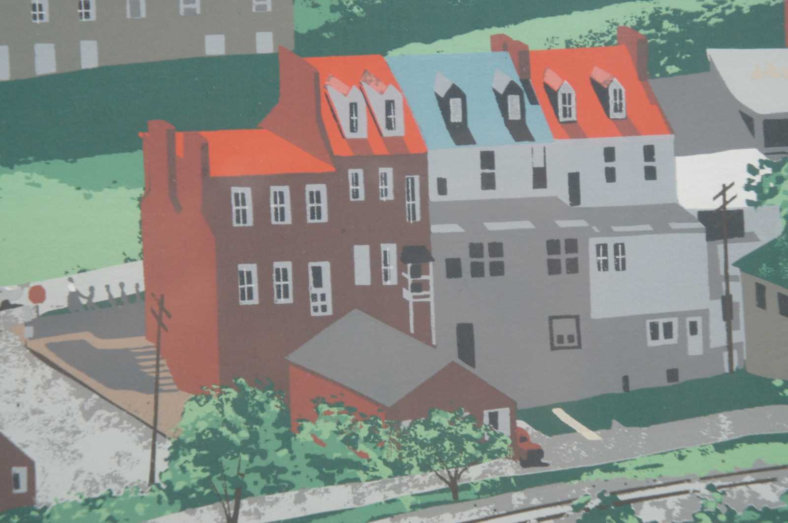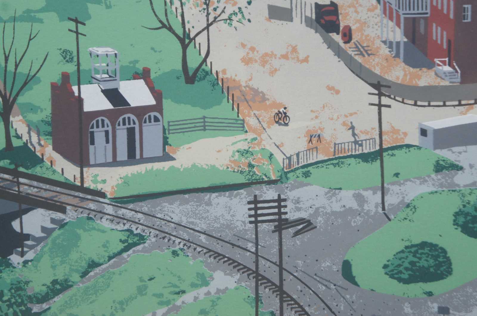 Vintage serigraph landscape print of “Harpers Ferry, W. Virginia” by Randy Owens, 1979, pencil signed and numbered 76/90. A rare departure from his most common theme of racing cars.