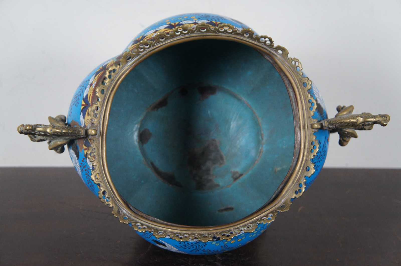A monumental late 19th century Cloisonné jardiniere or urn with a lobed melon form body decorated with flowers and cranes on a blue ground, footed and handled with French bronze figures and pierced designs.