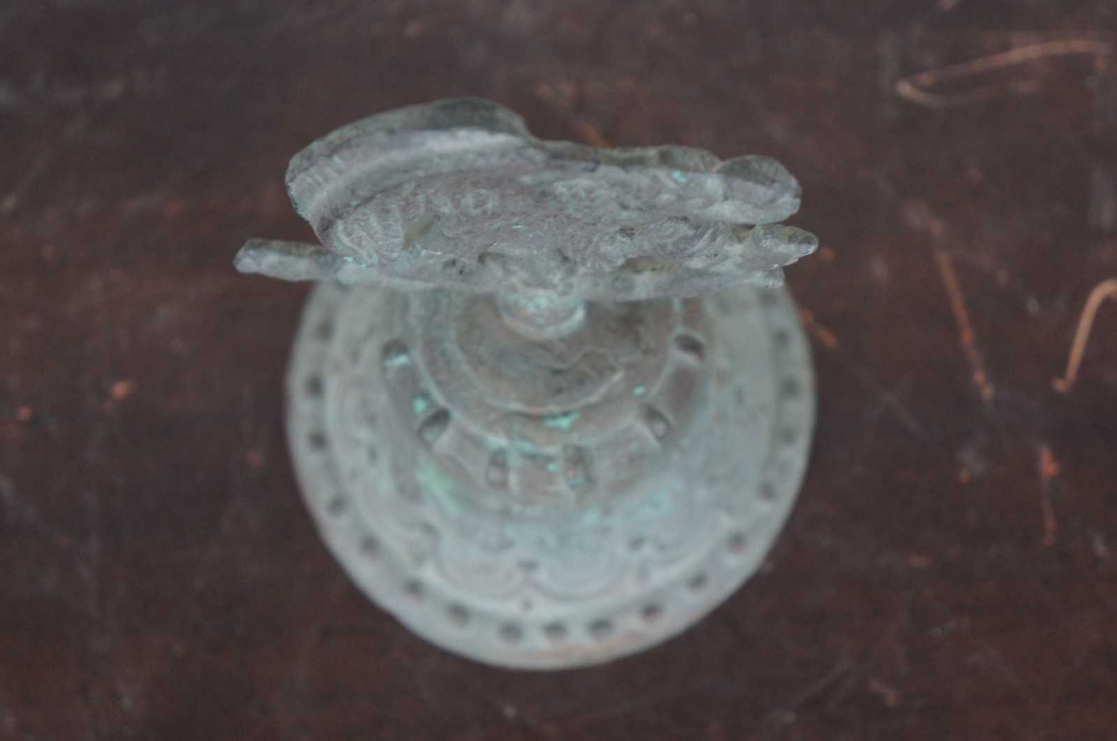 Antique bronze hand bell topped with the Mexican coat of arms, based on the Aztec symbol for Tenochtitlan (now Mexico City), the center of the Aztec empire. It recalls the legend of an eagle sitting on a cactus while devouring a serpent that signaled to the Aztecs where to found their city, Tenochtitlan.