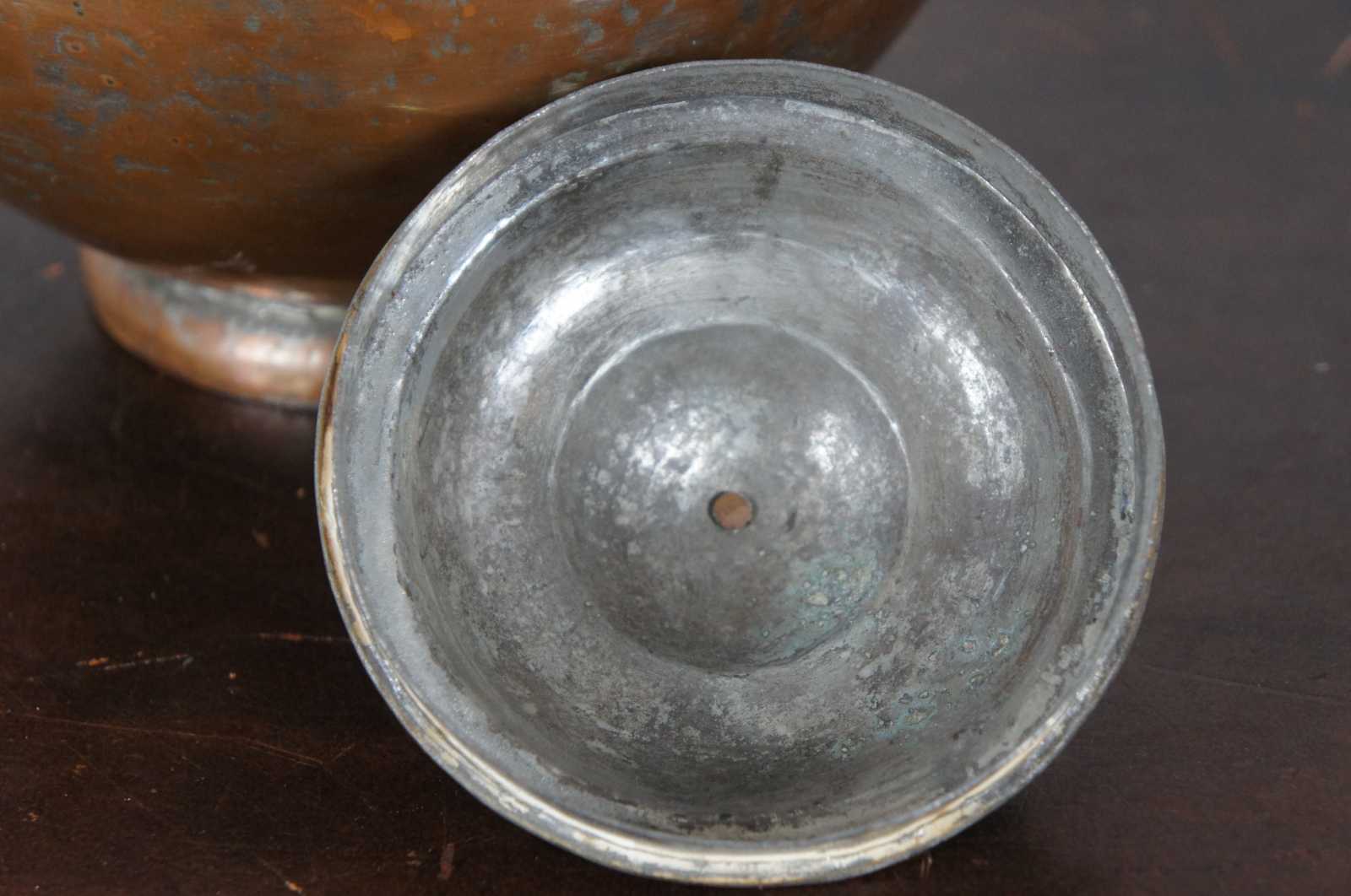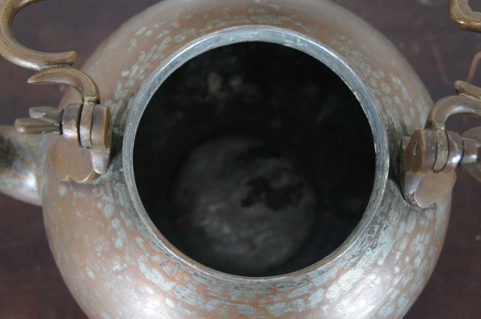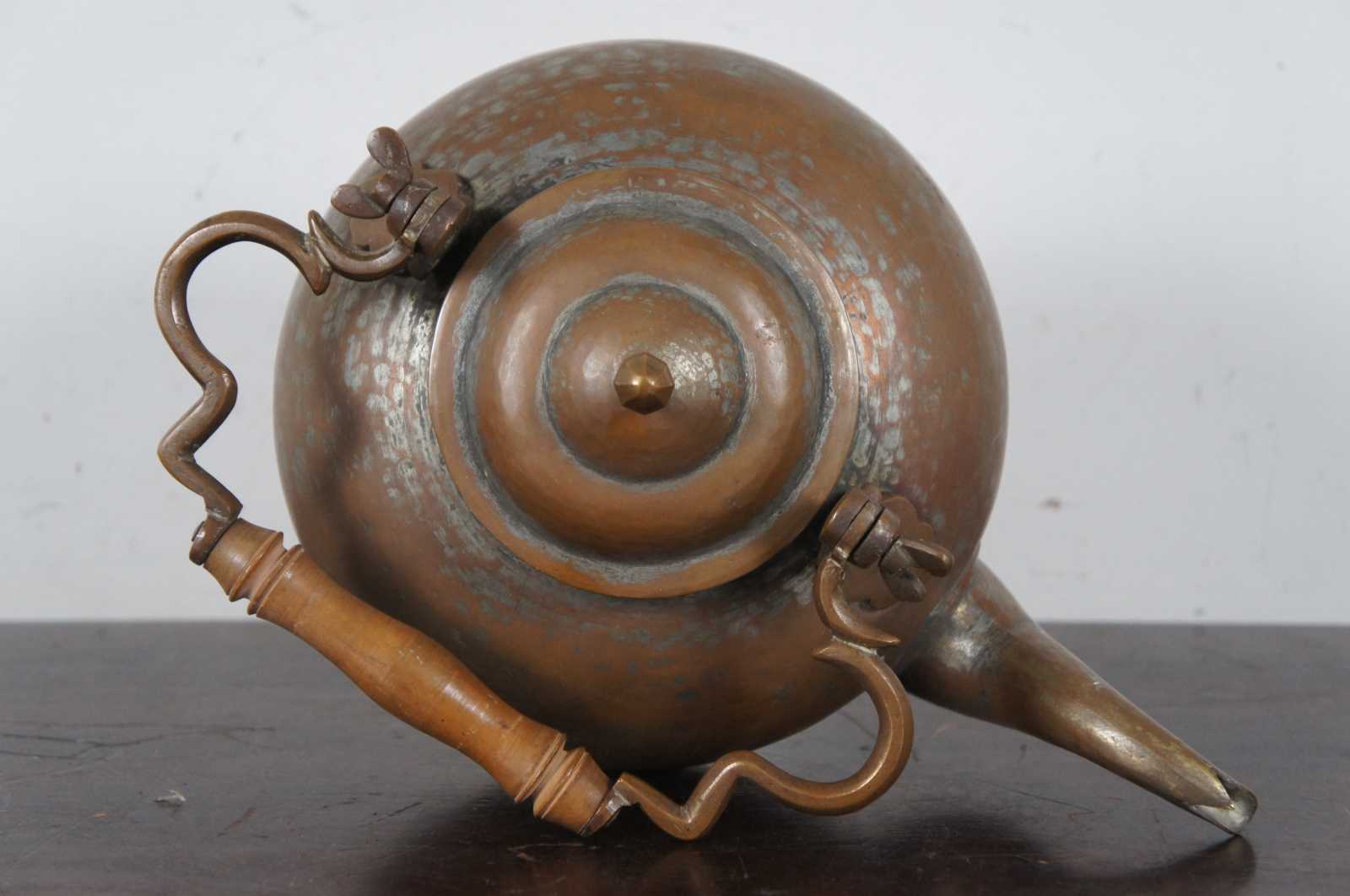 Antique copper clad gooseneck tea kettle with lid and turned wood handle.