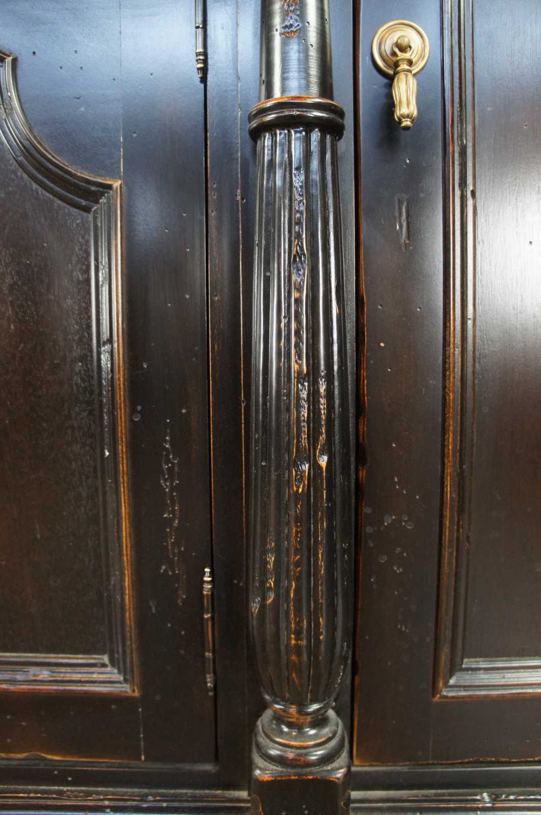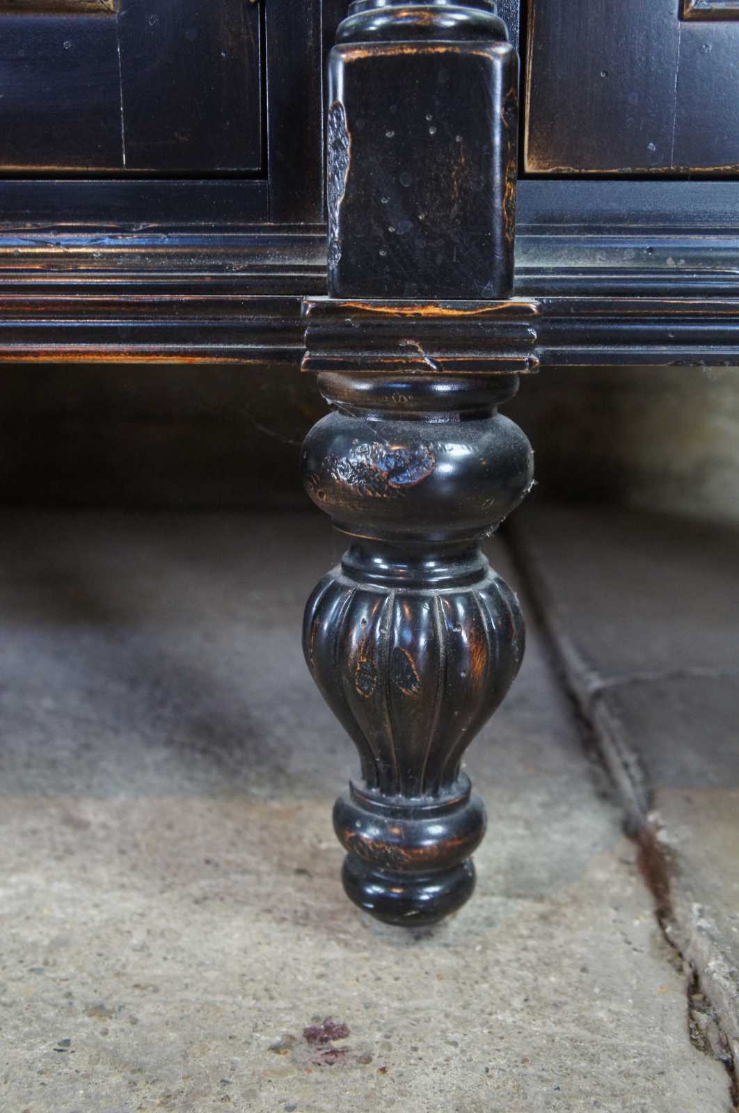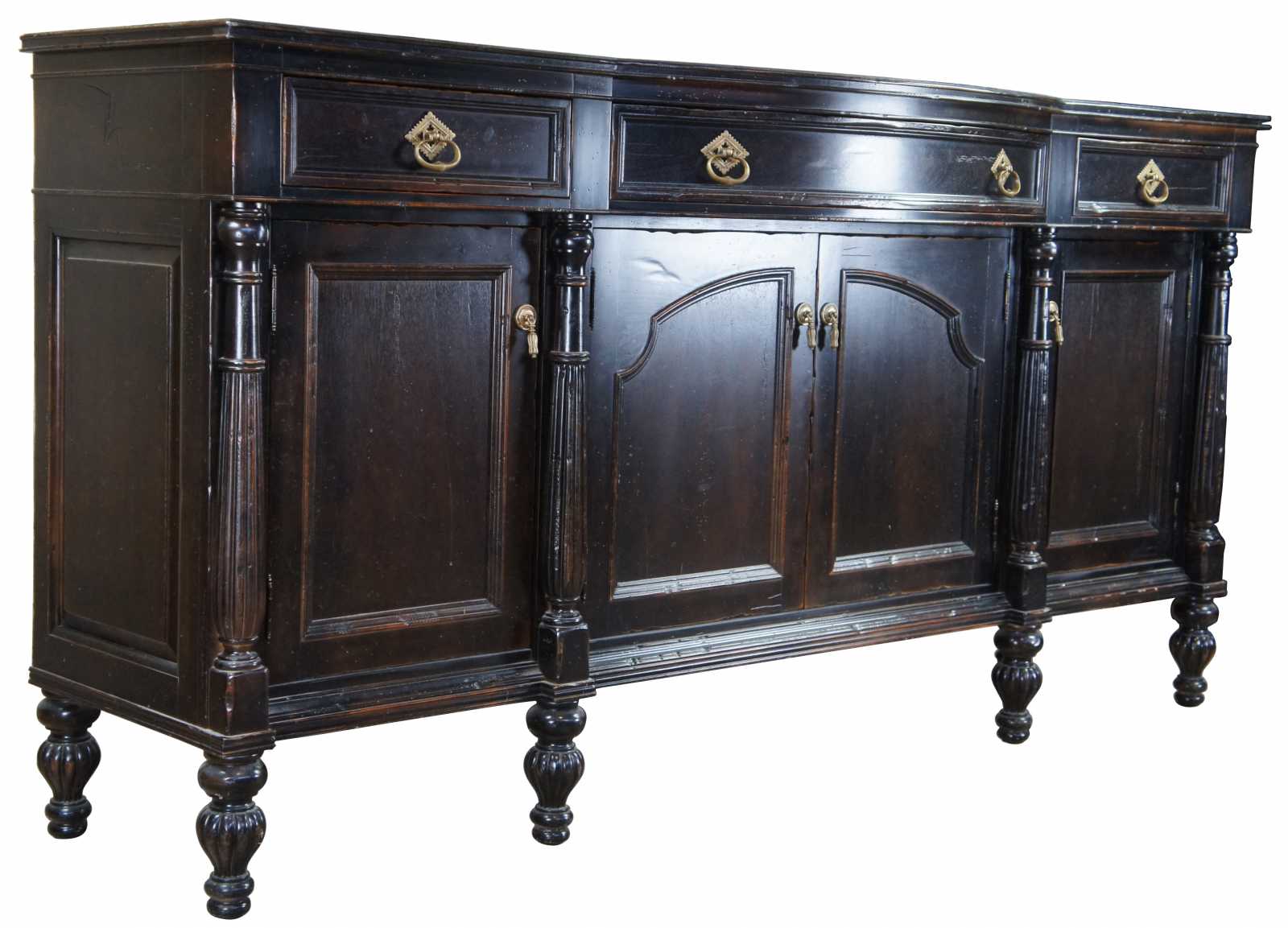 Hickory White bowfront buffet or sidebaord, circa 2000 Features a rectangular form with turned columns and turnip fluted feet. Includes 3 dovetailed drawers and lower cabinets for storage. Finished in distressed black with brown undertones. Traditional styling with French inspiration from Empire and Provincial designs.