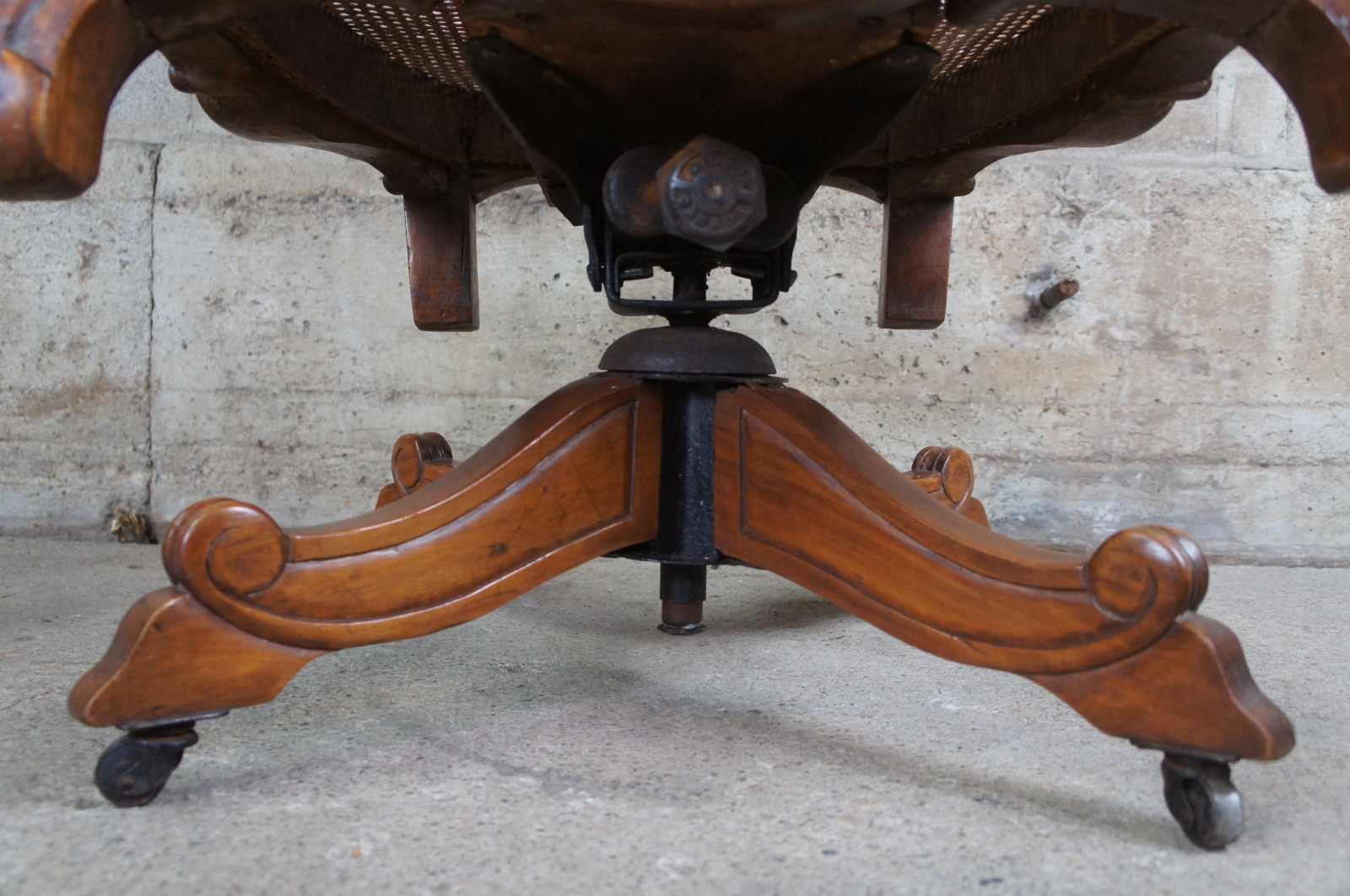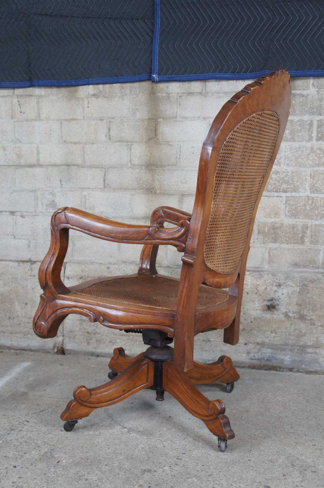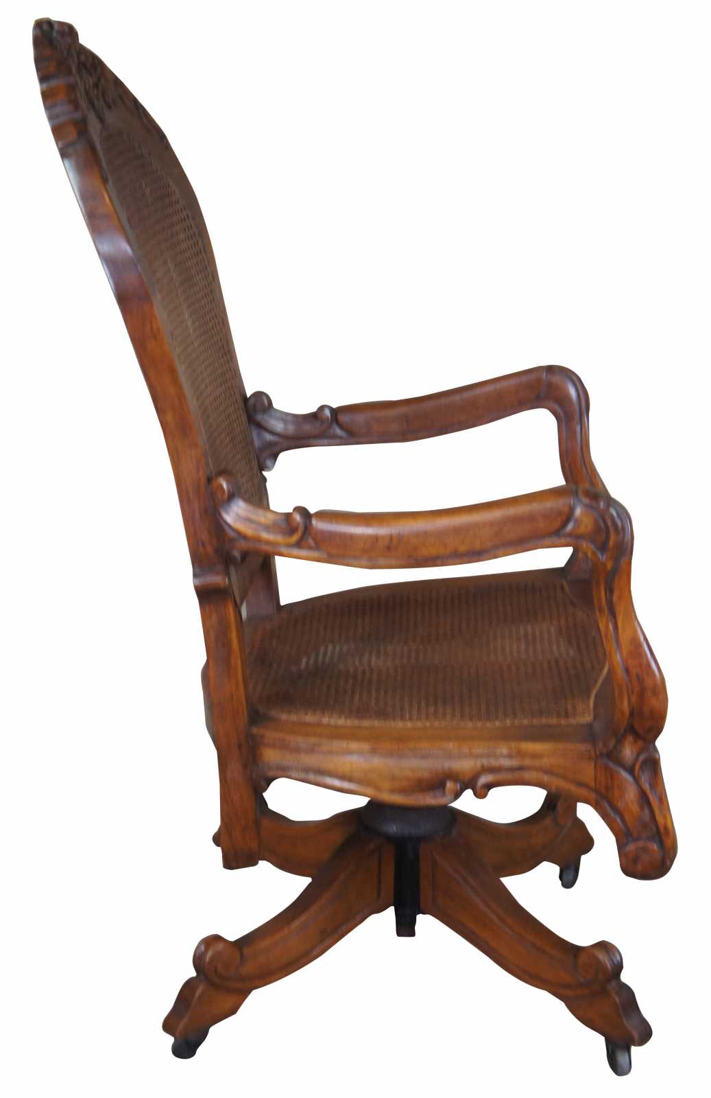 Antique French executive office armchair, circa 1890s. Made of oak featuring carved floral accents, caned seat and double caned back and rolling swivel base. Marked Gilson Canada on industrial base. Sometime before 1900 the company began making chair irons, which is the cast iron piece forming the base center of a swivel chair.