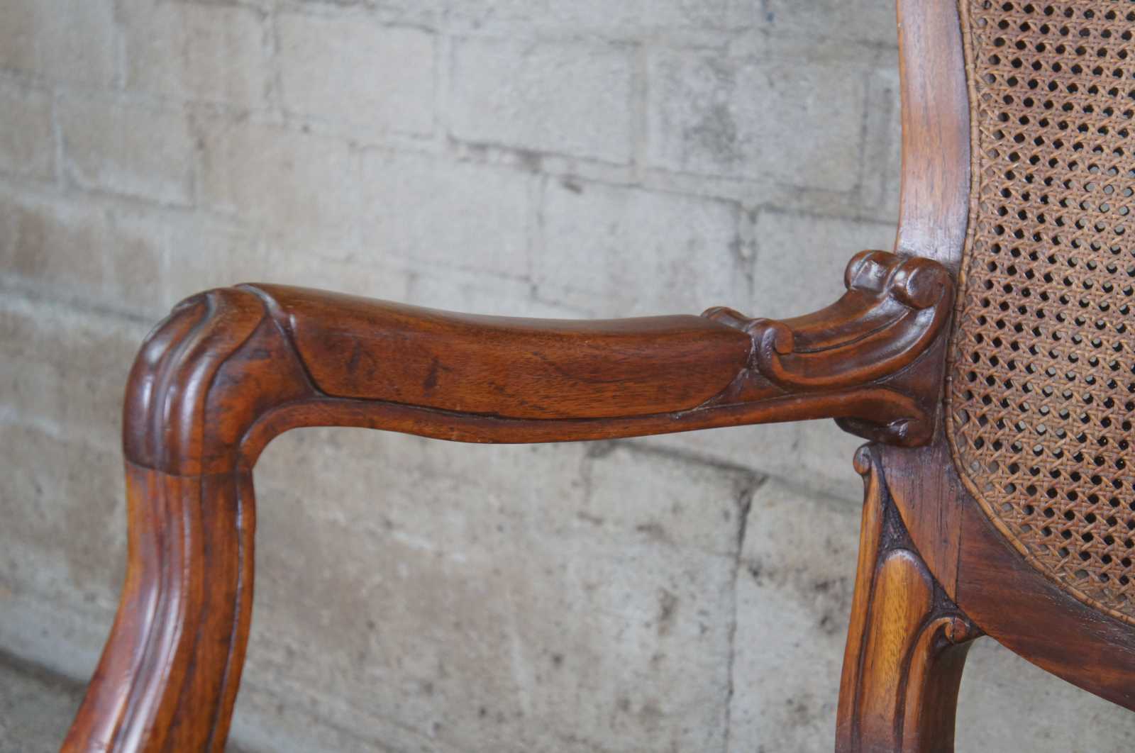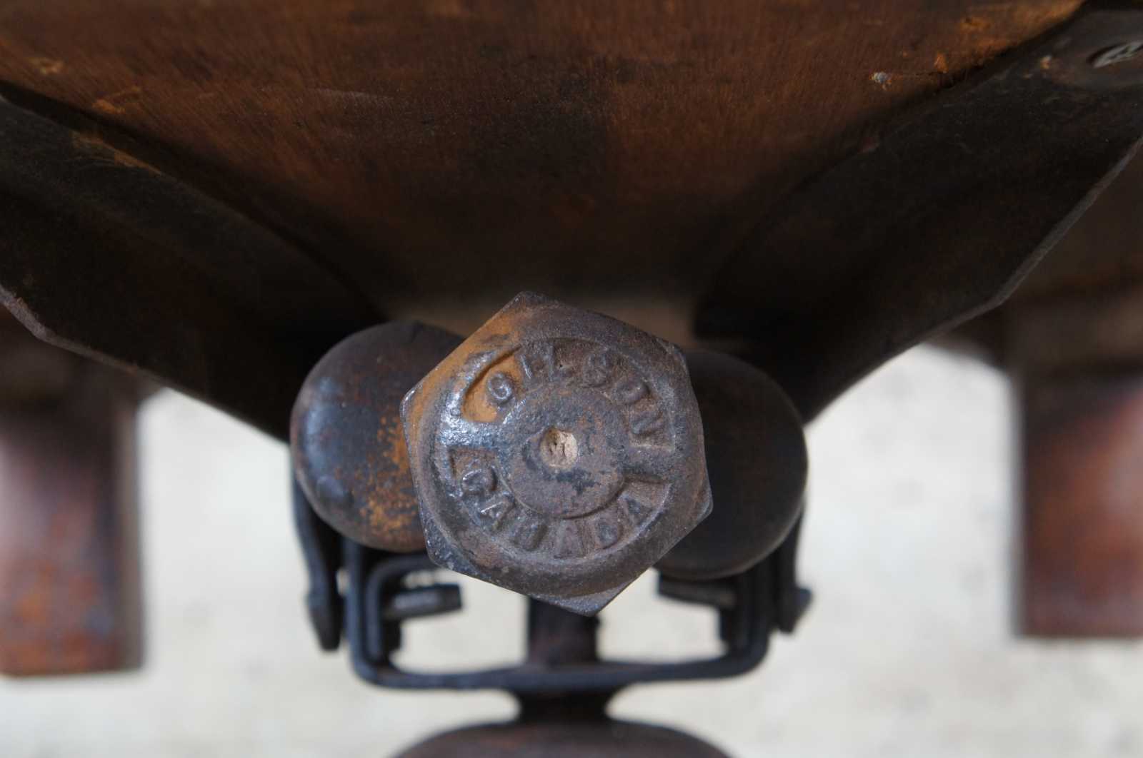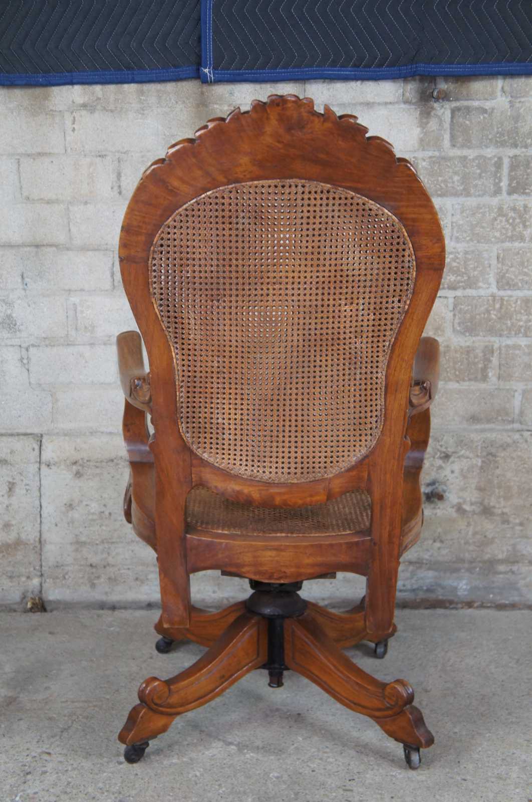 Antique French executive office armchair, circa 1890s. Made of oak featuring carved floral accents, caned seat and double caned back and rolling swivel base. Marked Gilson Canada on industrial base. Sometime before 1900 the company began making chair irons, which is the cast iron piece forming the base center of a swivel chair.
