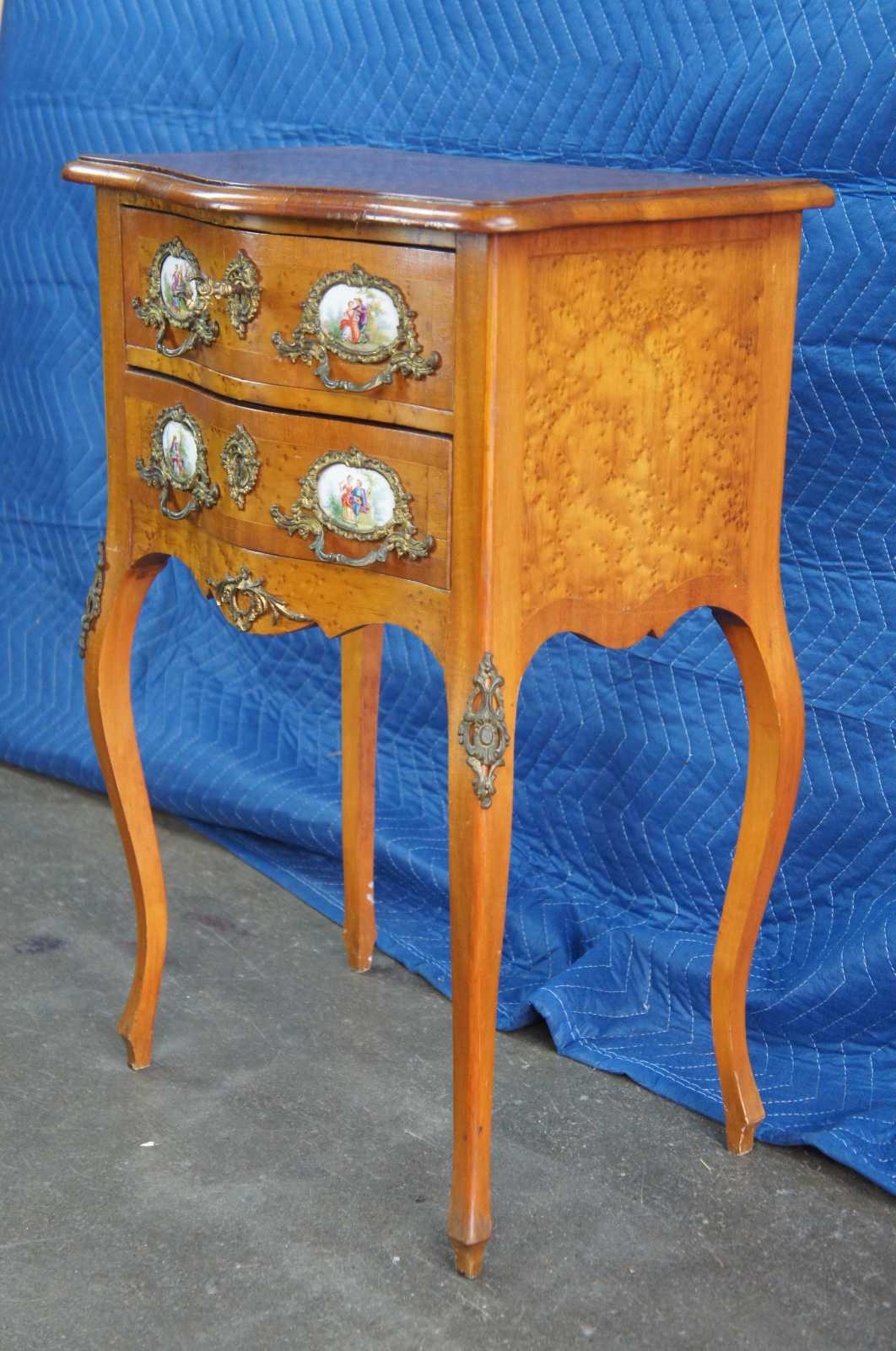 Antique French Louis XV / Napoleon III 2 drawer nightstand or chest, circa last half 19th century. Made of walnut and birdseye featuring serpentine form with two dovetailed drawers, bronze ormolu and classical painted porcelain sevres style plaques mounted within drawer hardware. The chest is supported by long raised cabriole legs. Includes working key.