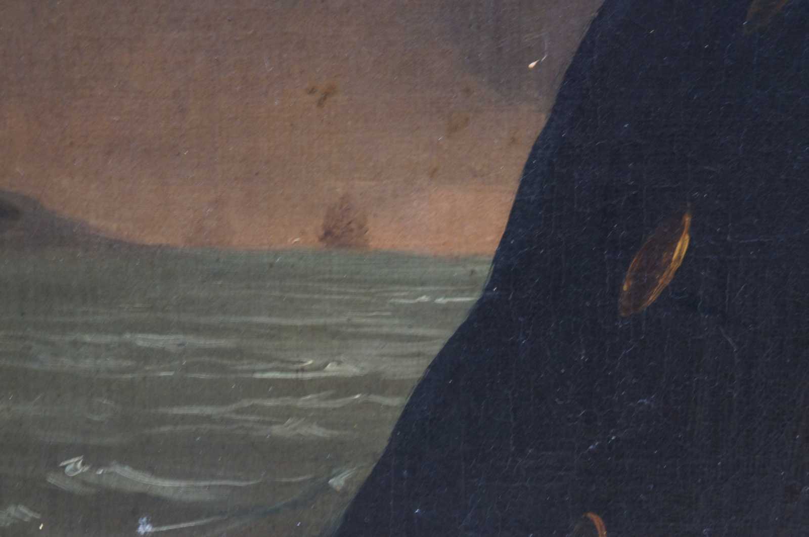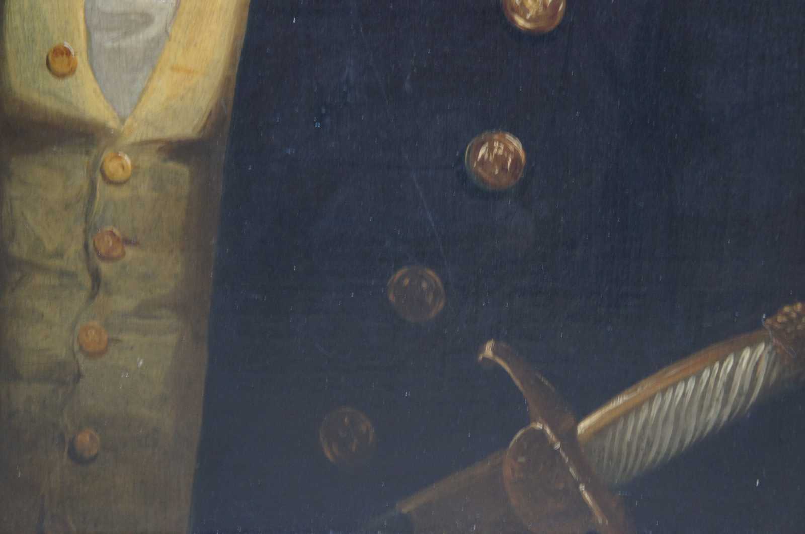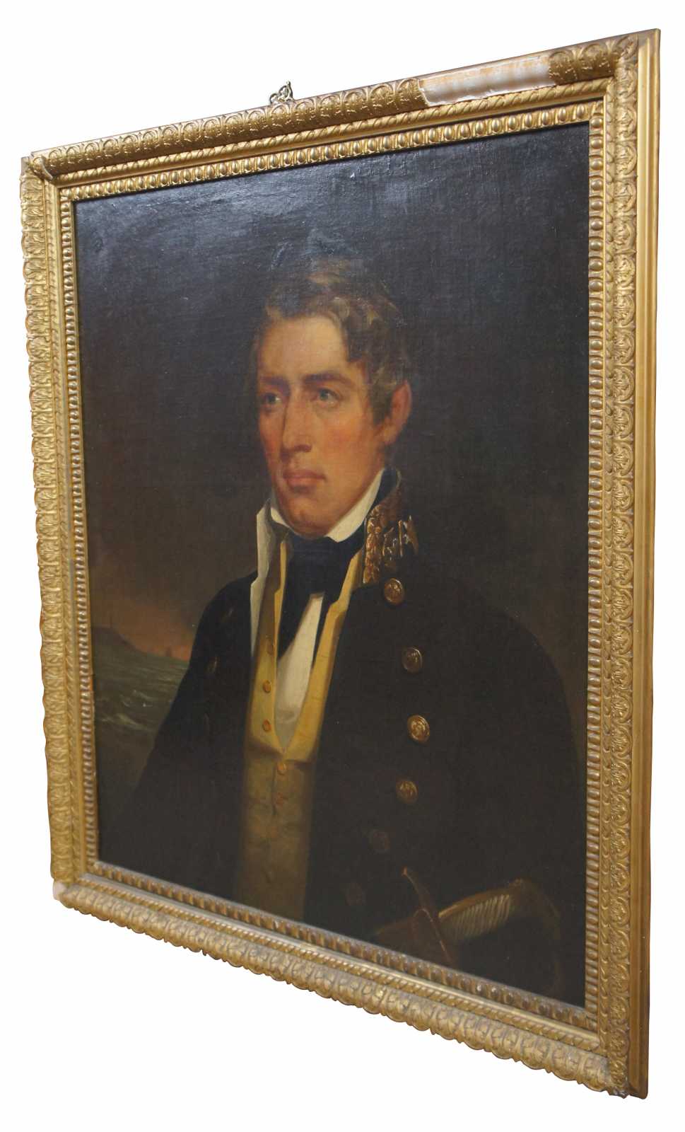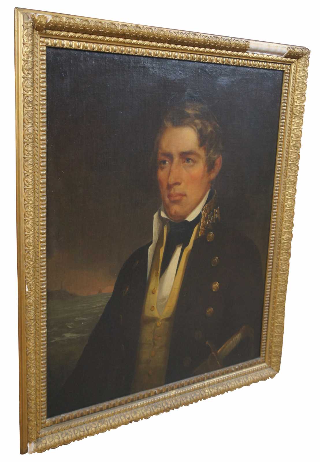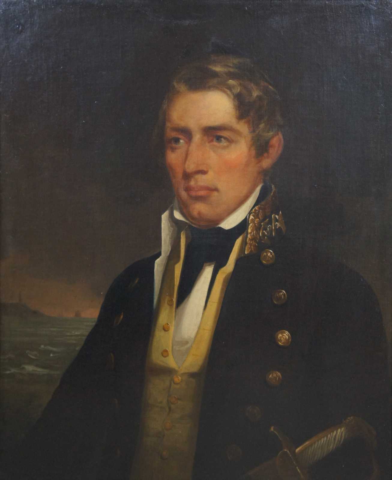 Antique oil on board portrait painting depicting a 19th century naval officer. The gentleman is in front of the sea with boats in the background to the left.