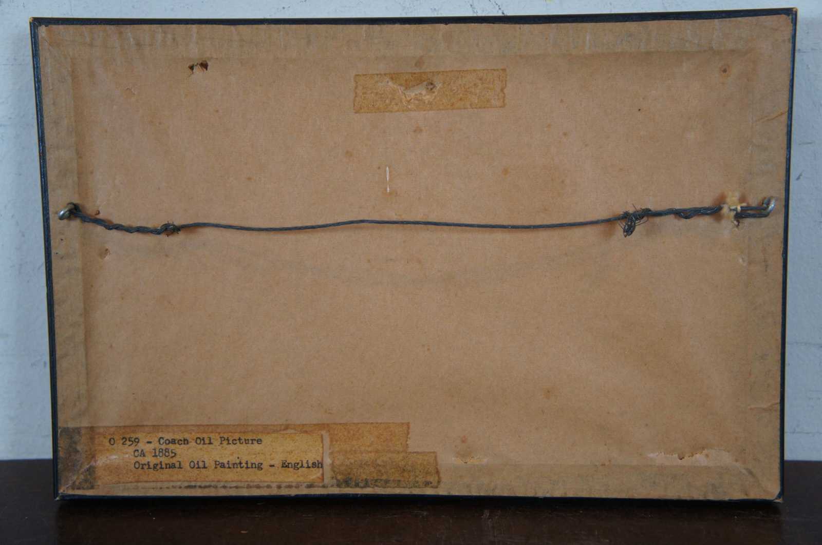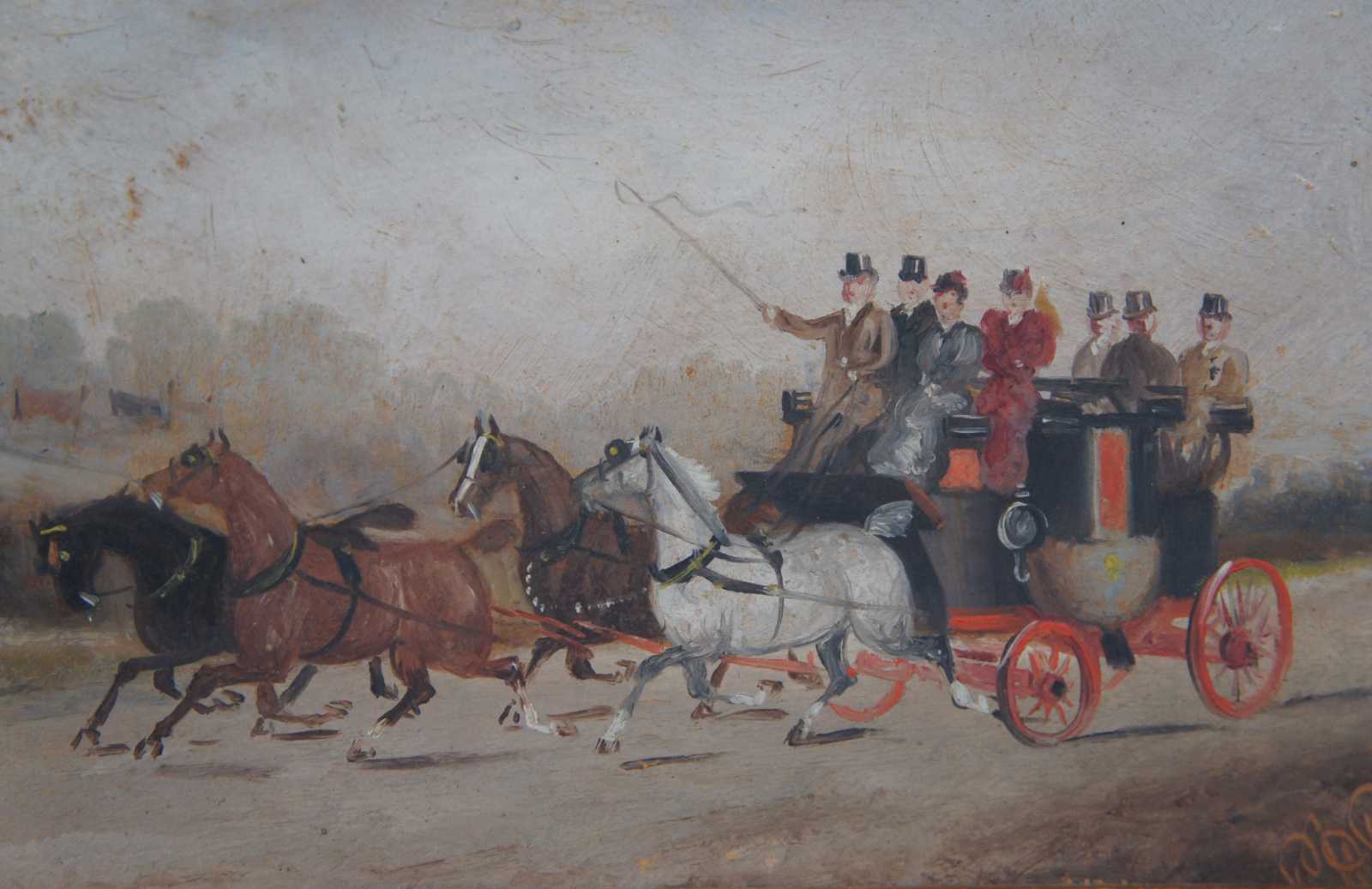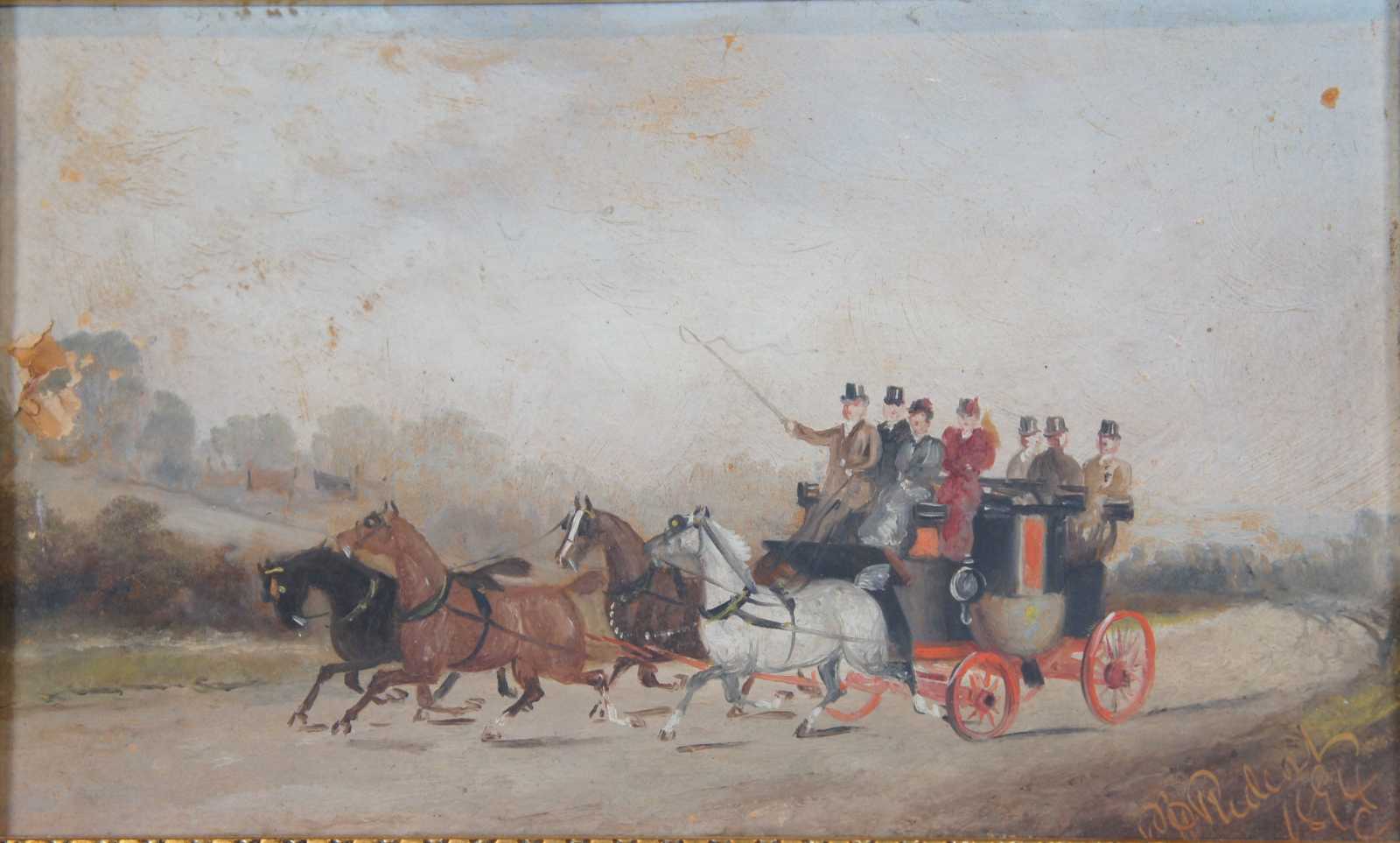 Antique oil painting on canvas painting showing a landscape of a road being traversed by a full stagecoach pulled by a team of three horses, with men / women dressed in formal attire. Signed in lower corner and dated 1894 (although the label on the back indicates circa 1885).