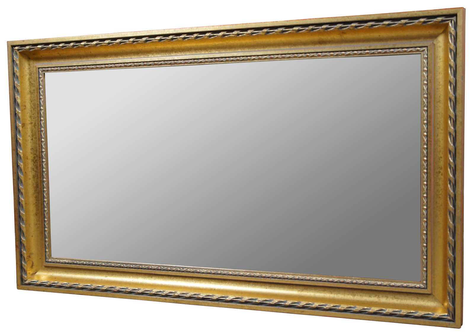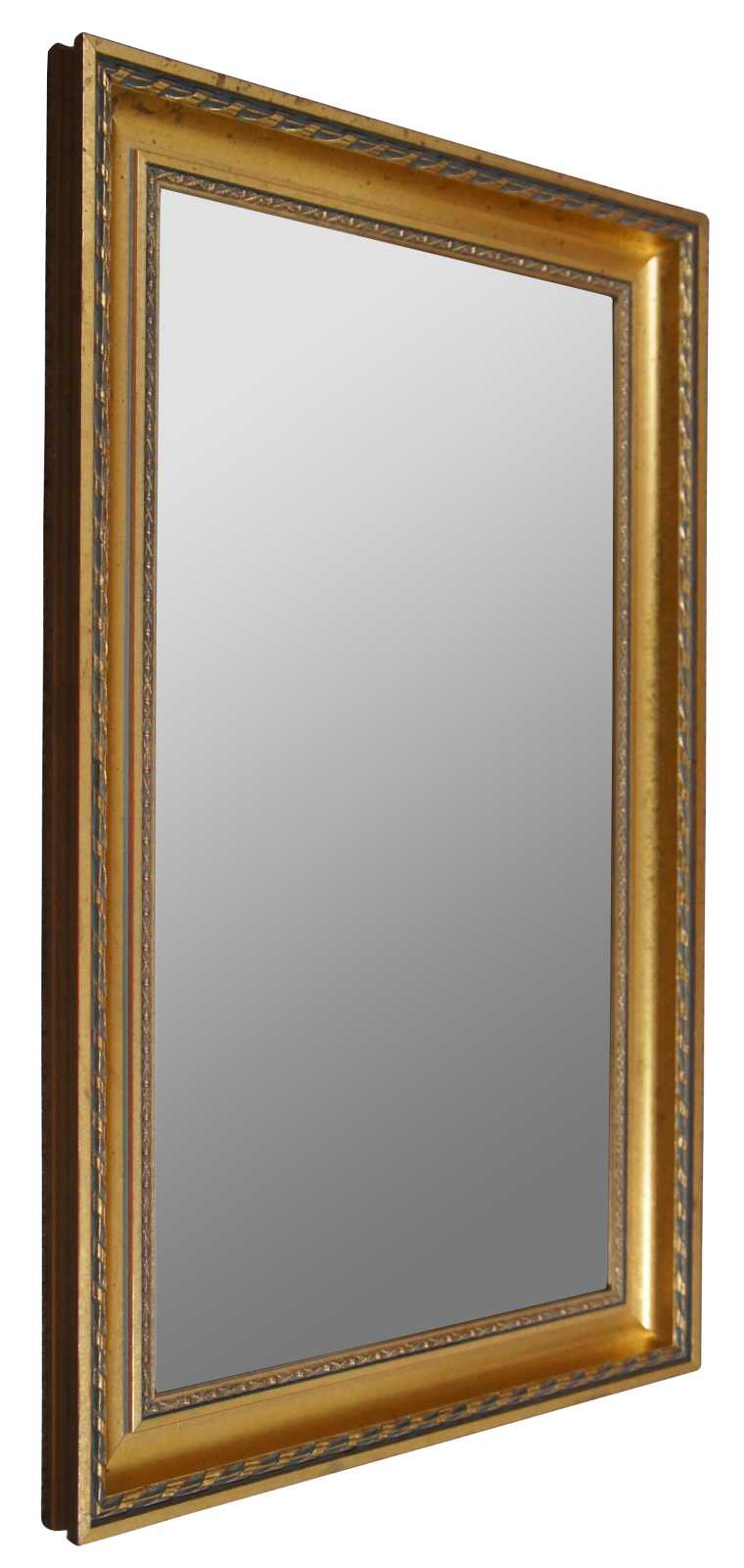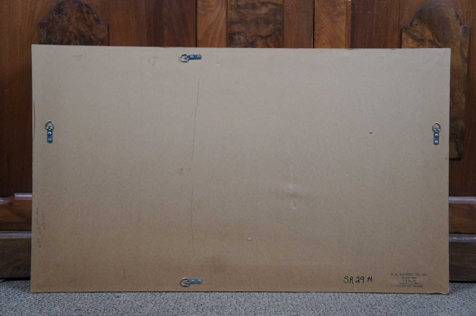 Hollywood Regency or Louis XV style gilt wood wall mirror by the H.A. DeNunzio Company. Features a recctangular frame with ribboned trim outside of a french inspired X patterned trim and beveled glass mirror.