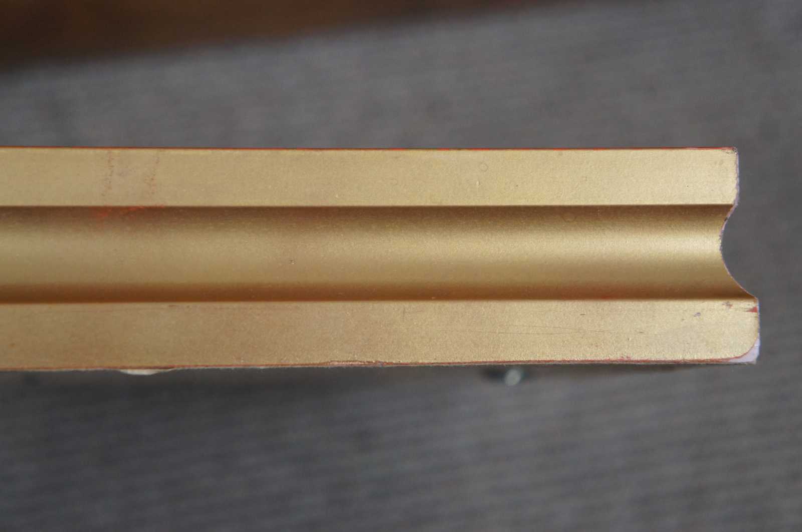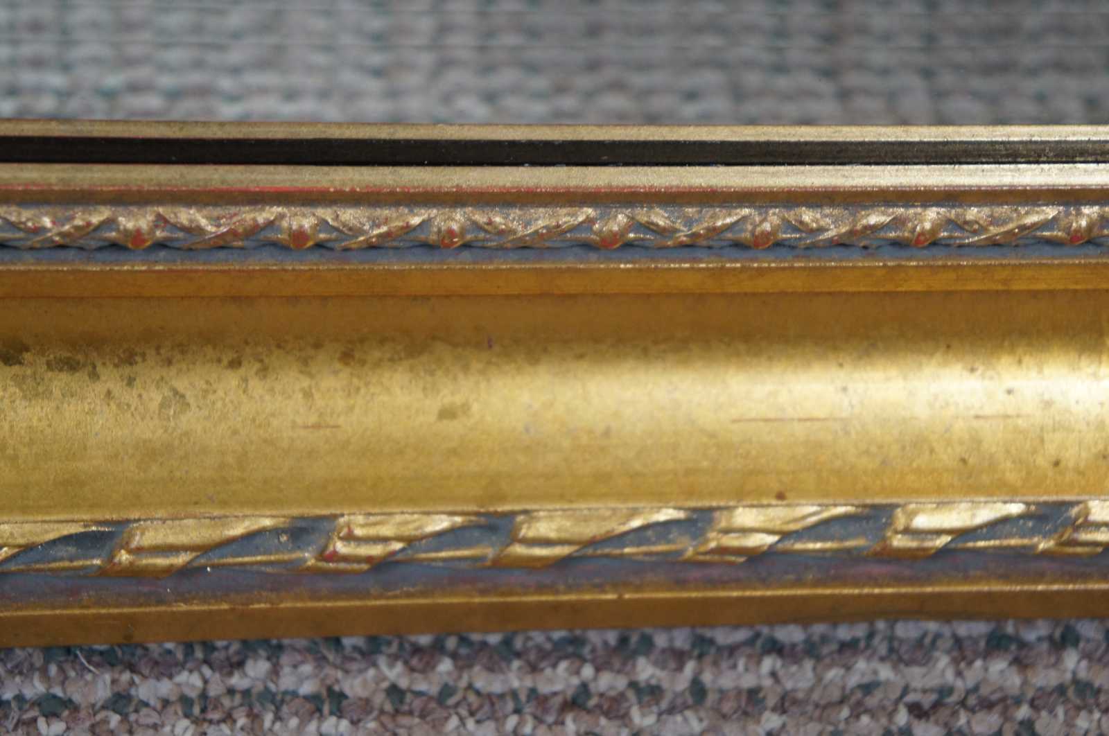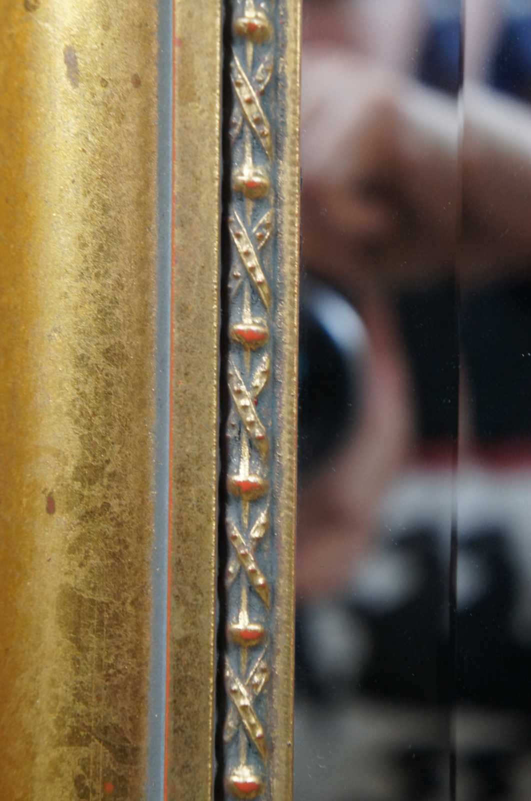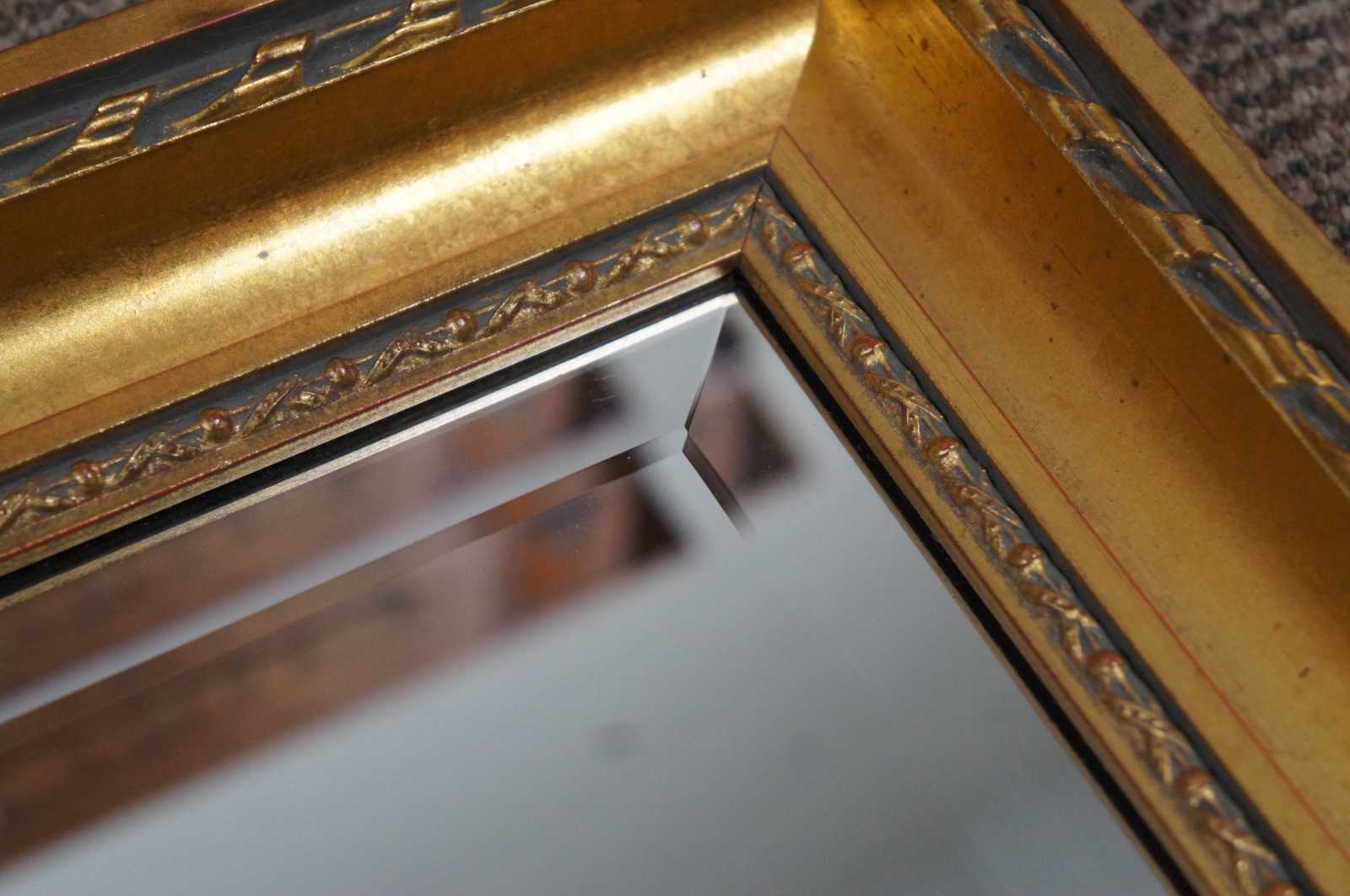 Hollywood Regency or Louis XV style gilt wood wall mirror by the H.A. DeNunzio Company. Features a recctangular frame with ribboned trim outside of a french inspired X patterned trim and beveled glass mirror.
