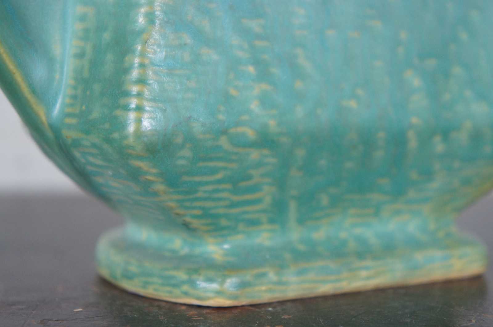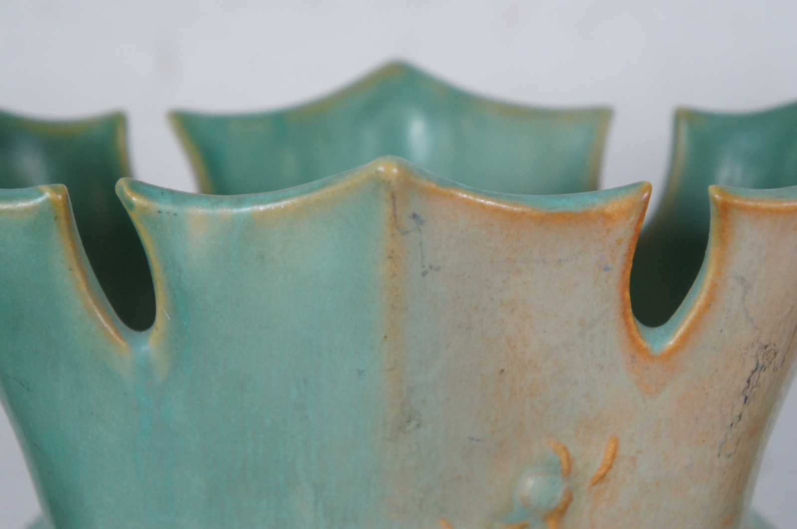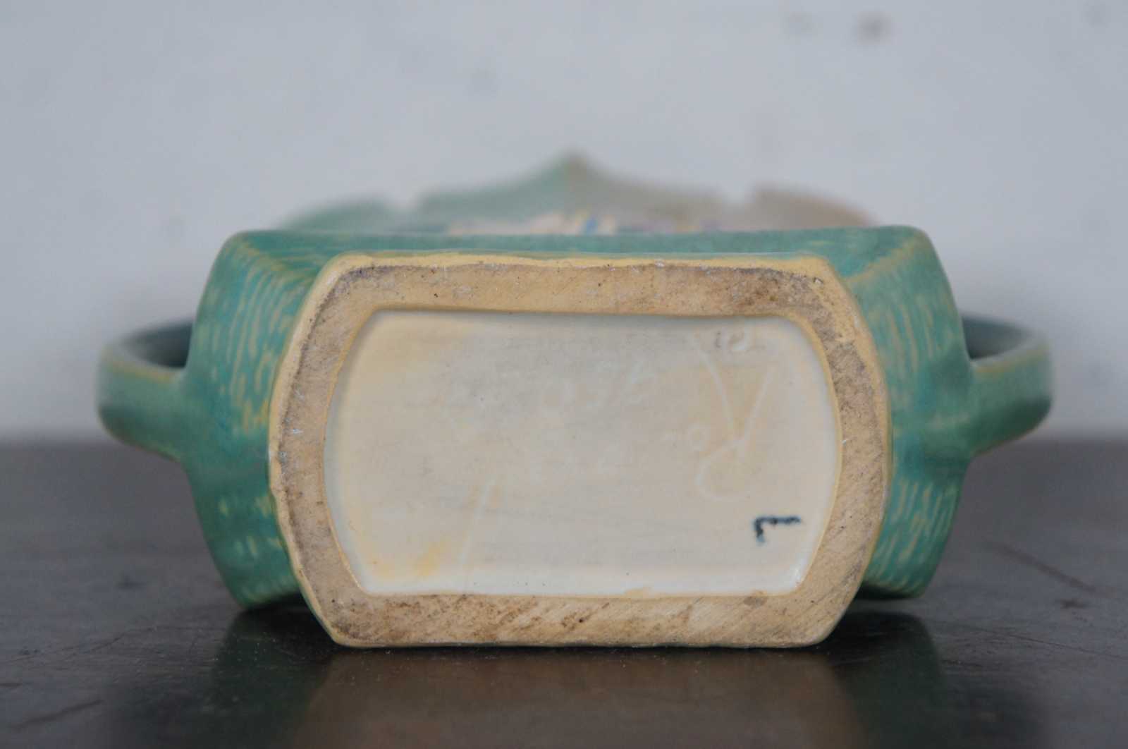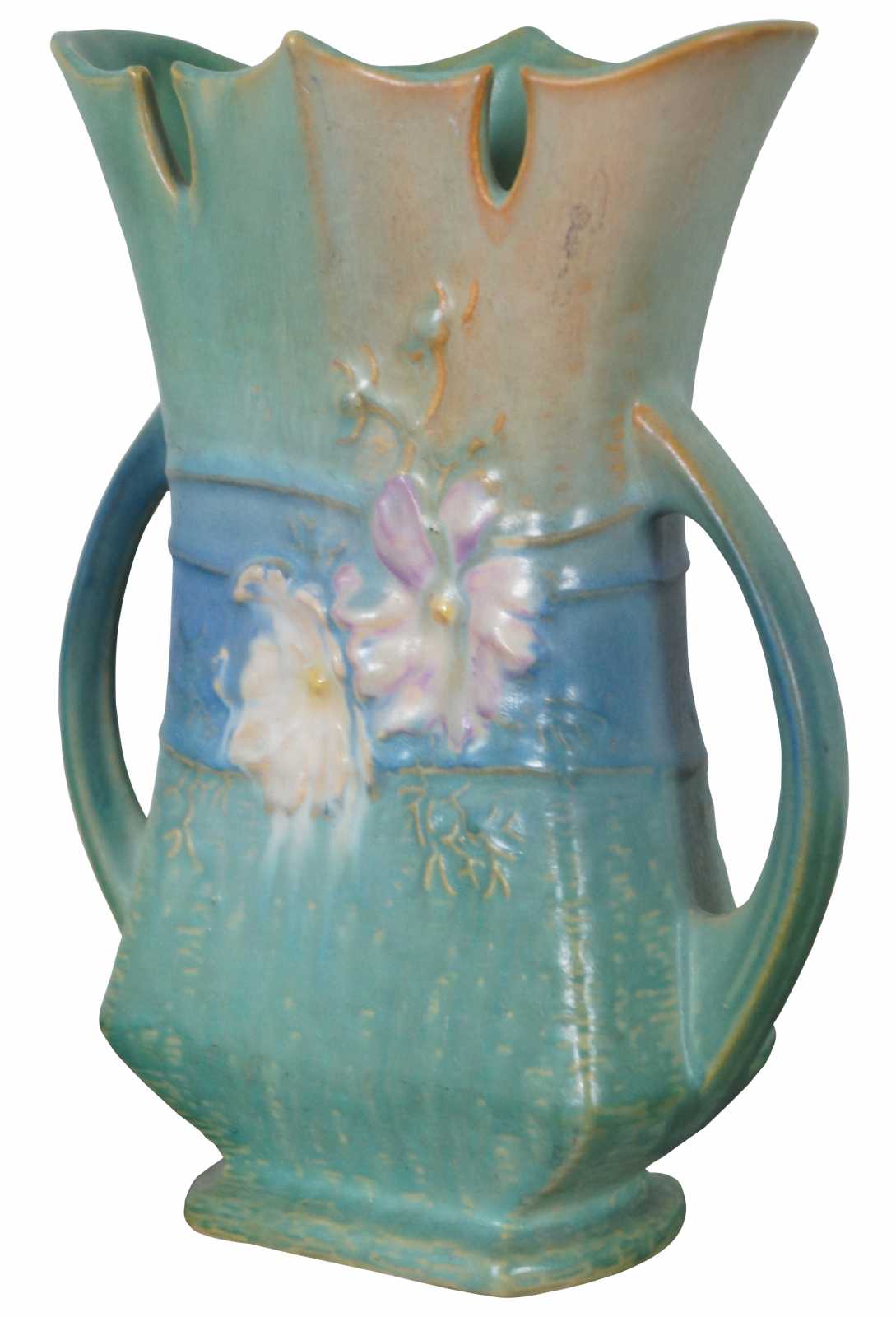 Antique early 1940s Roseville art pottery double handled Cosmos vase, model 950-8, in green and brown with a blue band decorated with flowers.