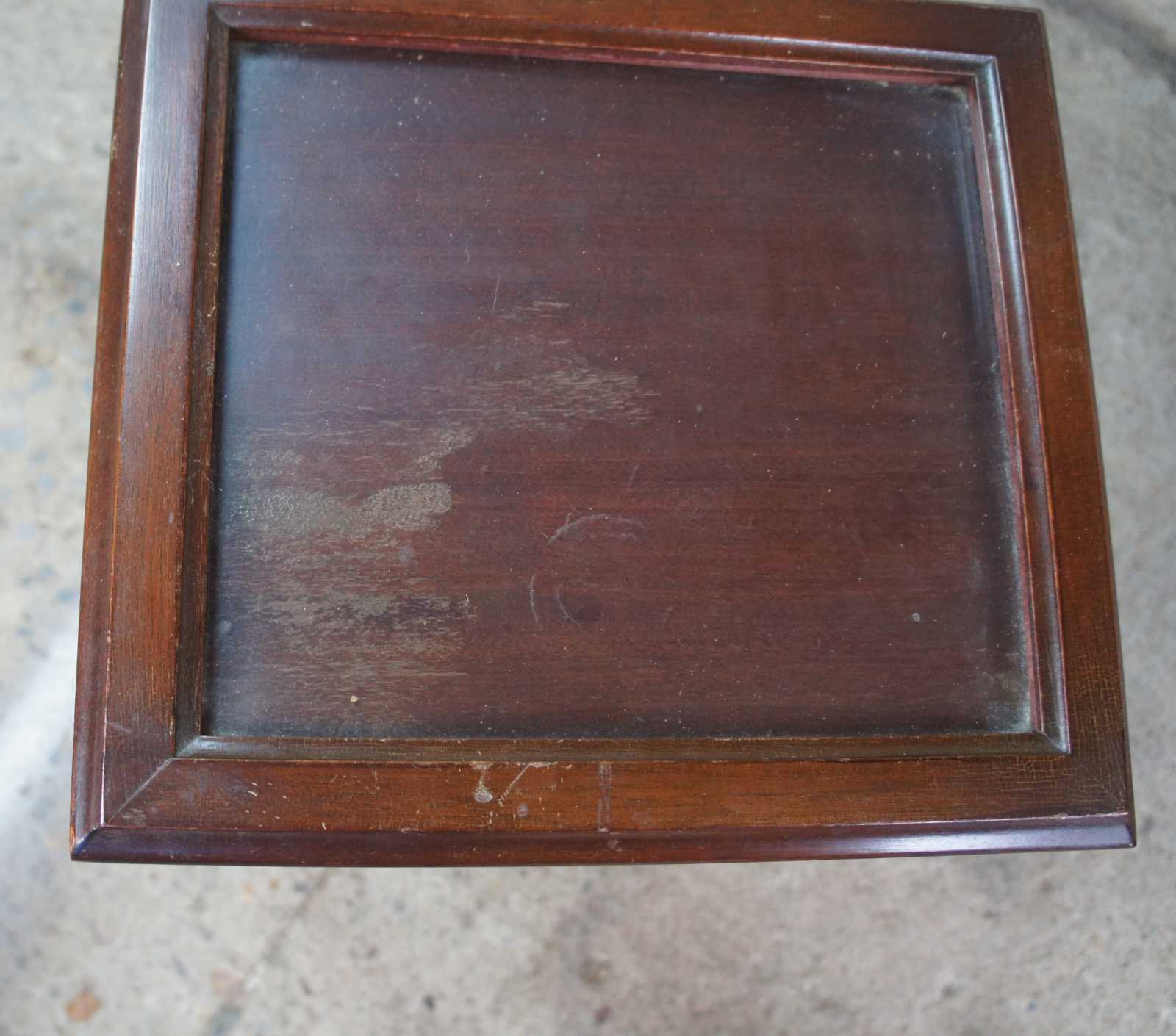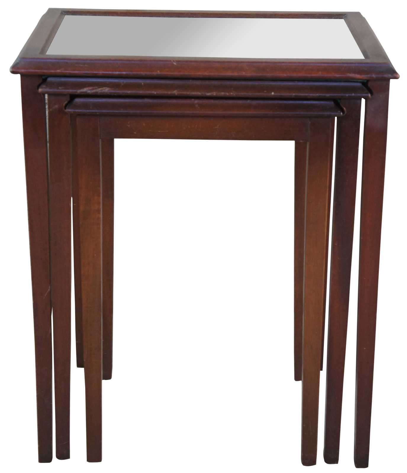 Nest of three antique Ferguson Bros Mfg Co side tables. Made of mahogany featuring a ogee edge, tapered legs, and glass tops. 5484.