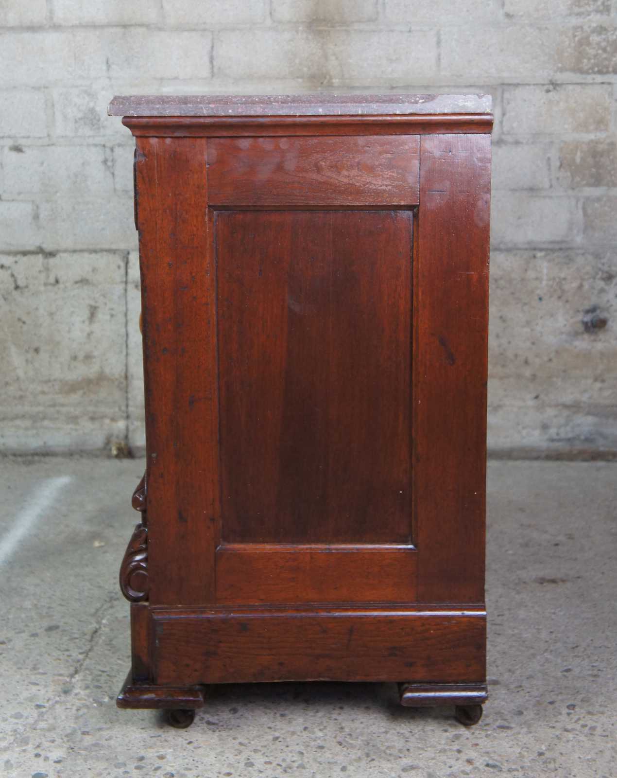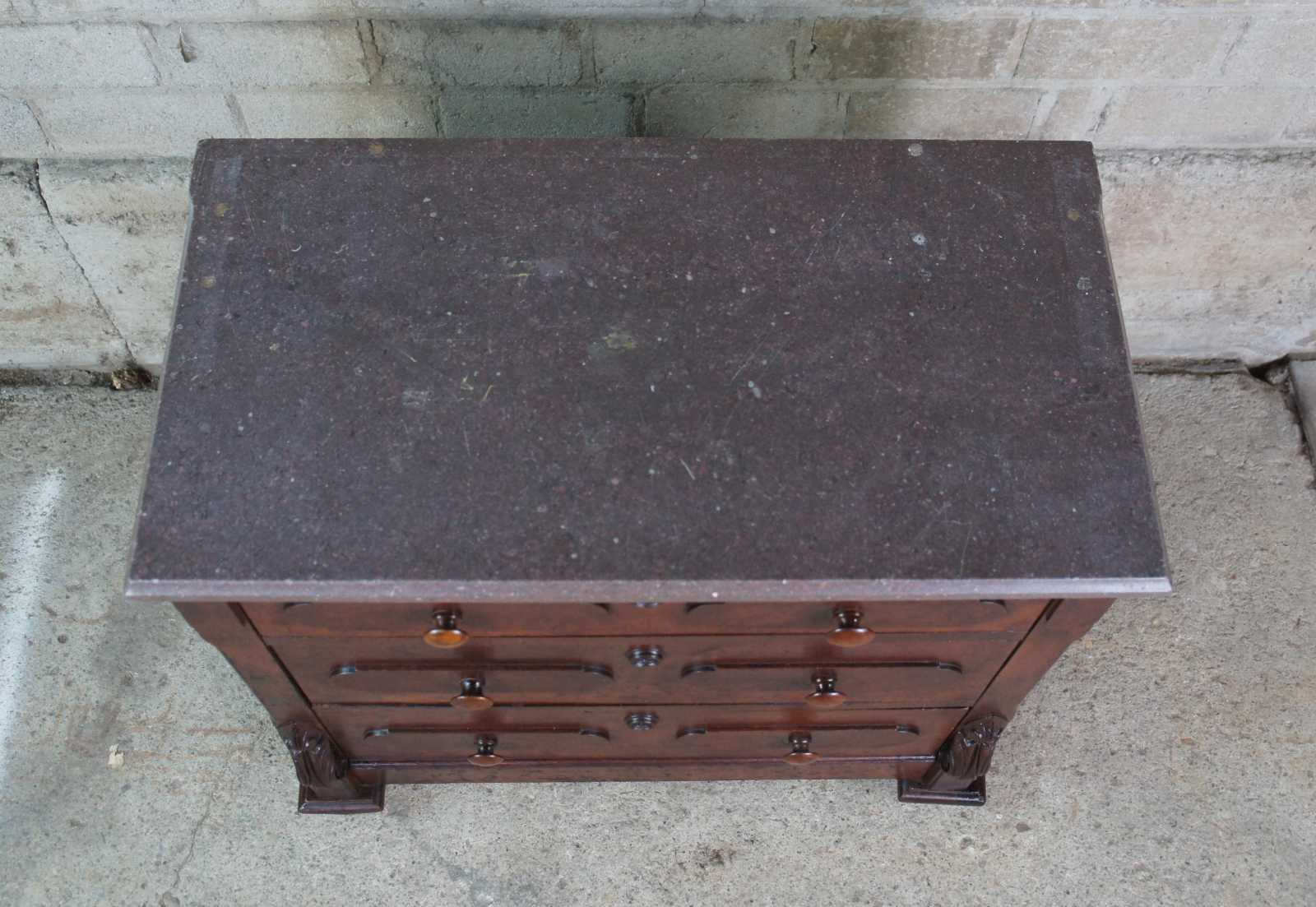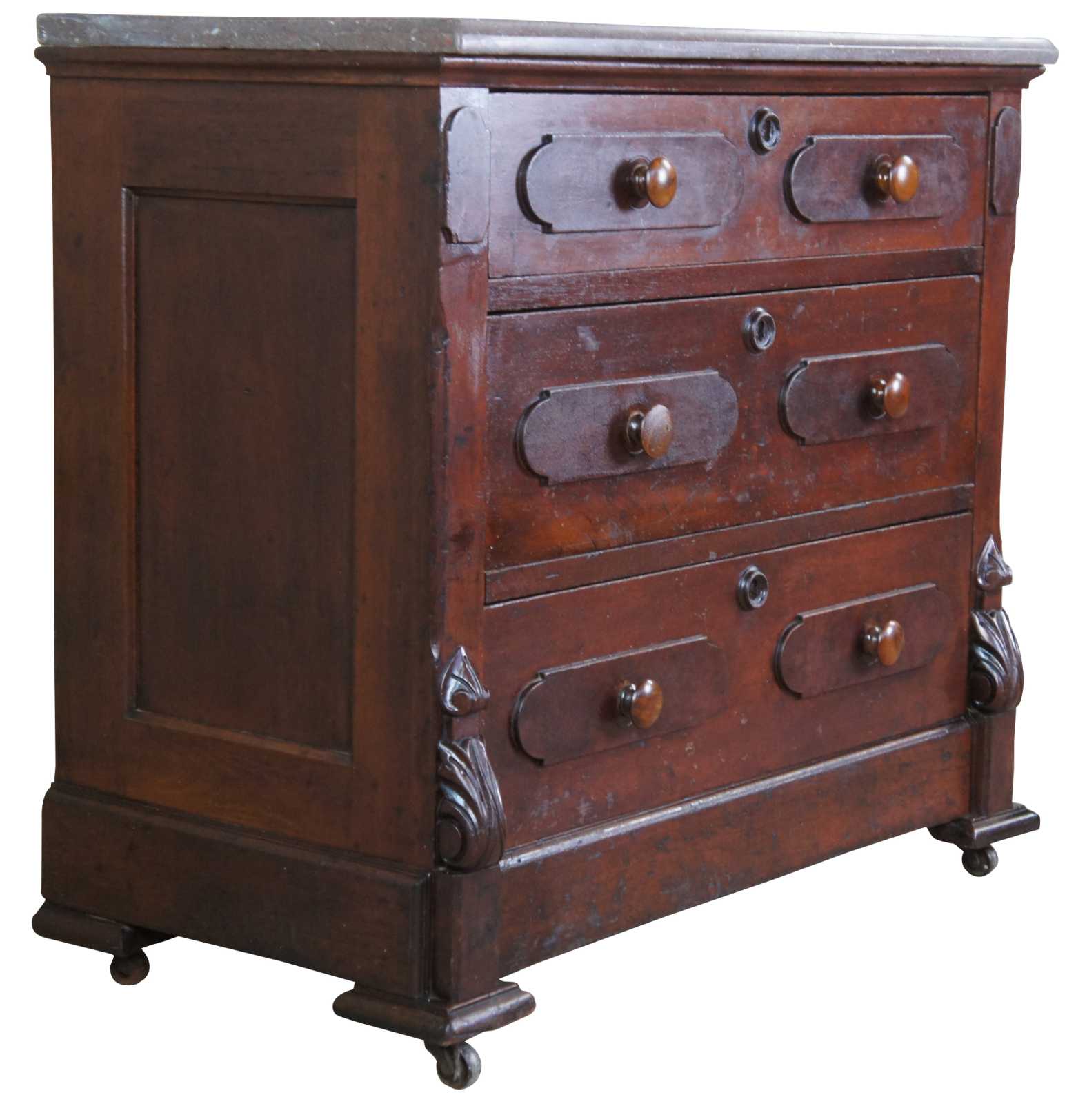 Antique Victorian Eastlake dresser or chest of drawers. Made of walnut featuring three (3) drawers with raised burled panels, turned knobs, acanthus carved accents, and granite top over square feet with castors.