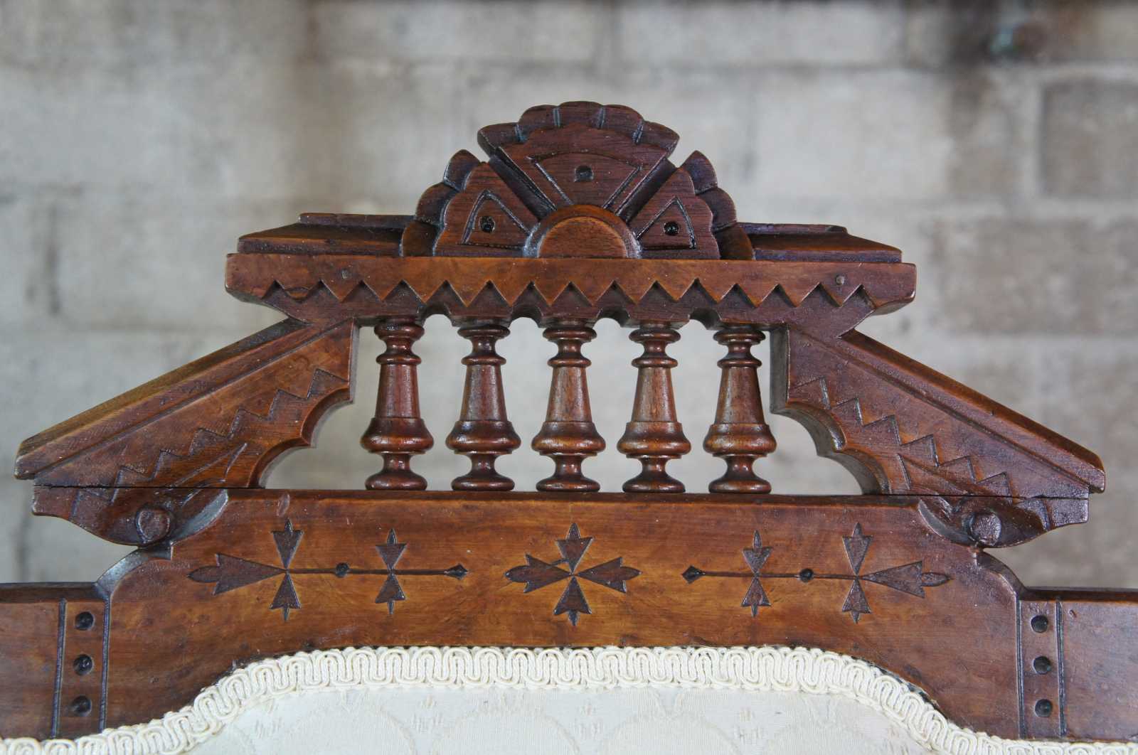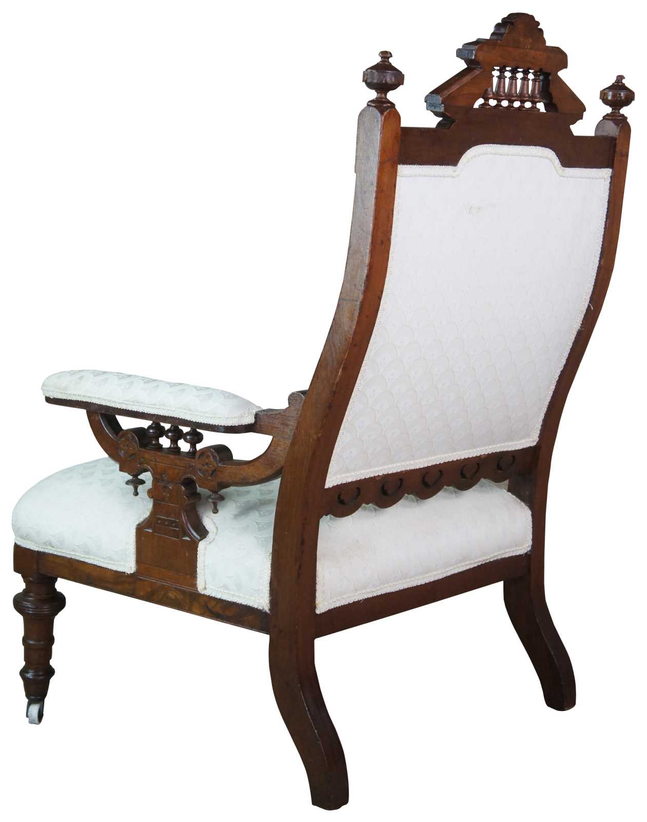 19th Century Victorian parlor armchair. Made of walnut with carved Eastlake and burled accents that features ornate reticulated floral, turned and fluted accents, with finials and casters.